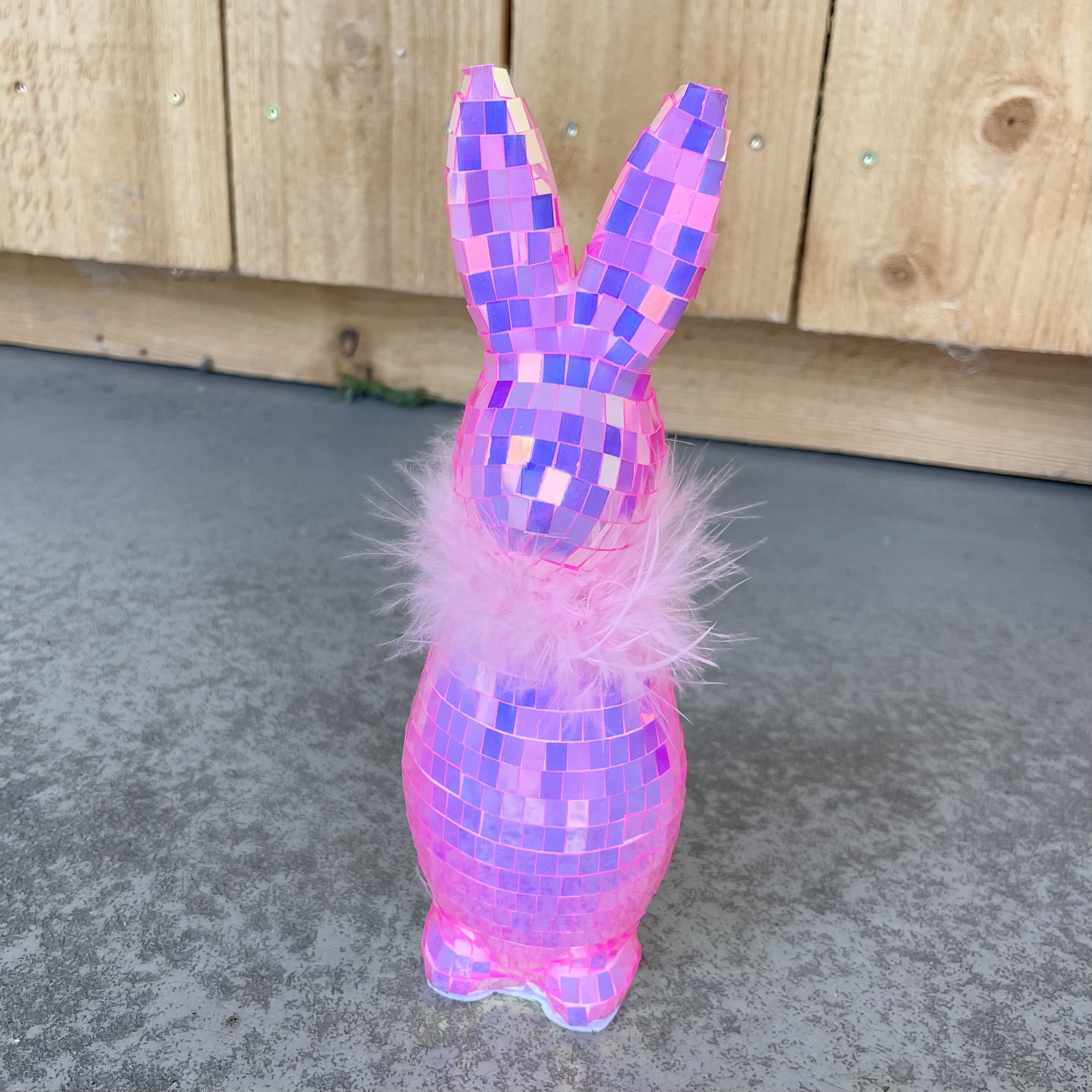 Mega cooler neuer Hase im Dubai Disco Feeling. Kleine irisierende, viereckige Klebepartikel überziehen den Styropor Körper, er ist leicht und am Hals fedrig mit Schal. Ersatz-Klebestücke als Streifen liegen der Verpackung bei. Für mich ein absolutes must have und Highlight, damit glänzt du, nicht nur der Hase (-,