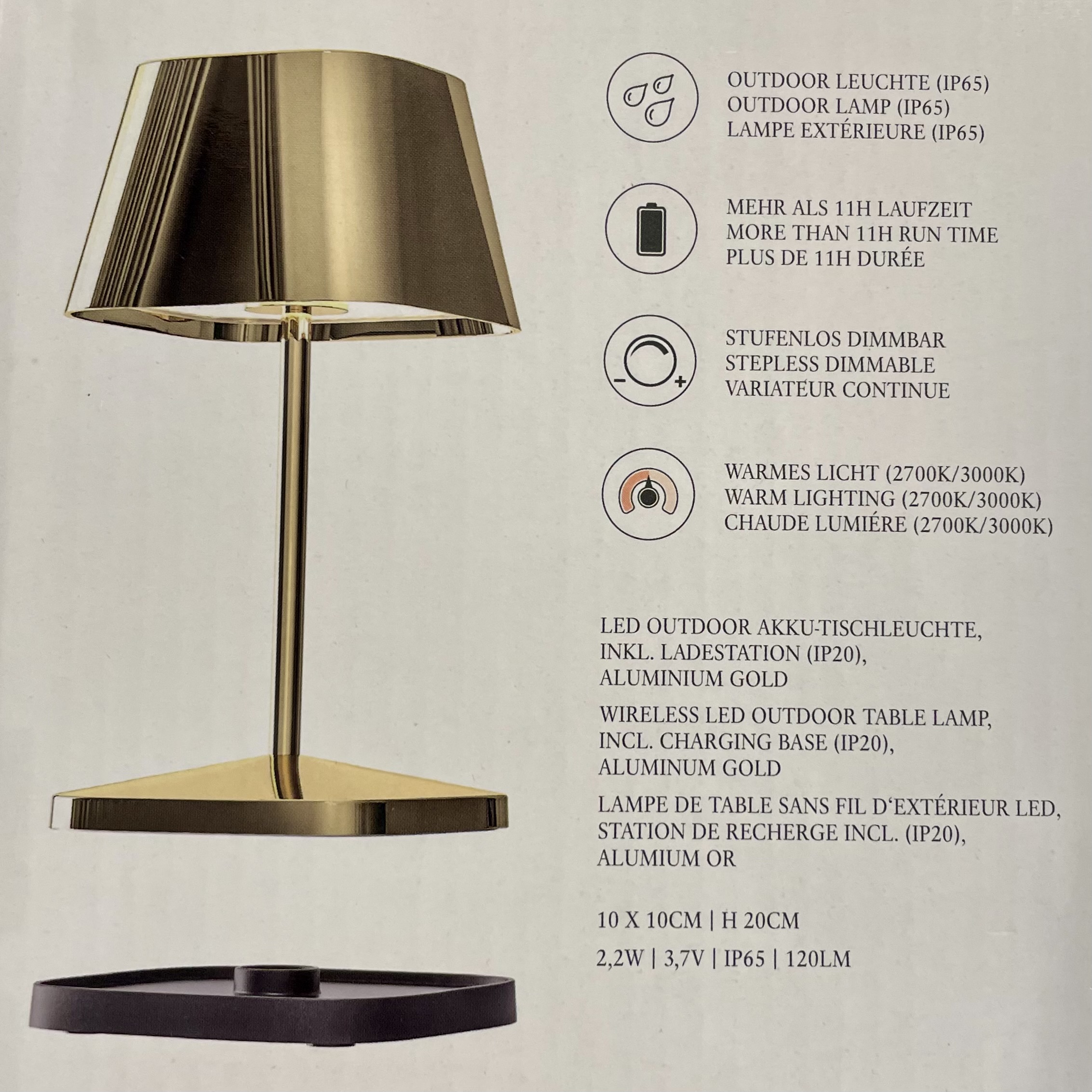 Kleine Indoor- und Outdoortischleuchte aus Aluminium, dimmbar, akkubetrieben, Gesamtleuchtzeit bei voller Ladung des Akkus max.79h, zwei Farbtemperaturen (2700K und 3000K), Ladestation anbei, 2,2 Watt, LED, 250lm