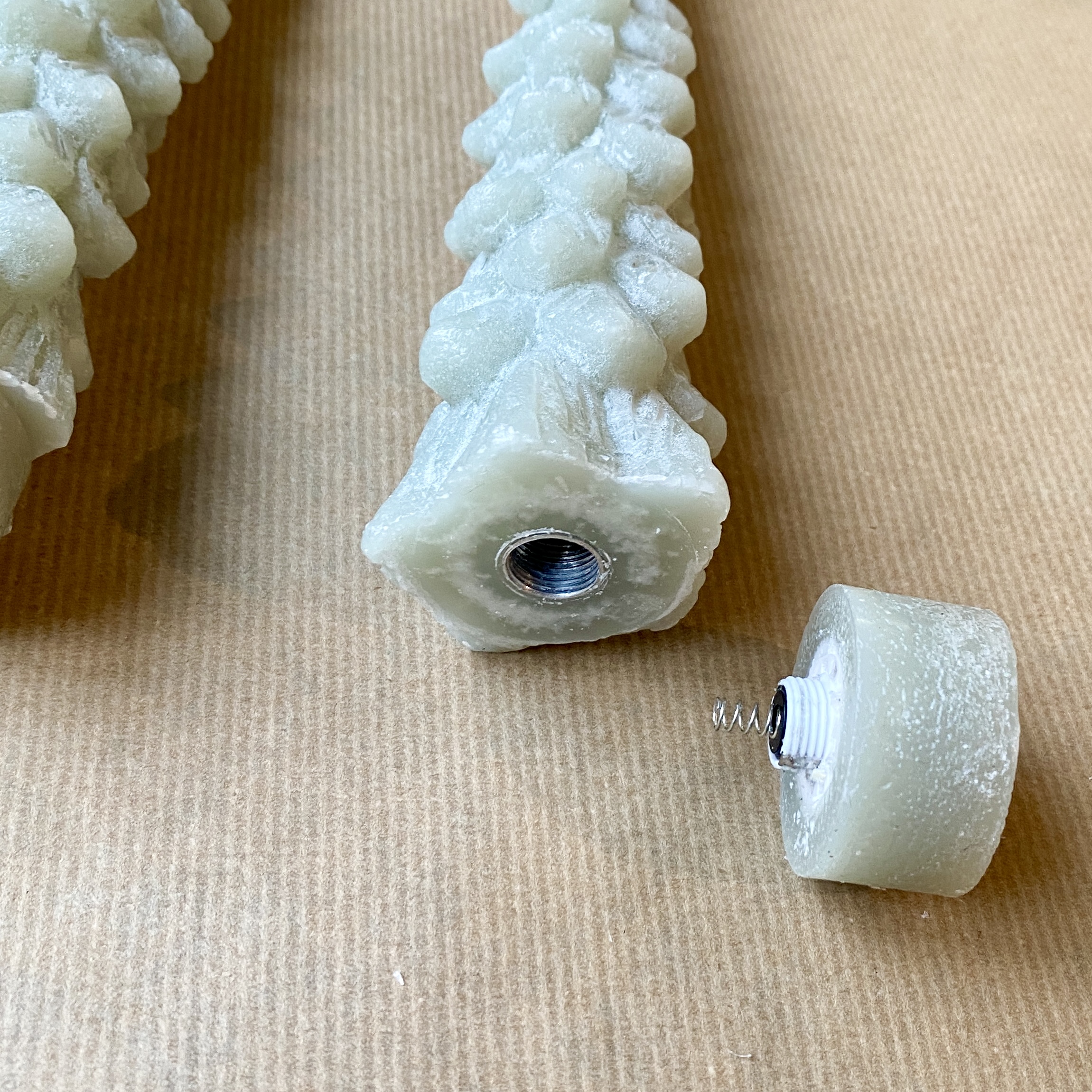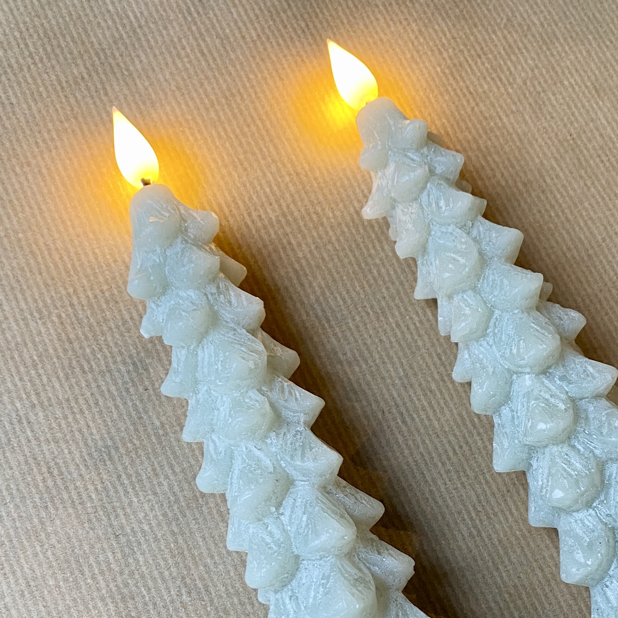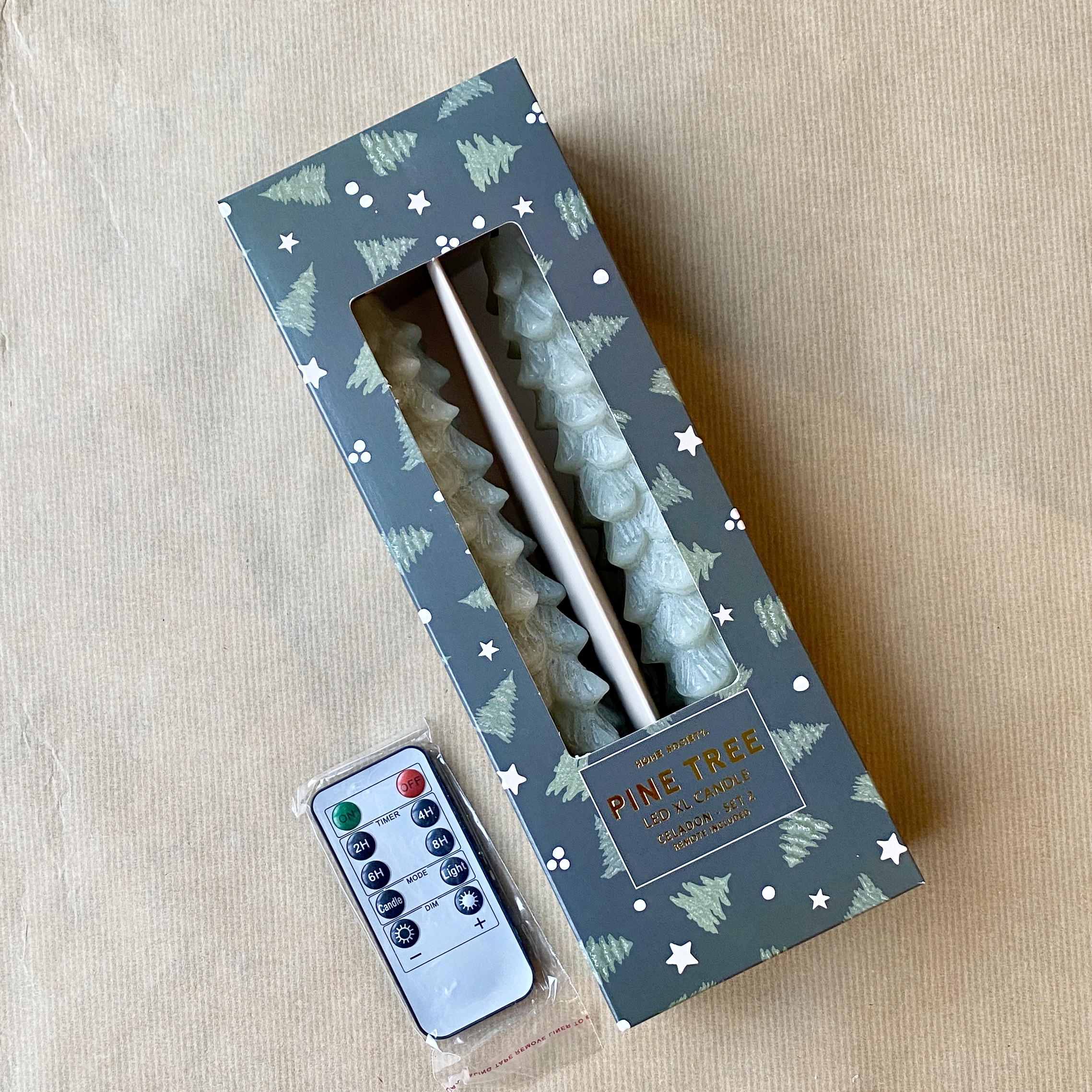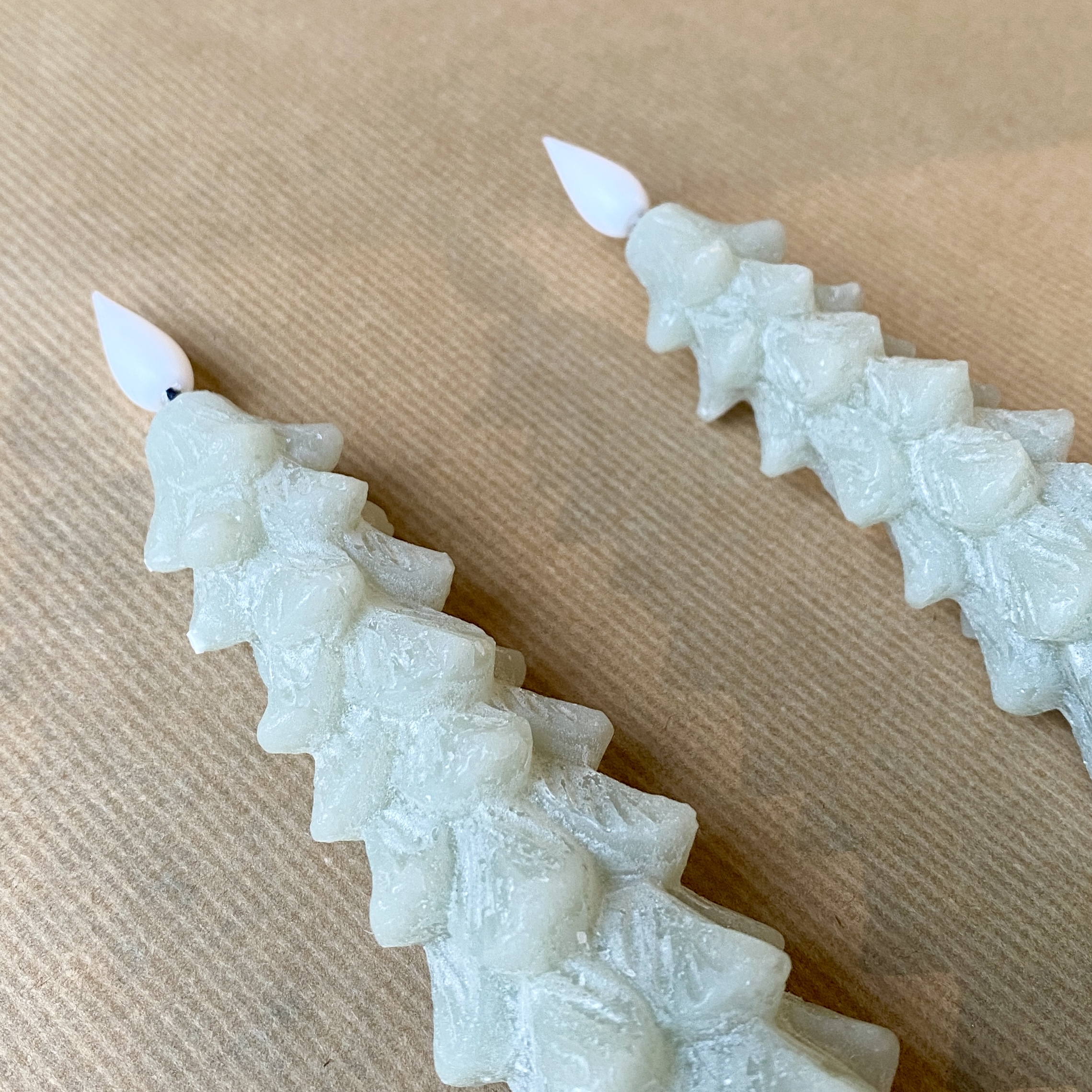 LED Kerzen Set aus Wachs in der Optik eines Pinienbaumes in Celadon (Mintgrün). Jede Kerze muss mit 2 Batterien a 1,5V bestückt werden. Eine Fernbedienung mit Timer liegt dabei.