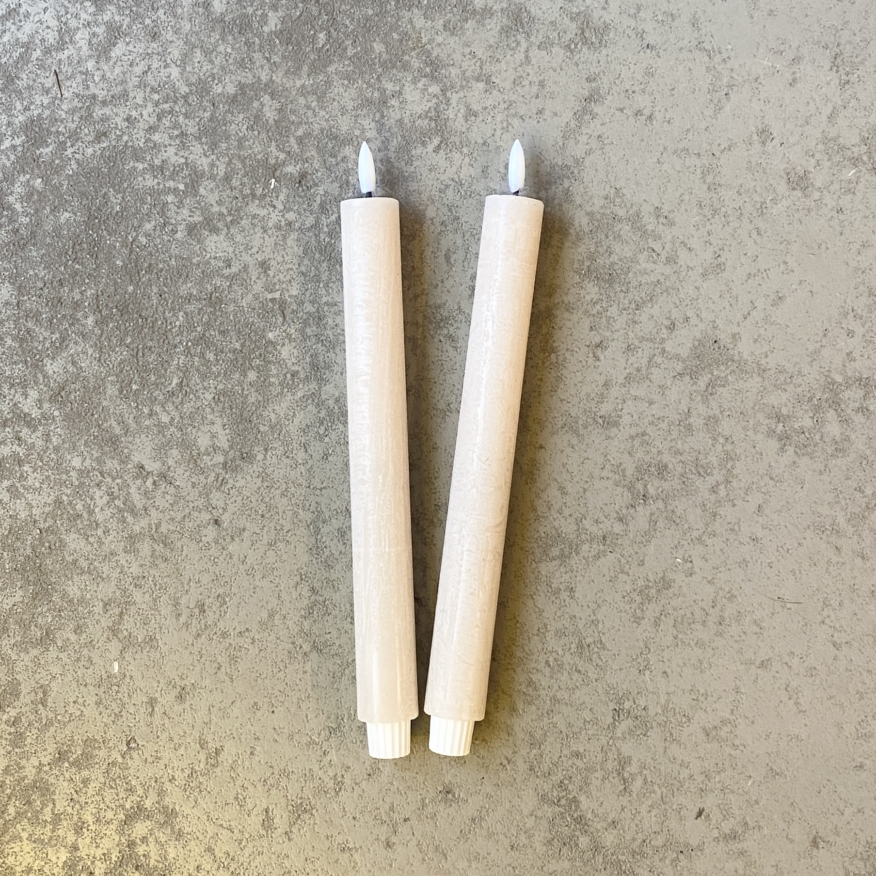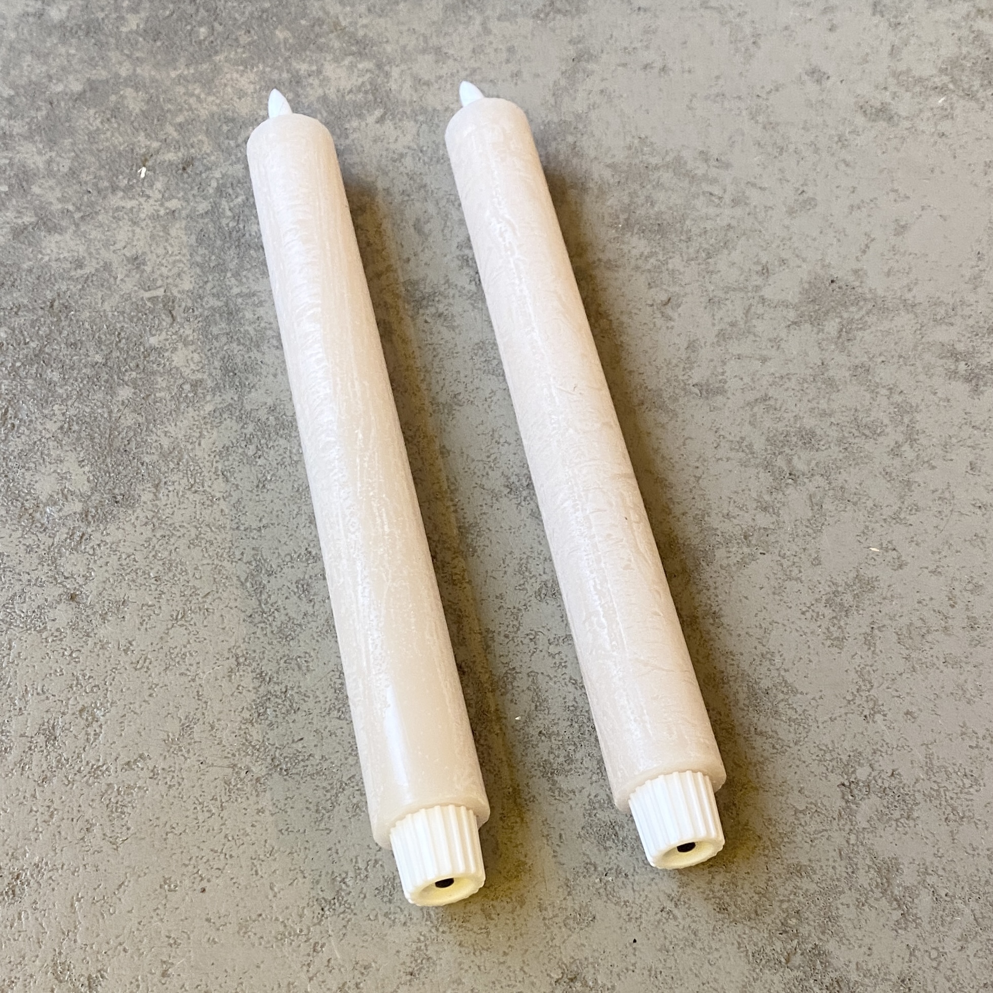 2er Set Stabkerzen in der Farbe Beige 29cm hoch mit Timerfunktion. Jede Kerze muss mit einer 1,5V Batterie AAA bestückt werden.