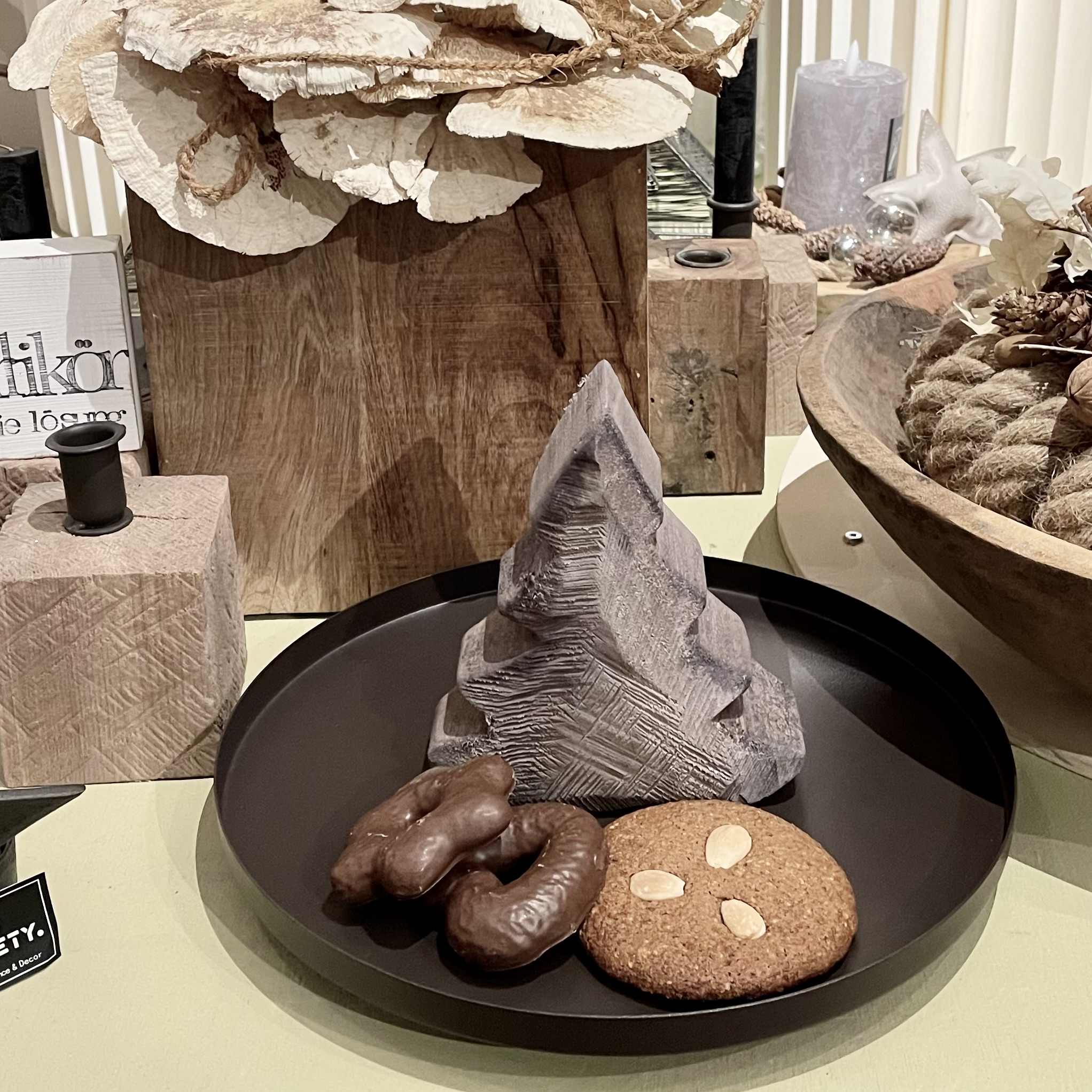Diese Etagere ist ein echter Blickfang zu Weihnachten. Ob Plätzchen, Mandarinen oder Nüsse, mit dieser Etagere auf dem Tisch wird alles zum Highlight. Metallteller auf Kugelfüßen mit Holztanne sägerauh verschraubt.