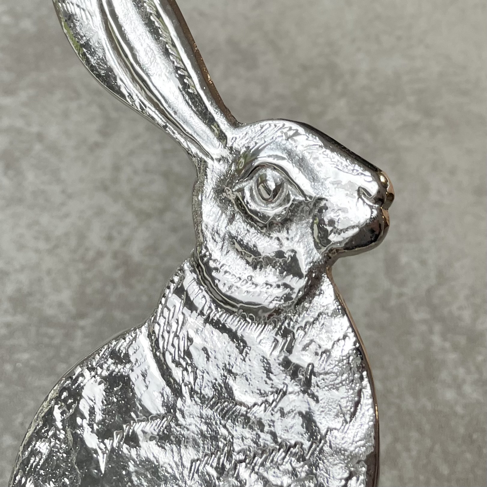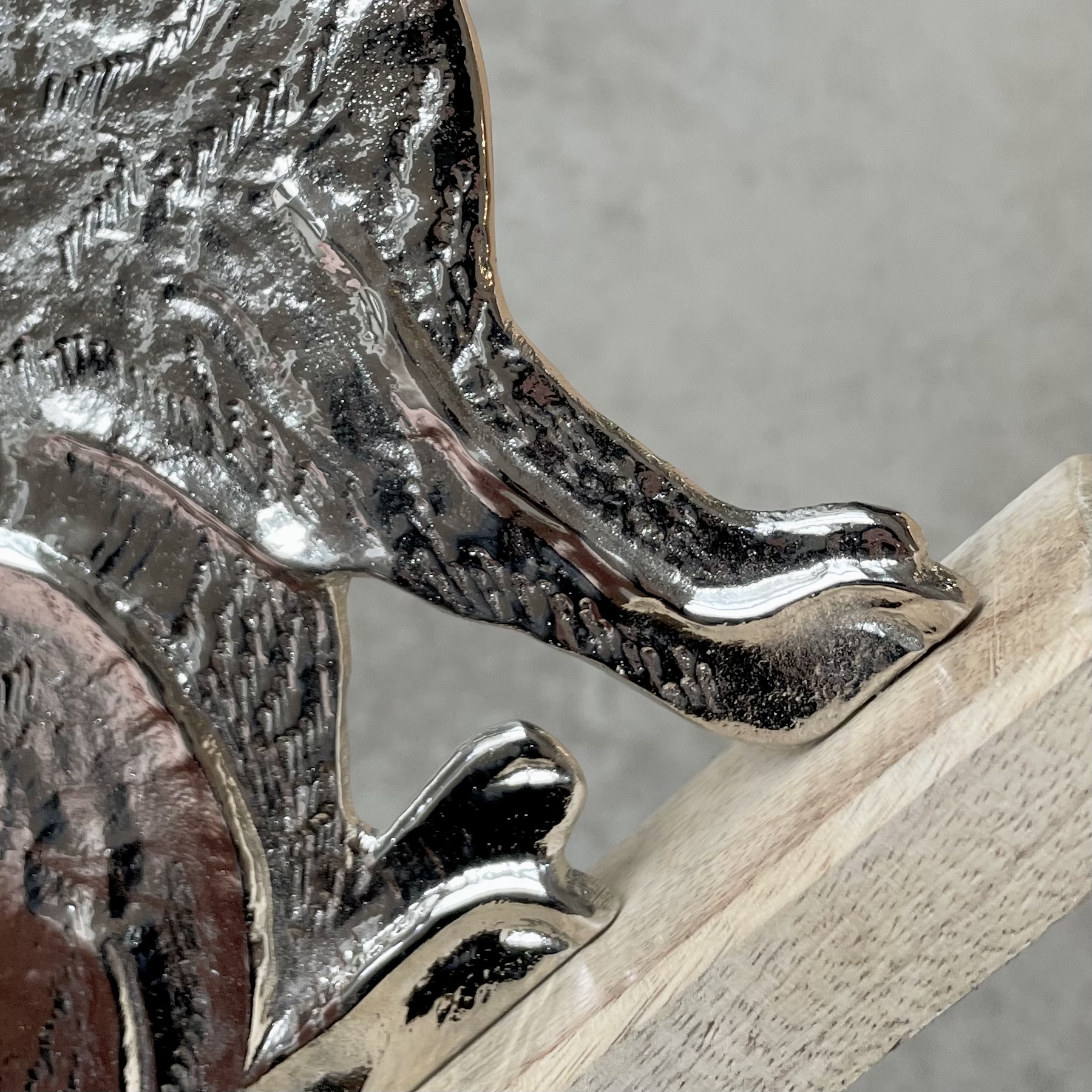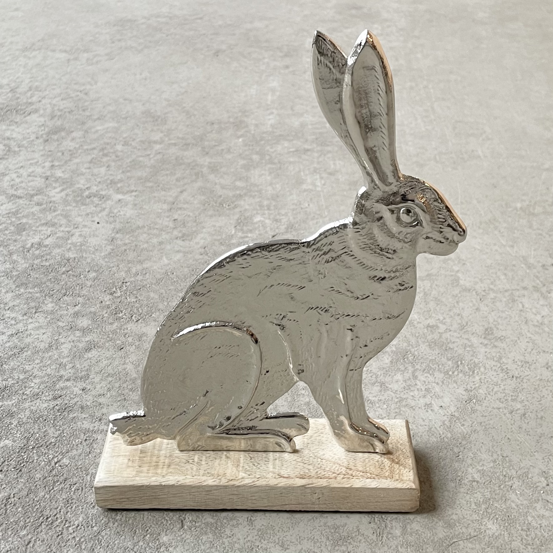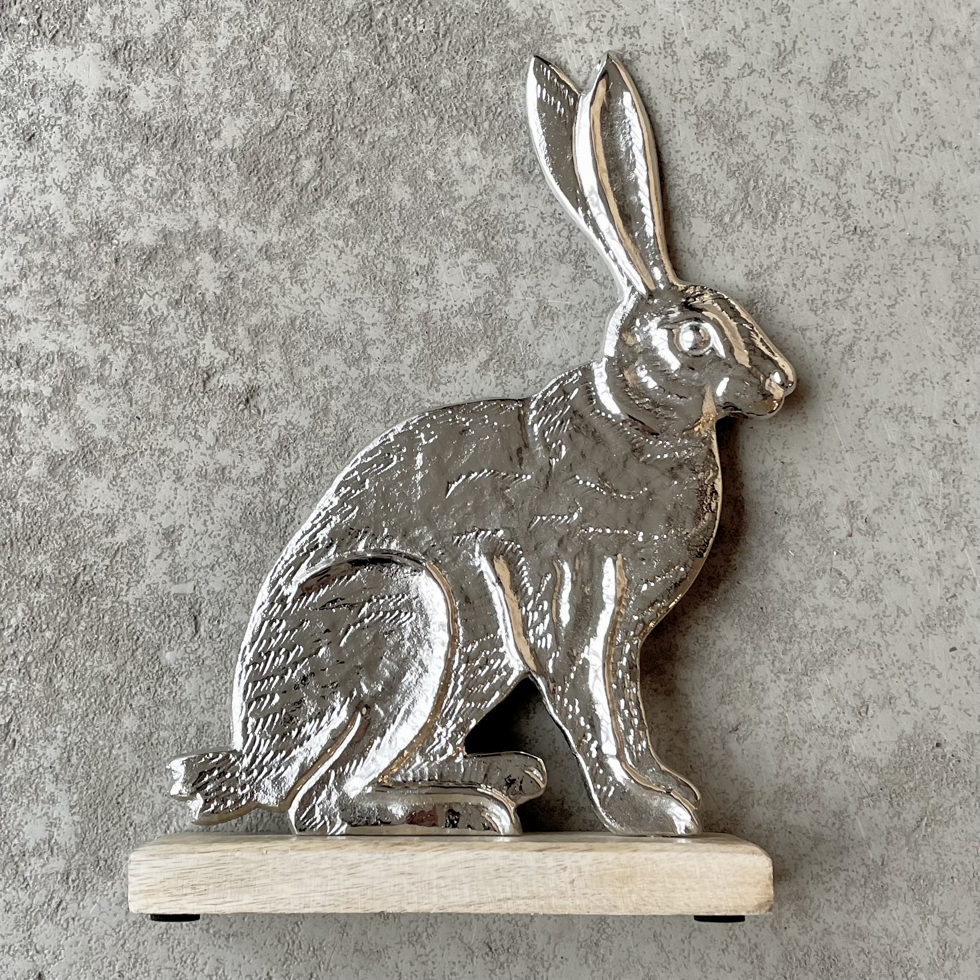 Metallhase auf Holzsockel "Kopf rechts" natur/silber, H25cm