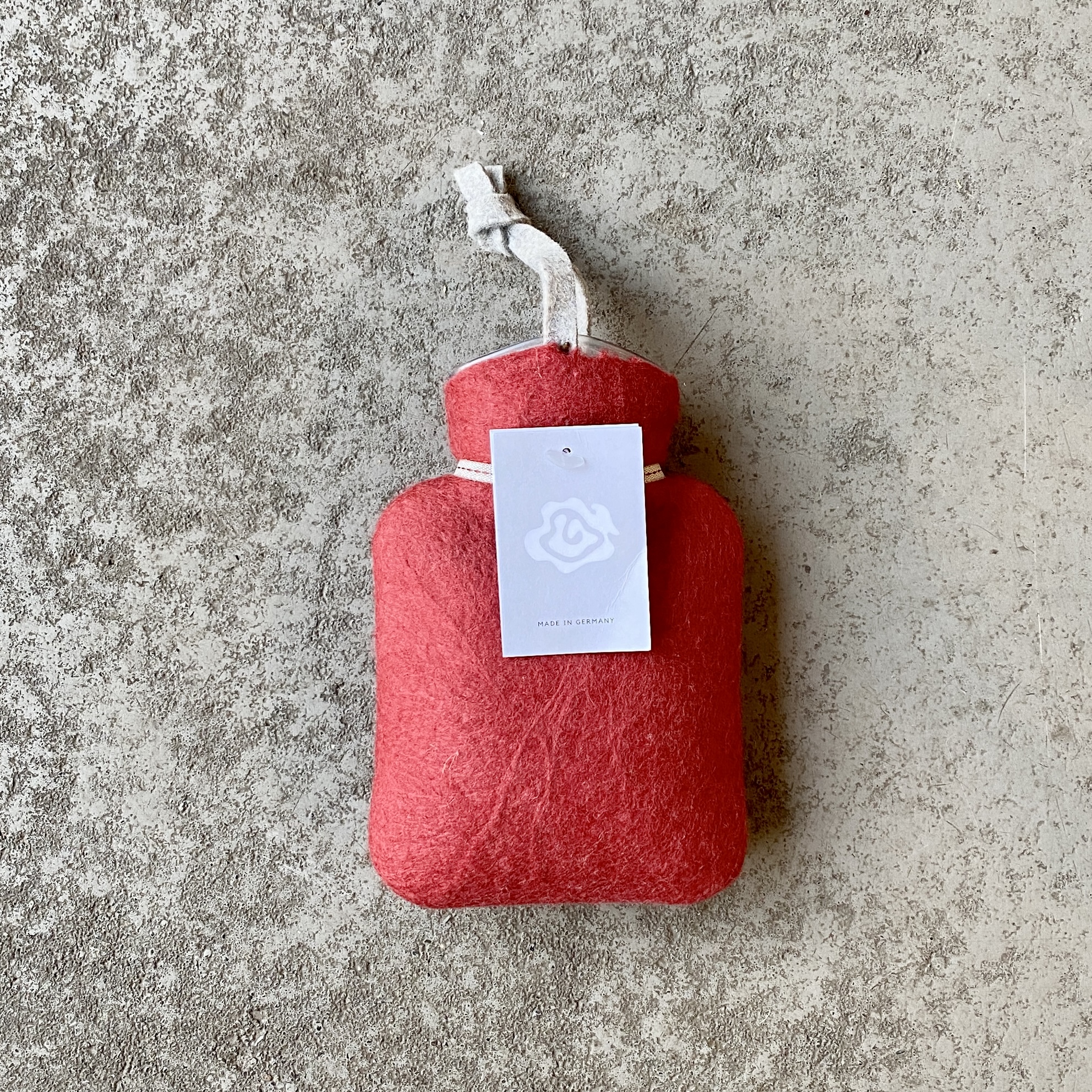 Kleine Wärmflasche aus Merinowolle gefilzt in Handarbeit. Wichtiger Hinweis: Kein kochendes Wasser verwenden! Die Flasche nur ca. zu 2/3 befüllen und vor dem Verschließen den Wasserdampf entweichen lassen. Die Innenflaschen werden in Deutschland produziert und sind TÜV-geprüft.Fassungsvermögen ca. 0,2 l, Maße ca. 12 x 16 cm. Die Wärmflaschen können mit ihrer Hülle im Wollprogramm der Waschmaschine bei 30°C gewaschen werden.