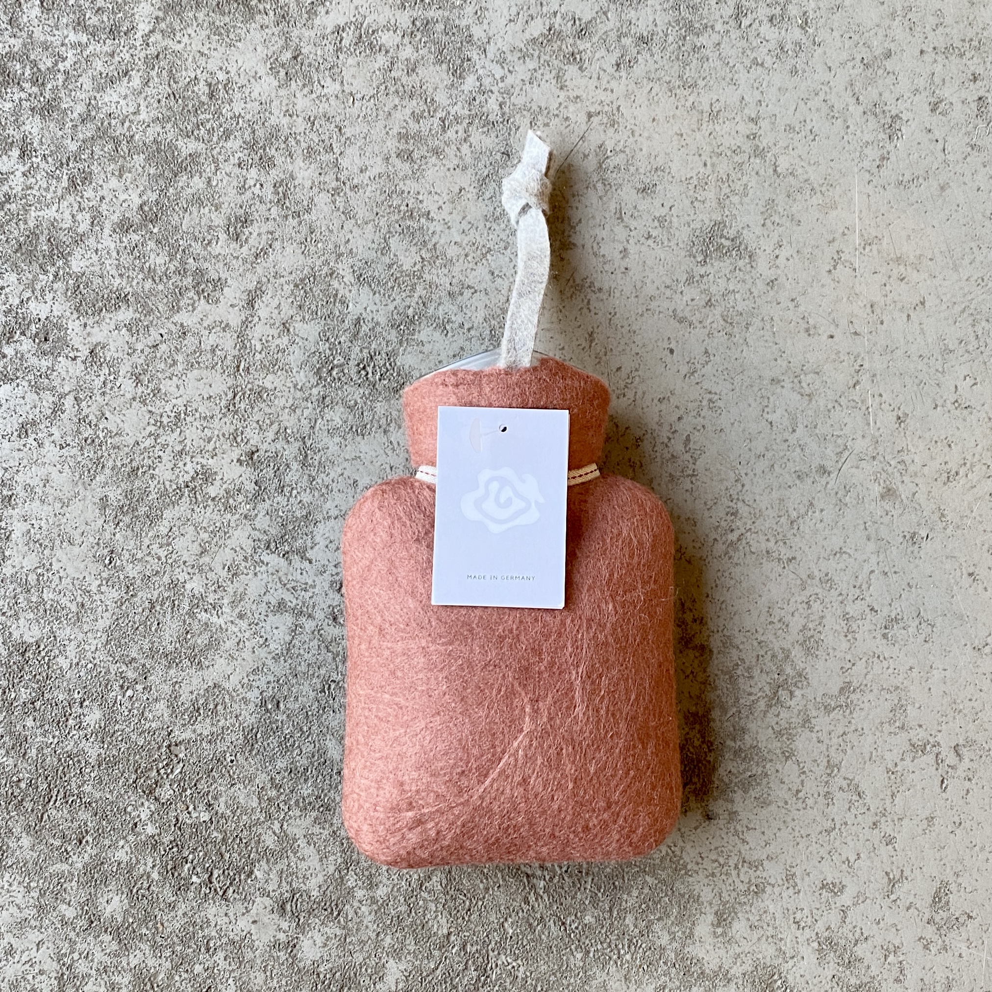 Kleine Wärmflasche aus Merinowolle gefilzt in Handarbeit. Wichtiger Hinweis: Kein kochendes Wasser verwenden! Die Flasche nur ca. zu 2/3 befüllen und vor dem Verschließen den Wasserdampf entweichen lassen. Die Innenflaschen werden in Deutschland produziert und sind TÜV-geprüft.Fassungsvermögen ca. 0,2 l, Maße ca. 12 x 16 cm. Die Wärmflaschen können mit ihrer Hülle im Wollprogramm der Waschmaschine bei 30°C gewaschen werden.