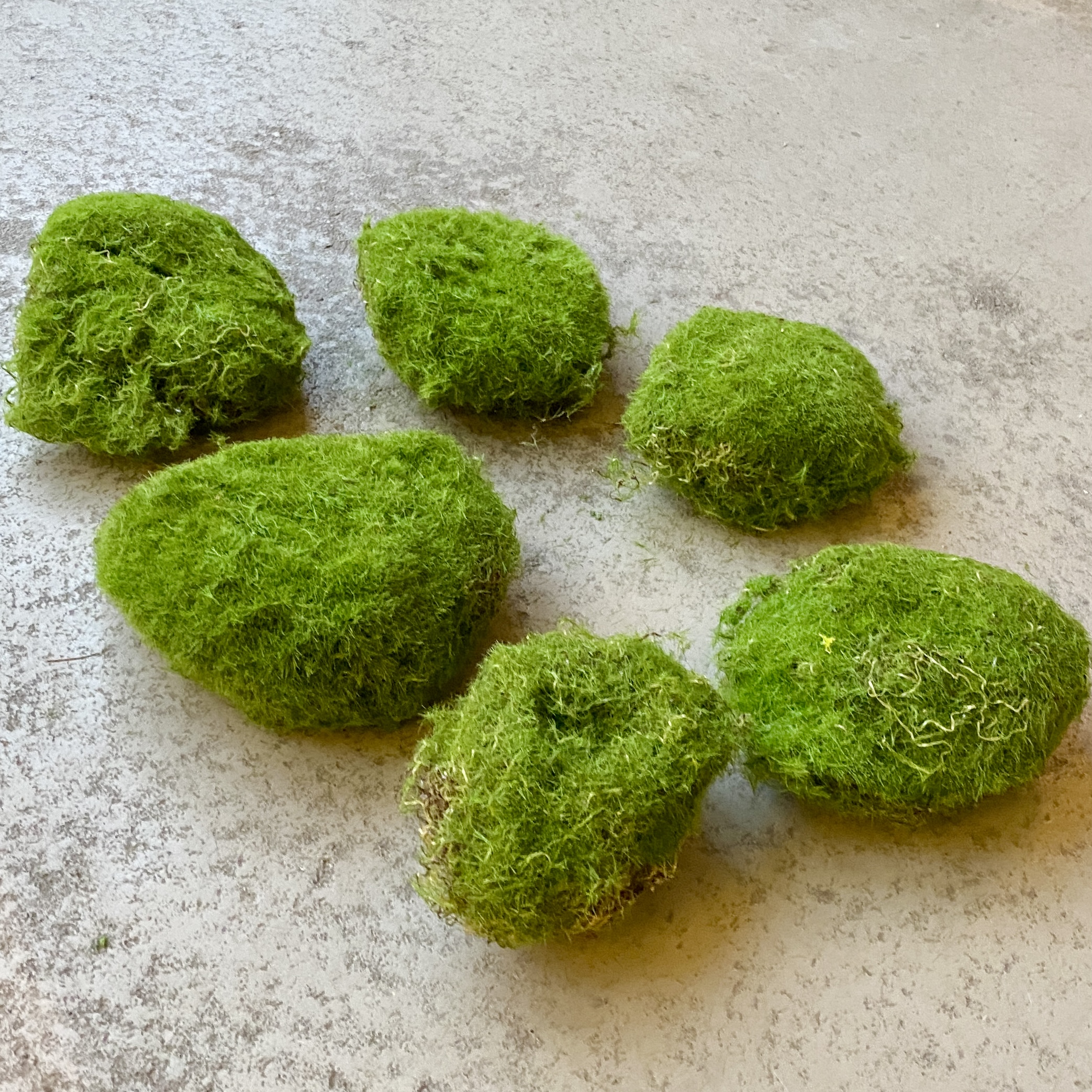 6 Moos-Steine aus Kunststoff in verschiedenen Größen im Set für deine Frühjahrsdekoration.
