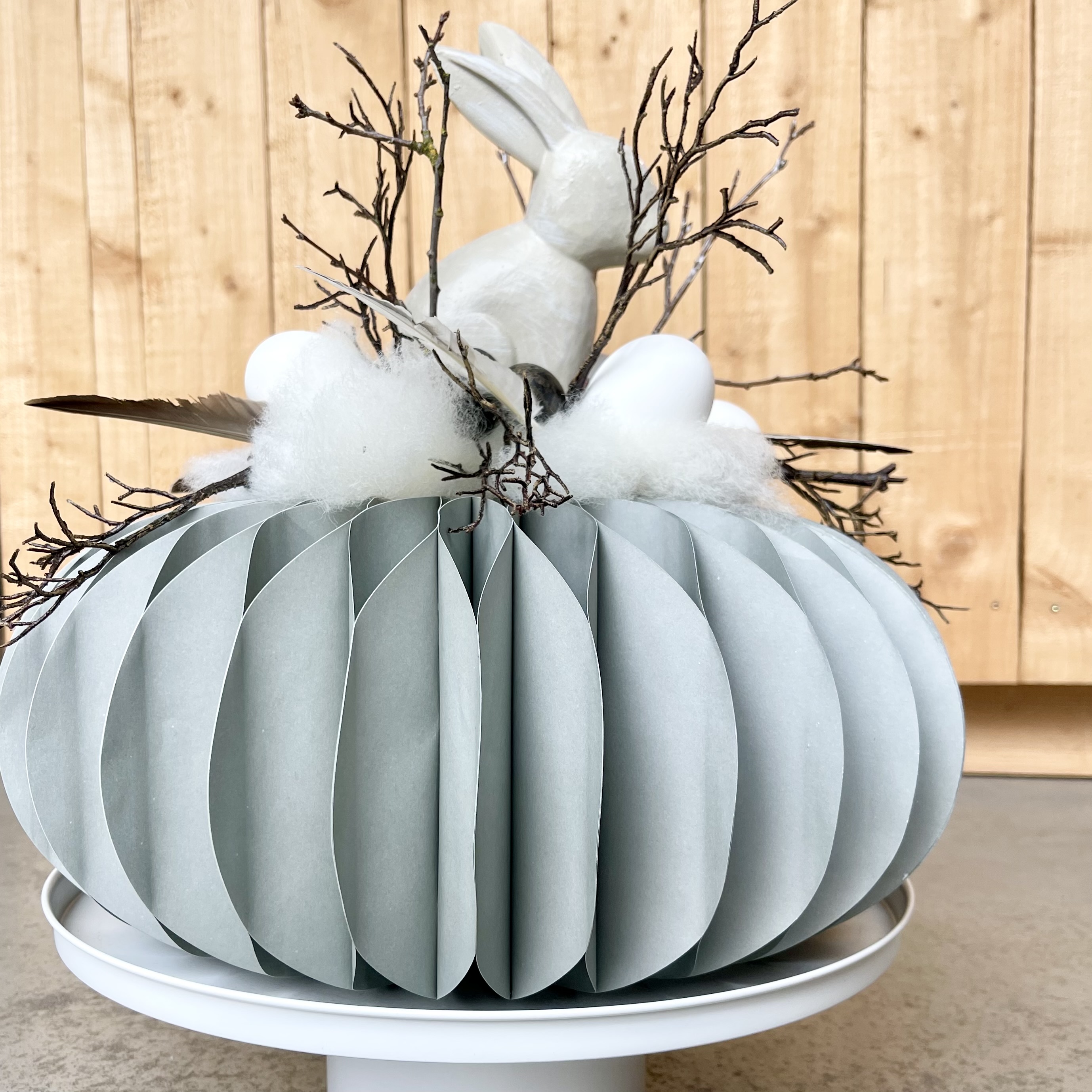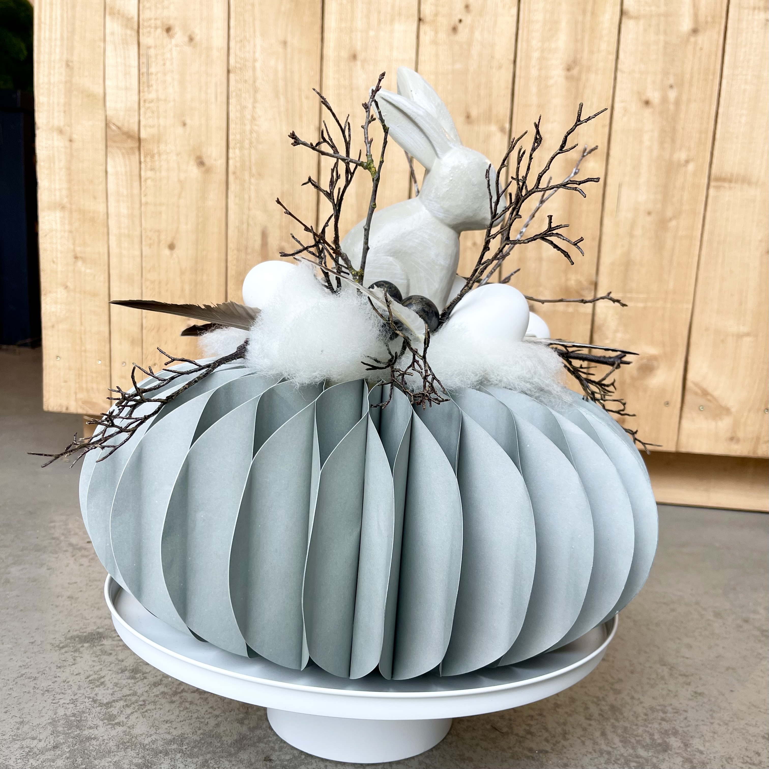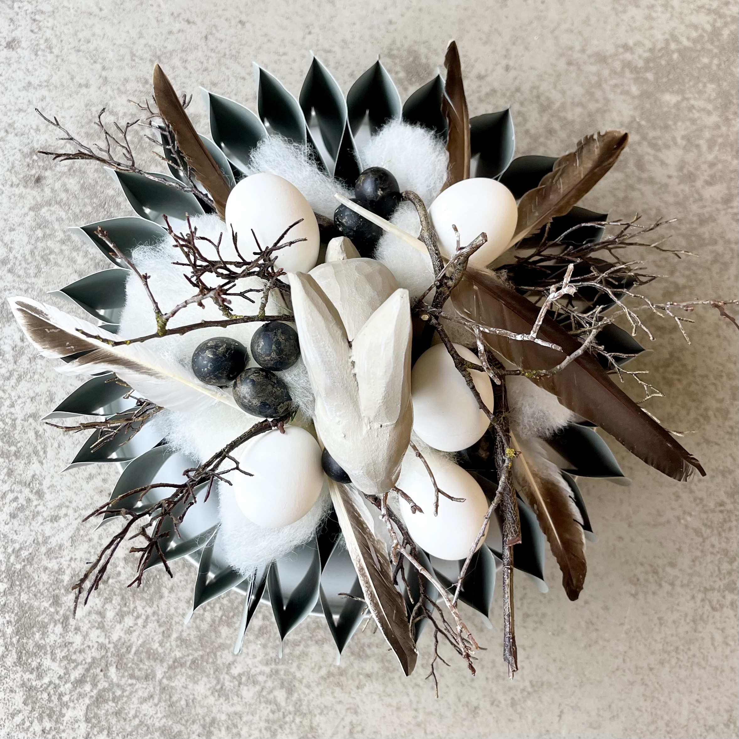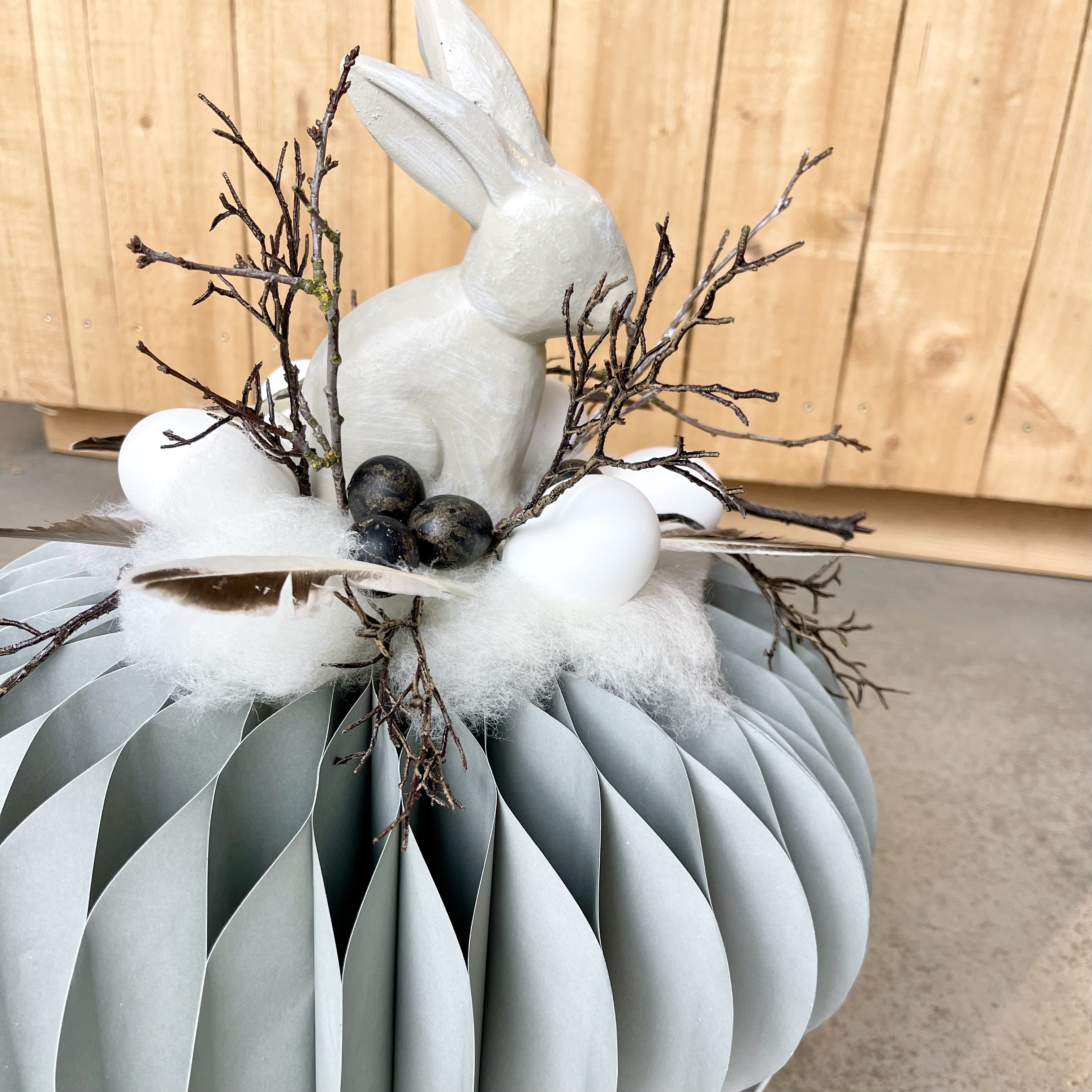 Moderner Papier Sockel Dacia als Hasennest arrangiert mit grauen Holzhasen und einem weißen Tablett als