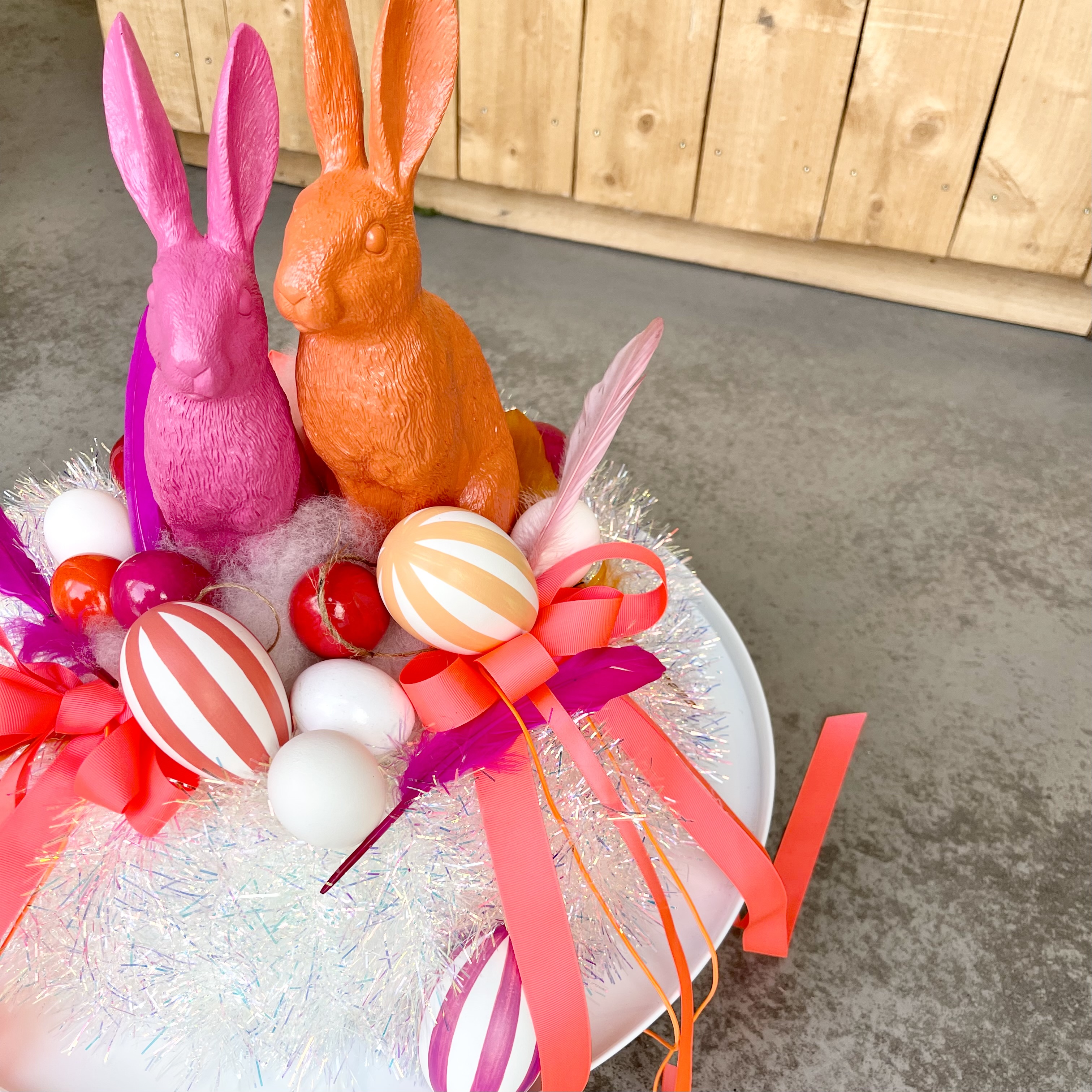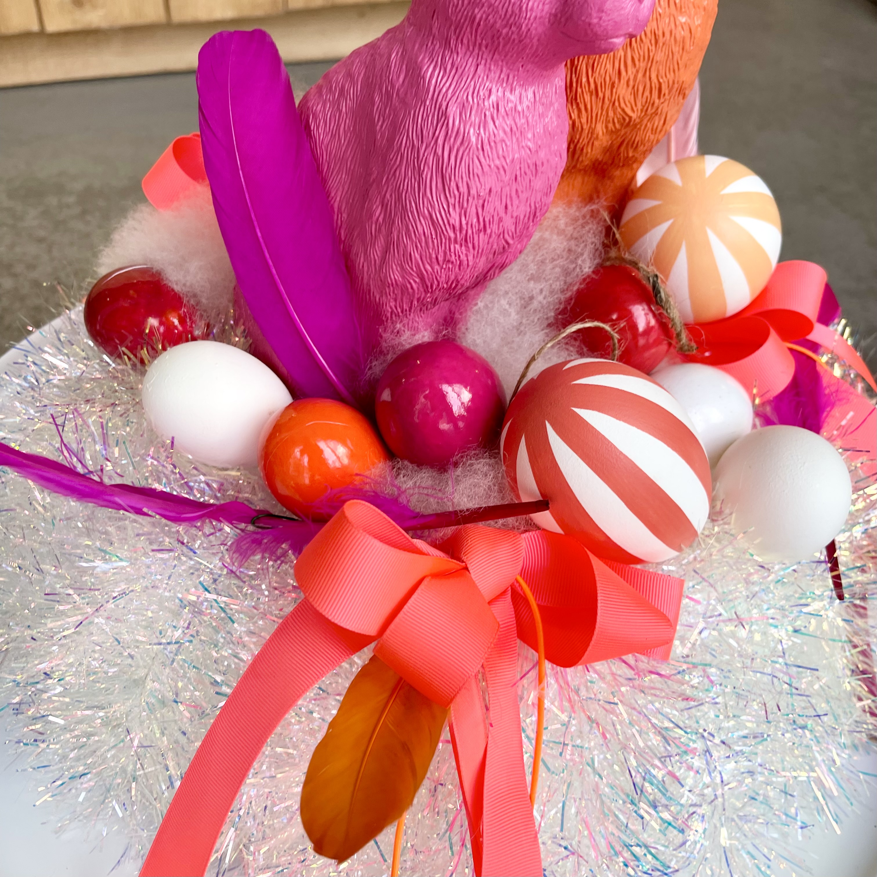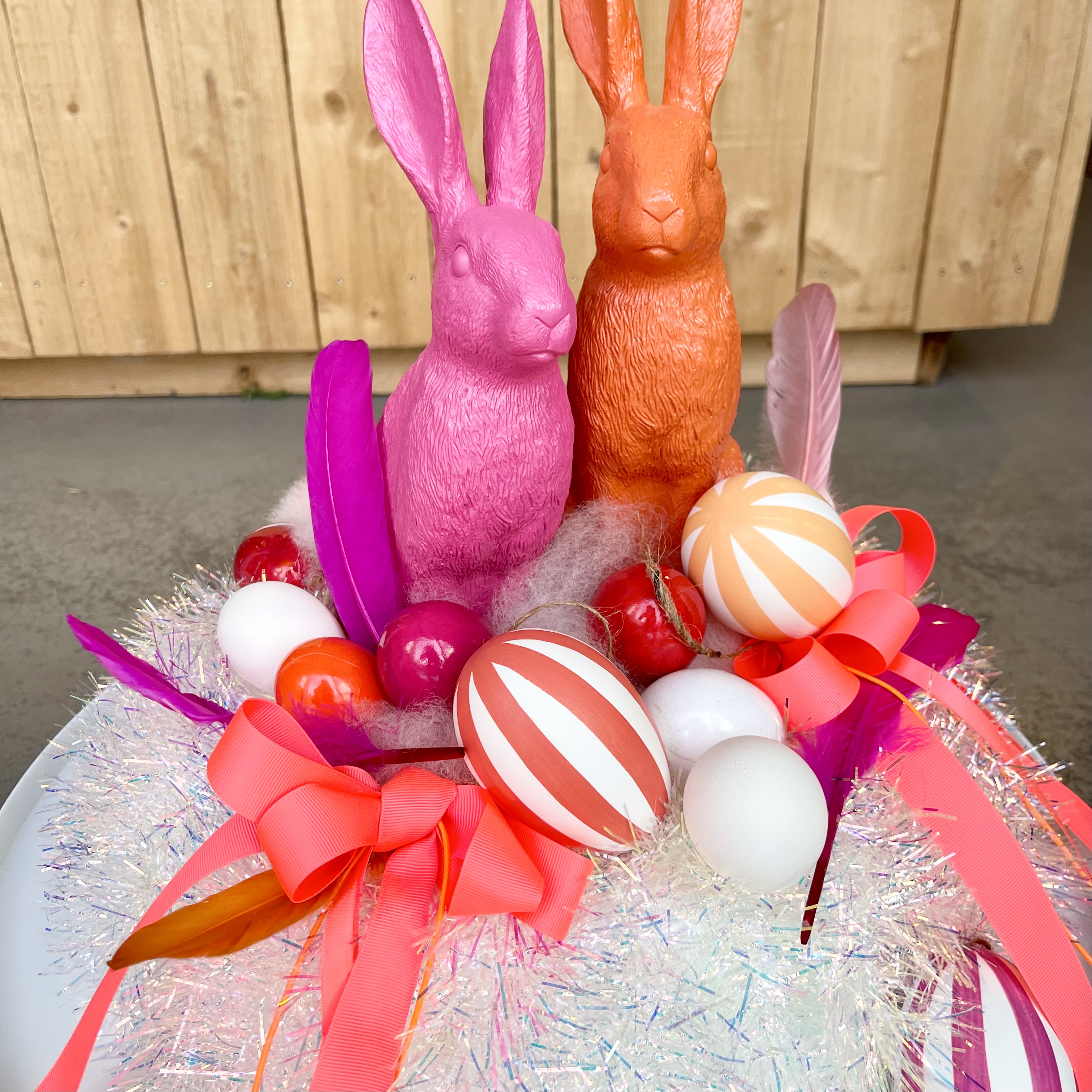 Einzigartiger Glamour-Disco Kranz, orange Schleifen, Federn und Eier umrahmen zwei schnieke Osterhasen,