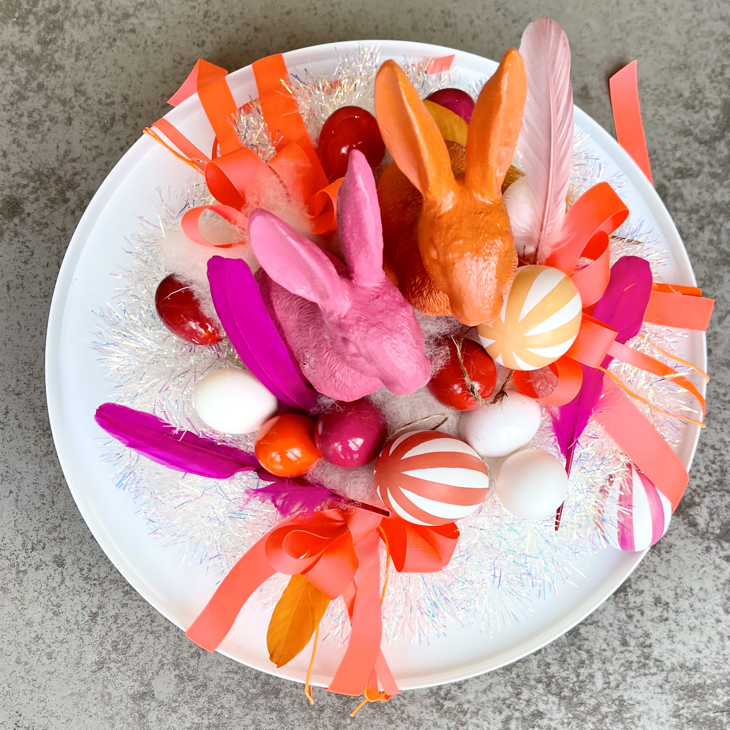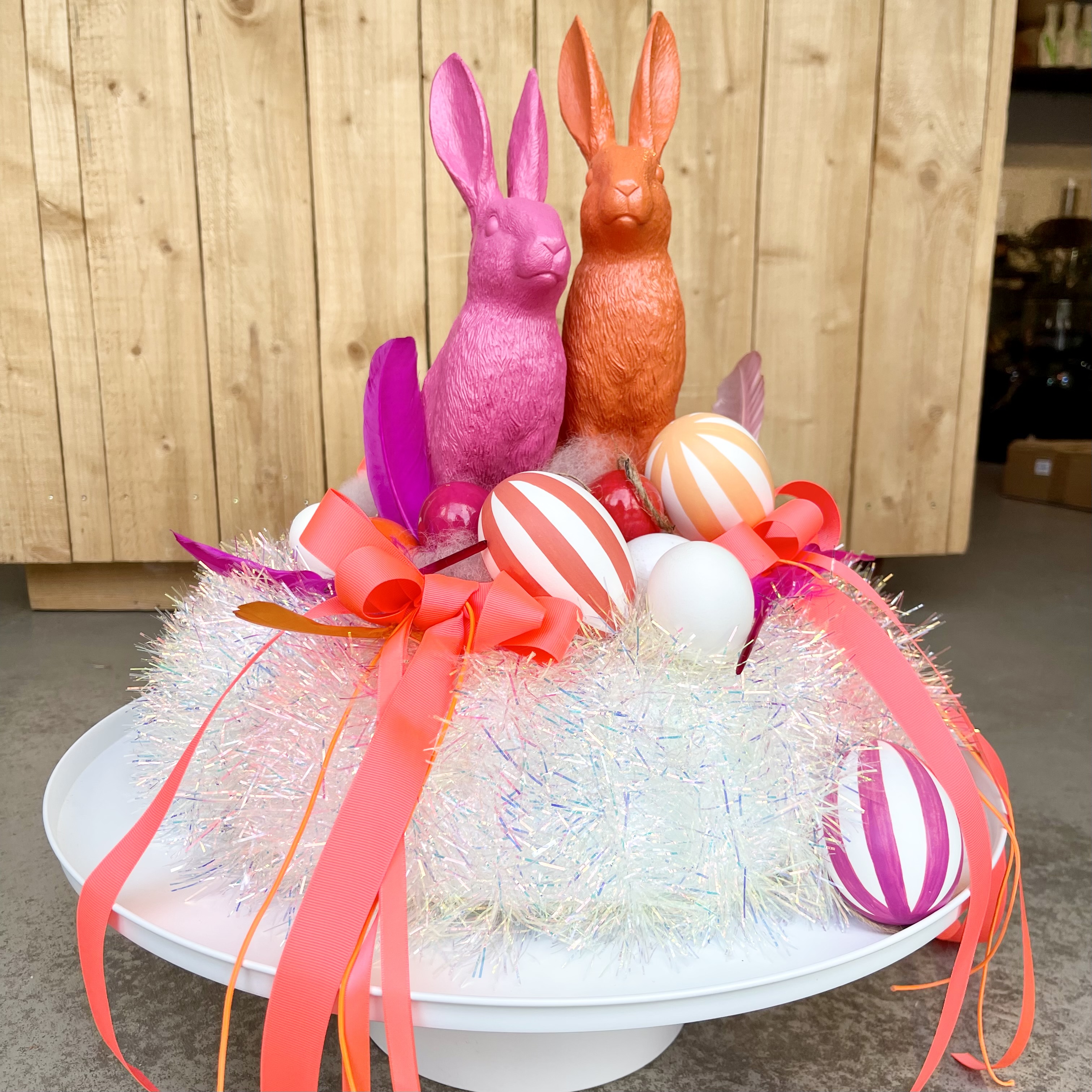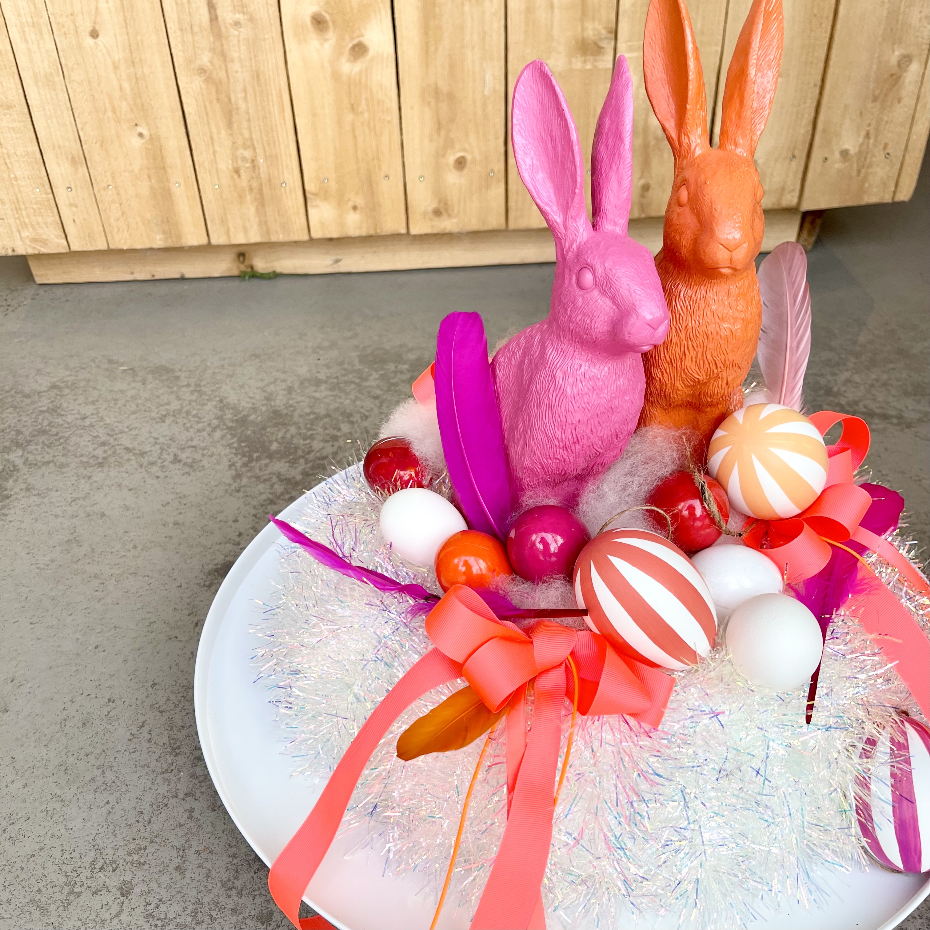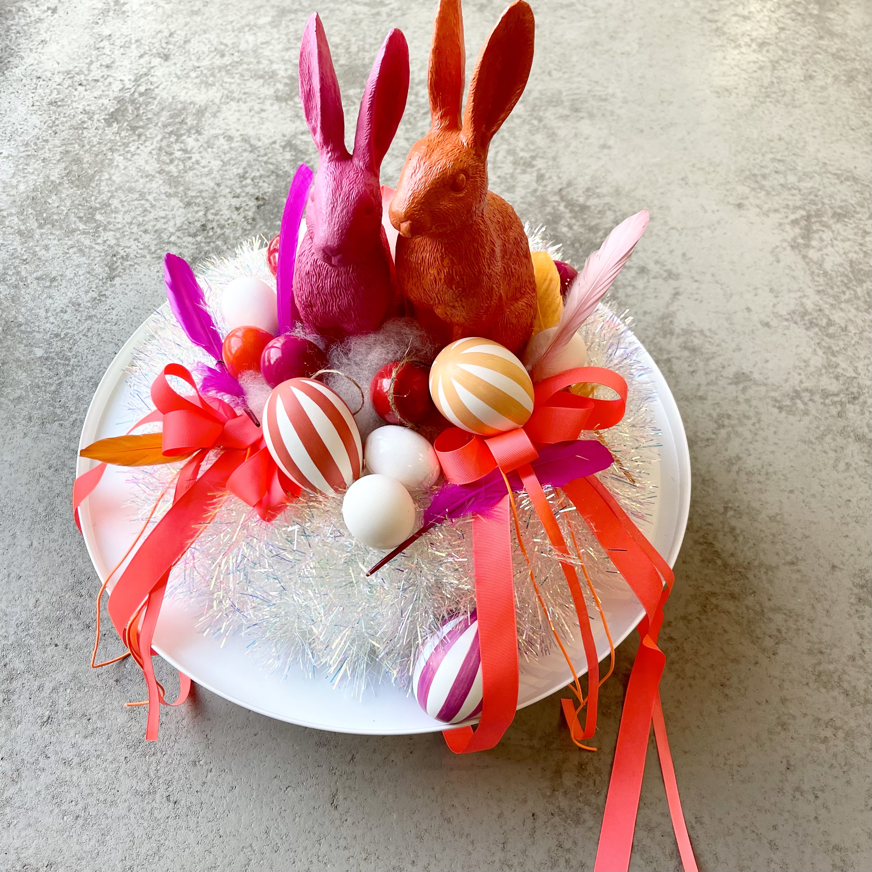 Einzigartiger Glamour-Disco Kranz, orange Schleifen, Federn und Eier umrahmen zwei schnieke Osterhasen,