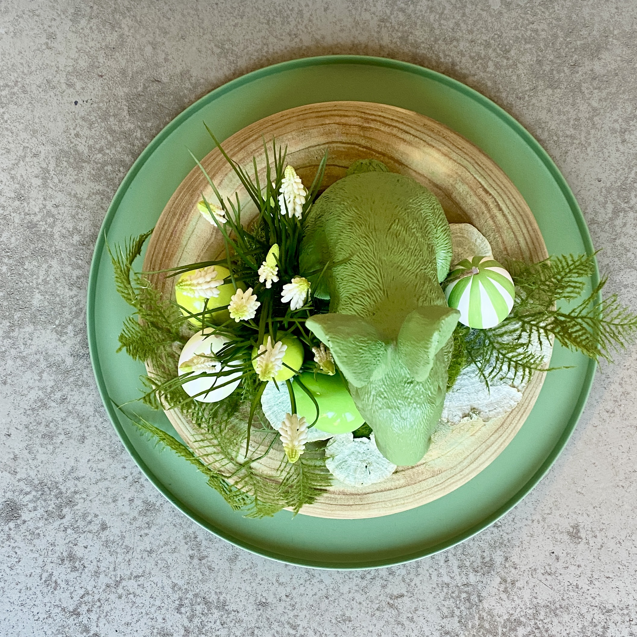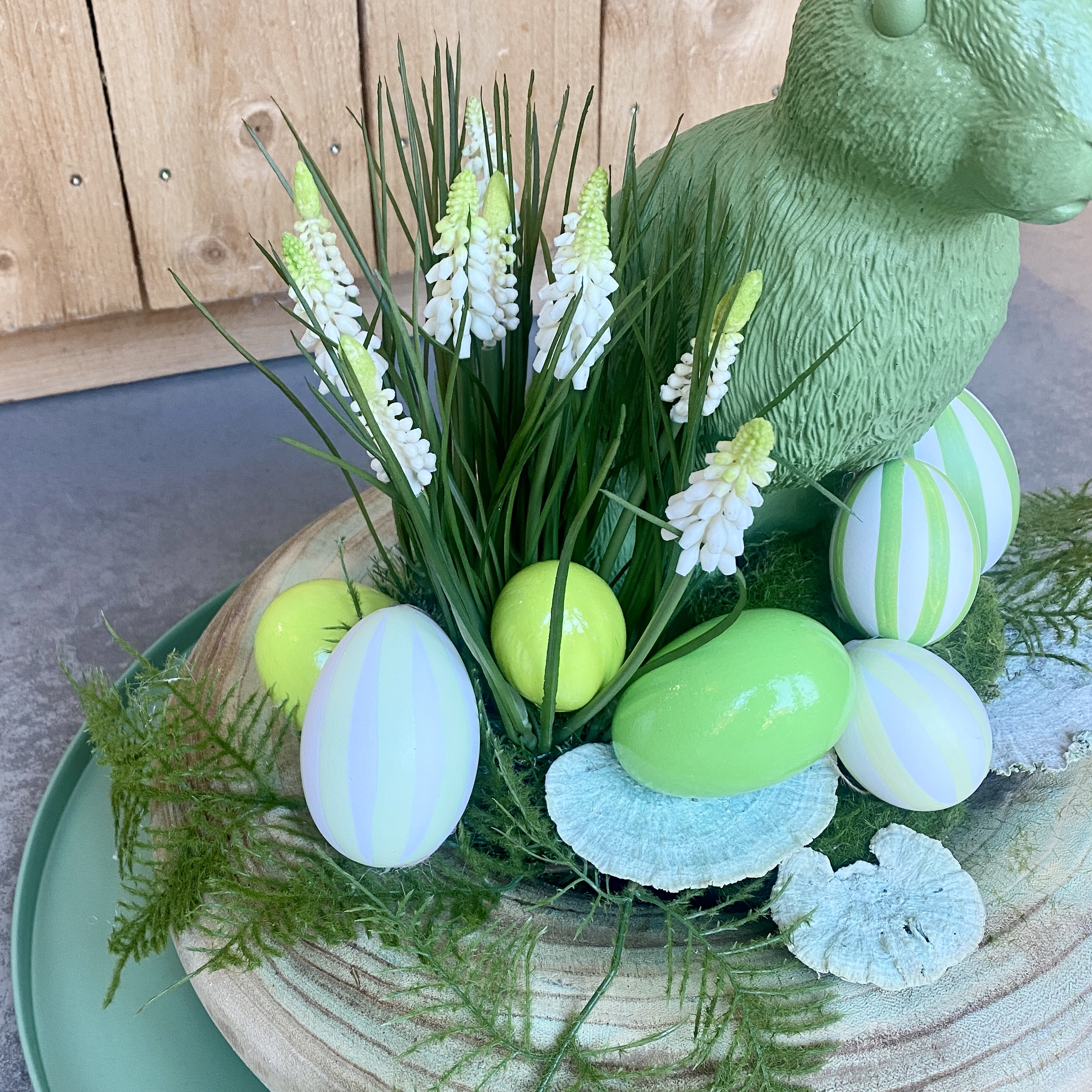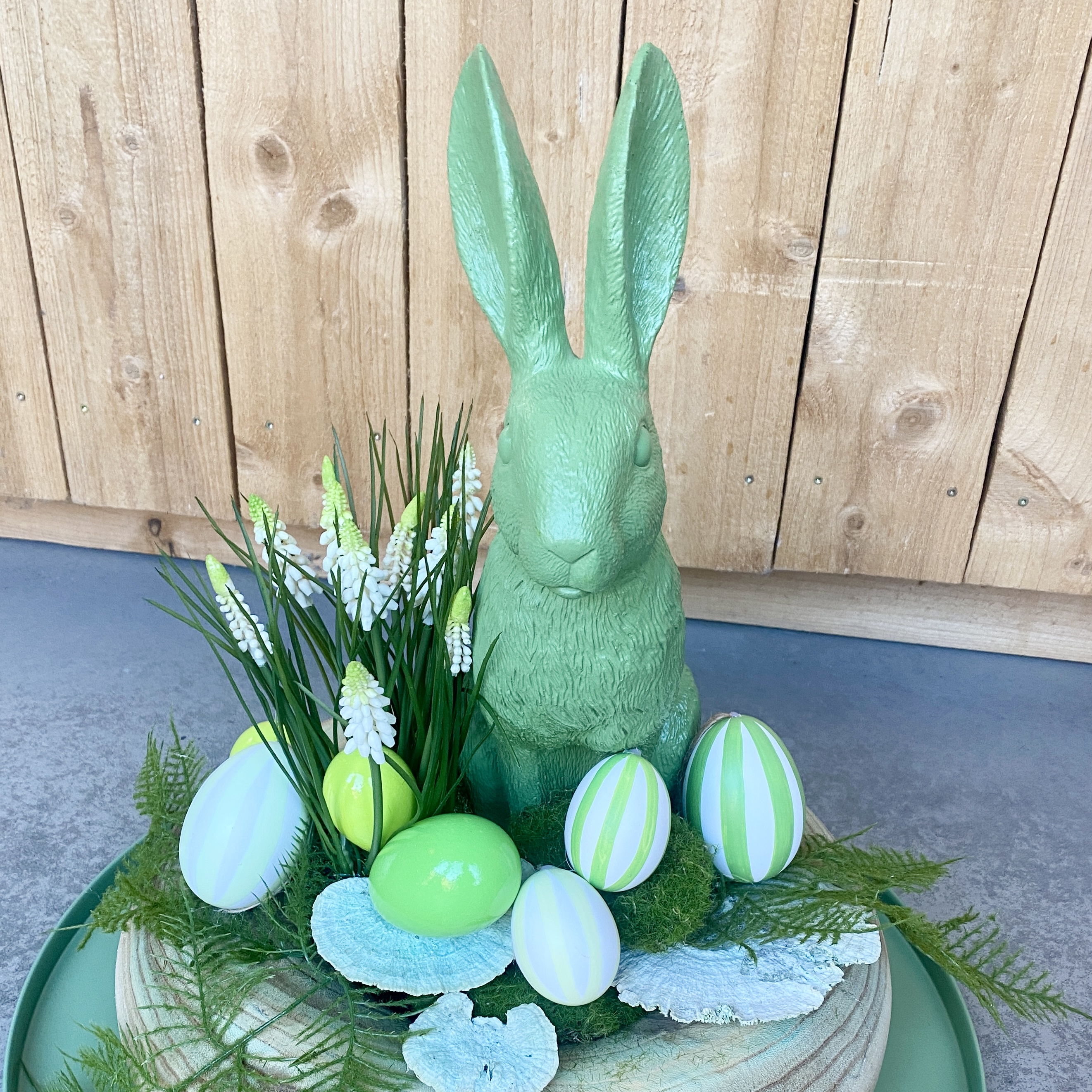Großer sitzender Hase in Grün im Holzkranz mit Perlhyazinthen und Ostereiern, Moos, Farn aus Kunststoff, und Baumpilzen auf Metall-Tablett in Grün.