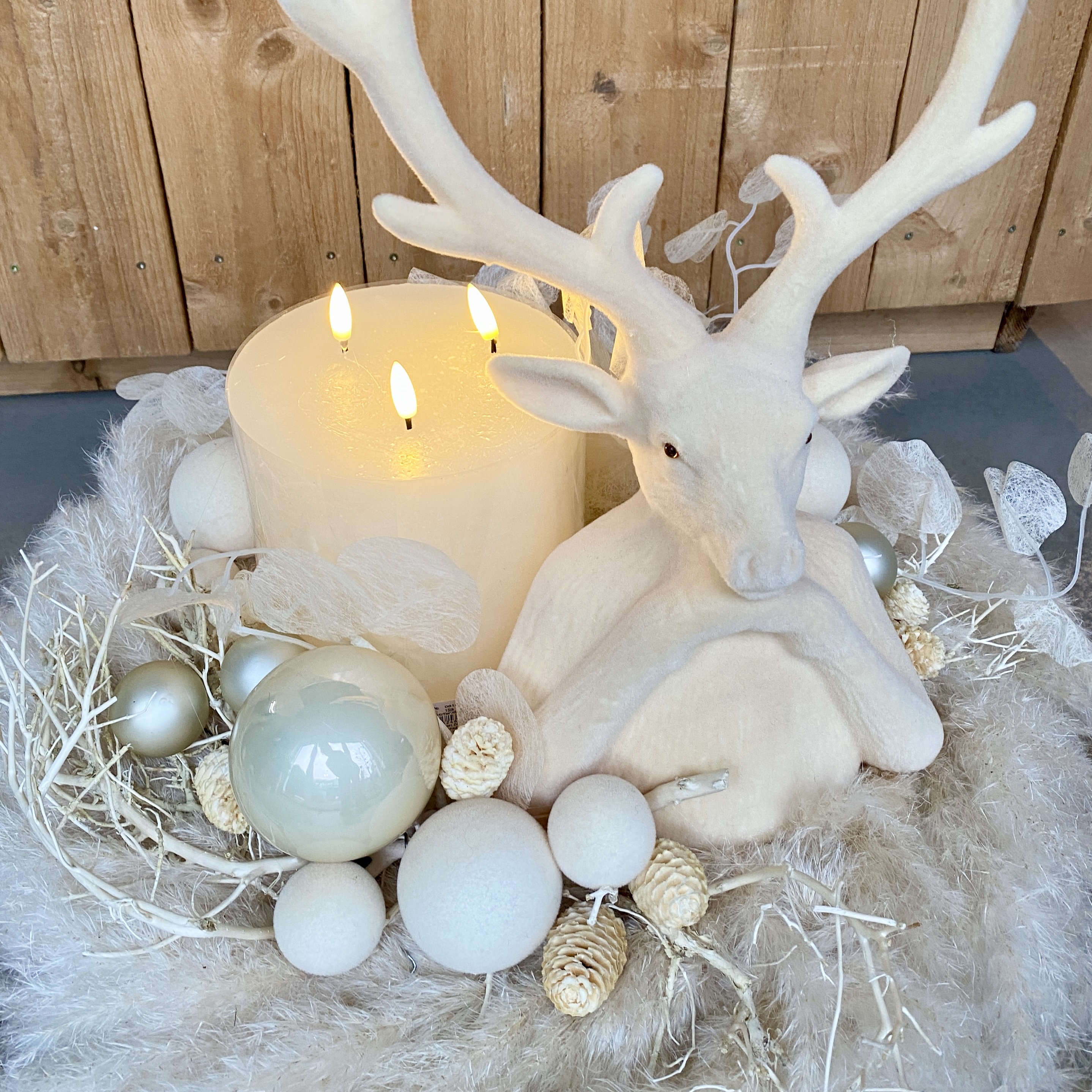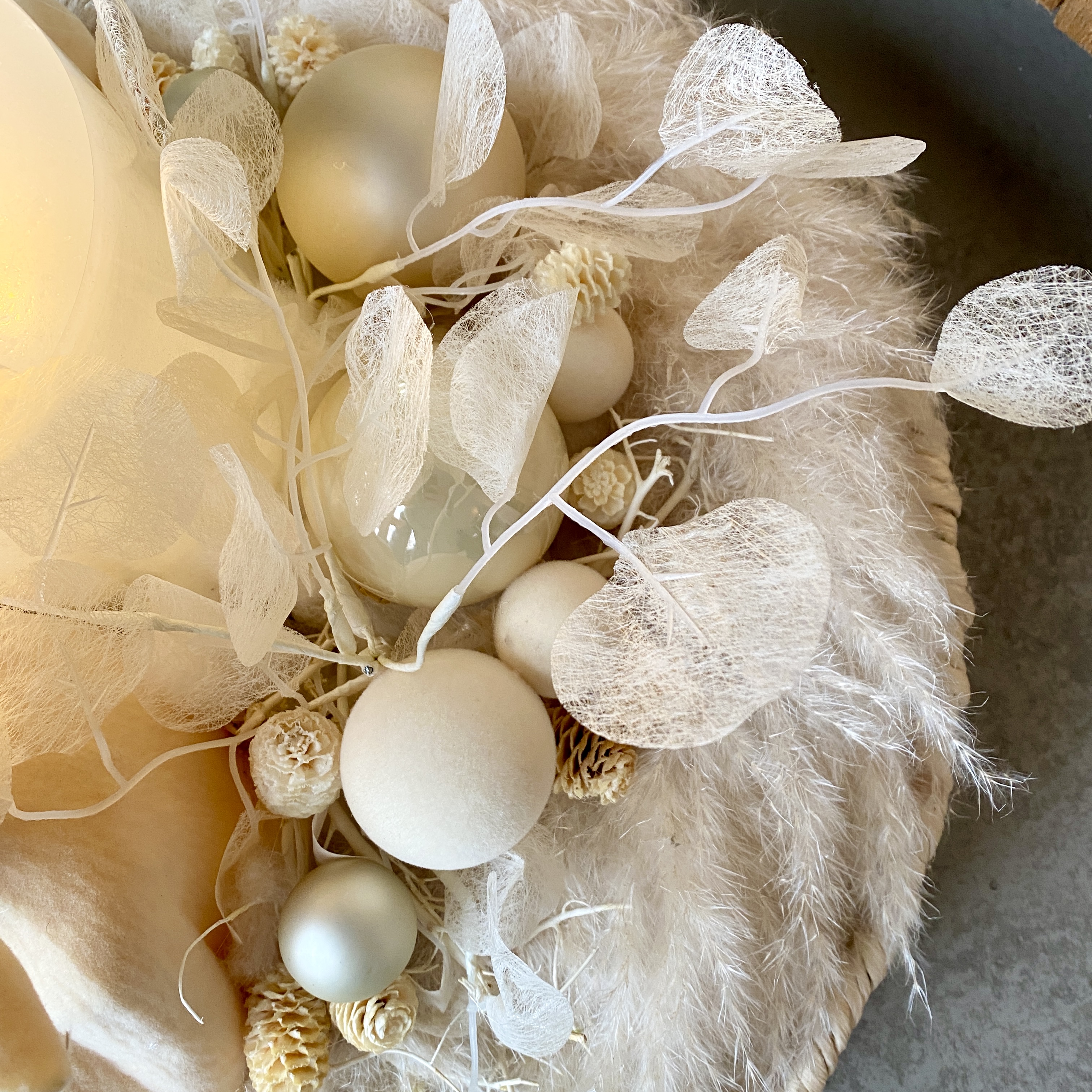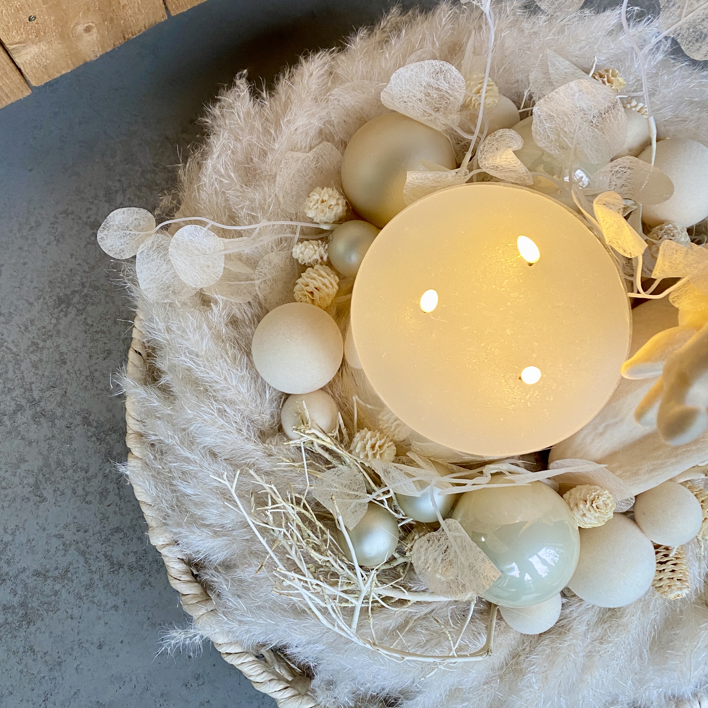 Großer Kranz mit Pampasgras, 3Docht LED-Kerze in Creme, Tasko Kugeln und Glaskugeln in Creme, ein Tasko Hirschkopf in Creme, Lunaria in Creme, gebleichte Zapfen und gebleichtes Geäst in einem naturfarbenen Bastkorb. Zart wie Buttercreme.