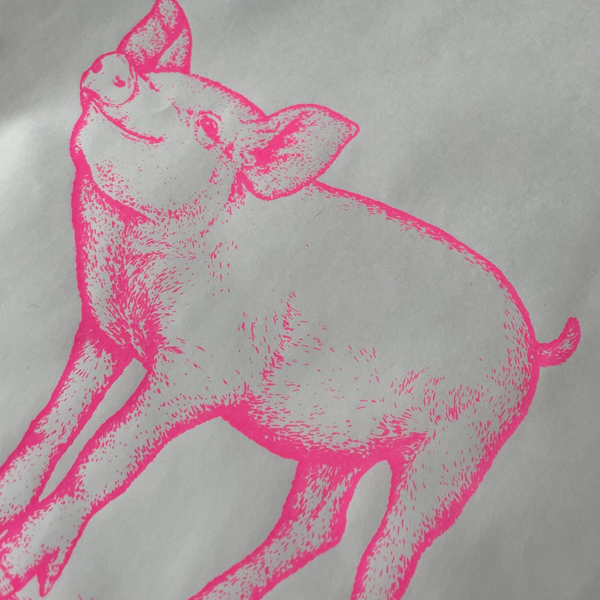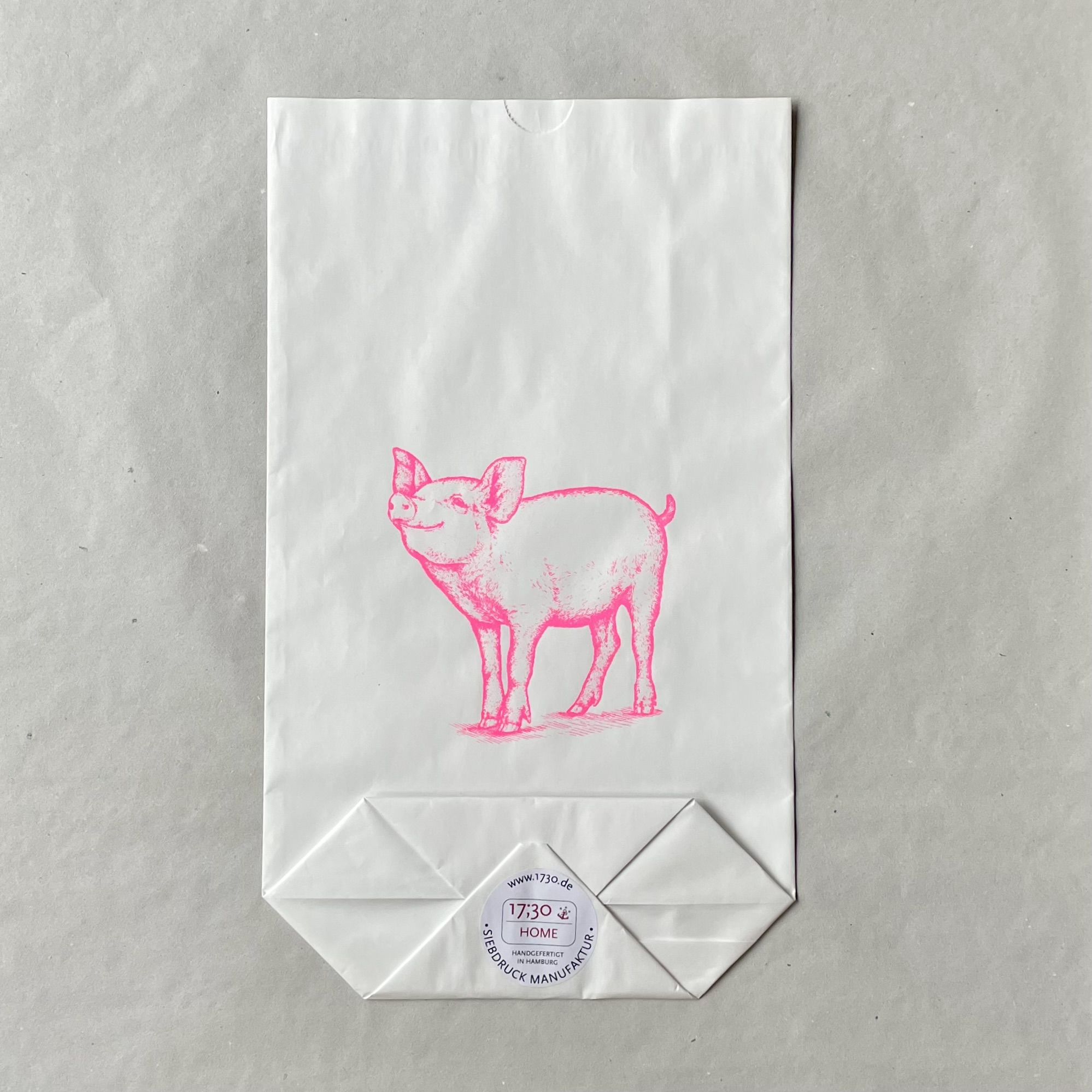 Papiertüte mit Neon-Druck, Motiv Glücksschwein, Handarbeit. Eine schöne Verpackung für kleine Geschenke.