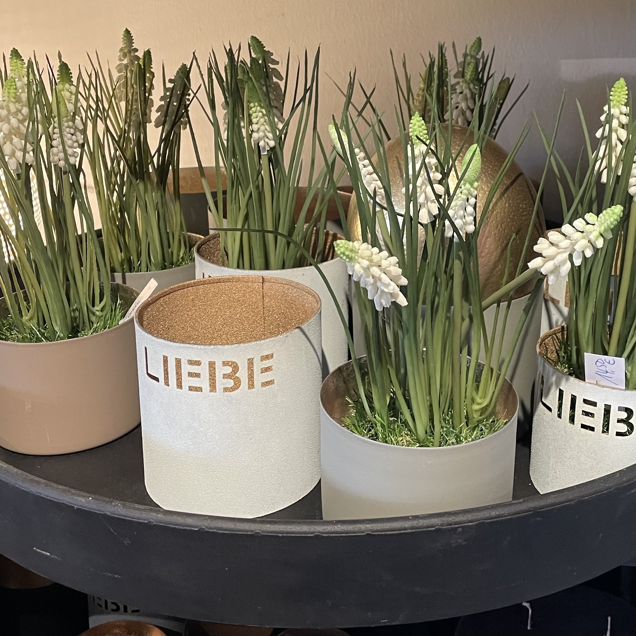 Hyazinthen zum Gestalten. In kleinen Töpfen mit etwas Birke sehen die Perlhyzinthen besonders natürlich aus.