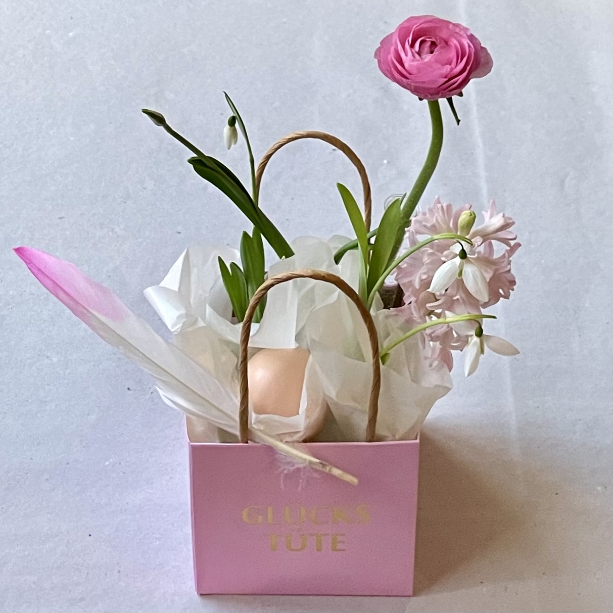 Tüte zum Gestalten und Verschenken, mit einem kleinen Blumentopf oder einem Glas mit Frischblumen bestückt,  sieht die Tüte frisch aus und versprüht Lust auf den Frühling.    Aus Imke's Video!
