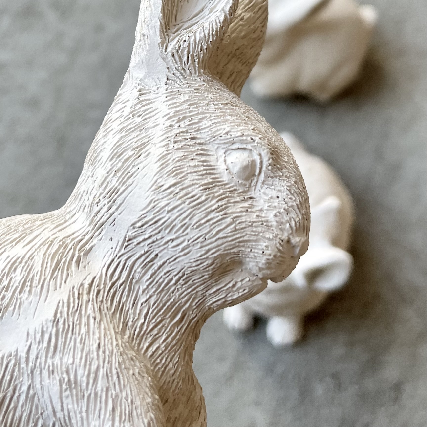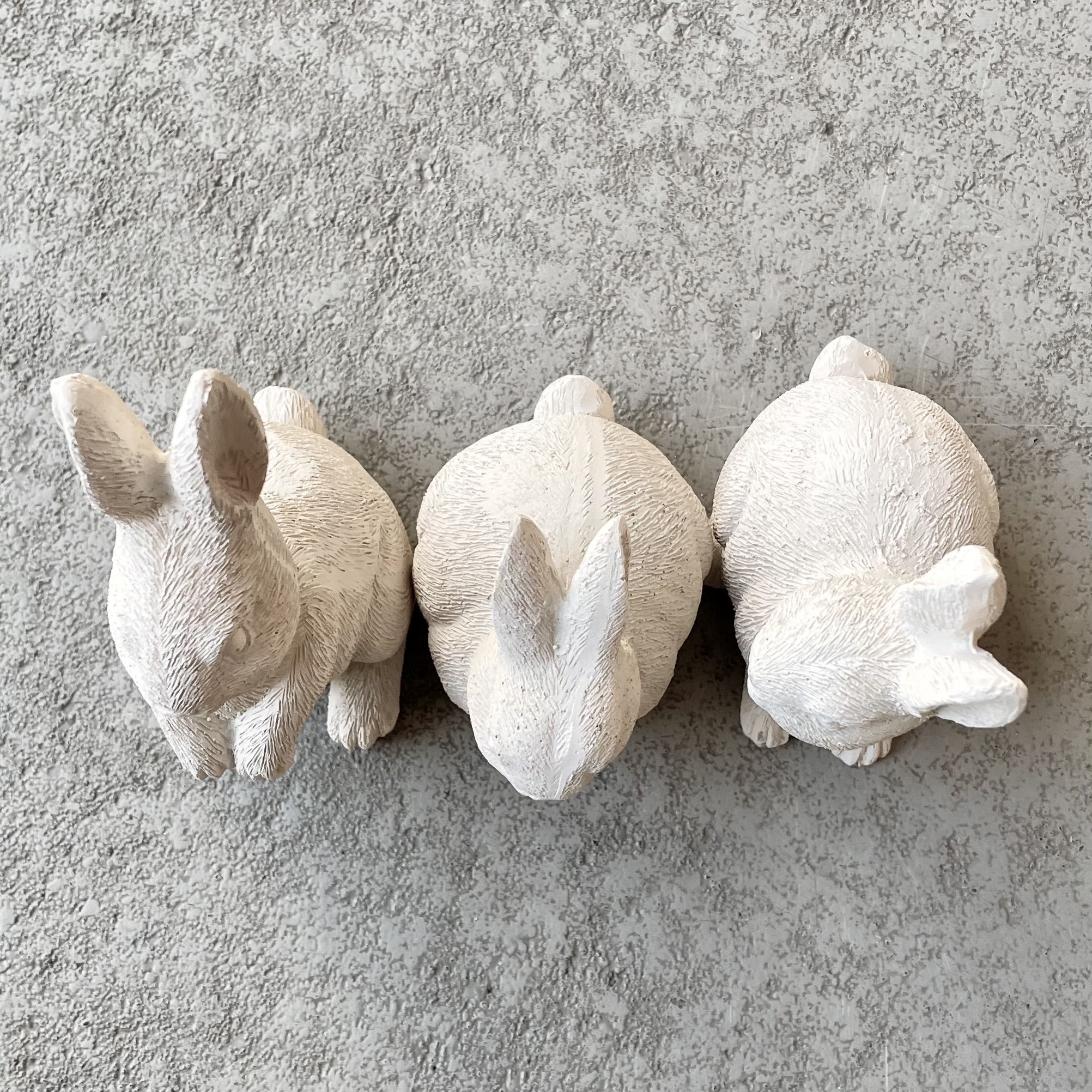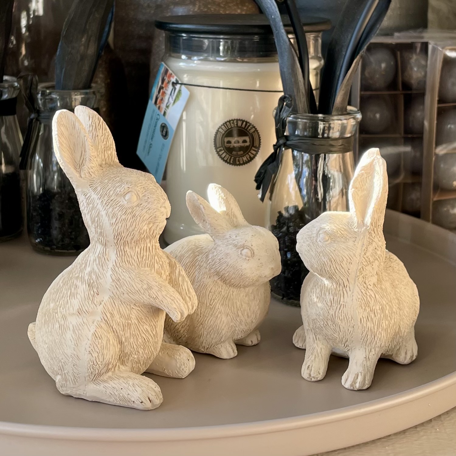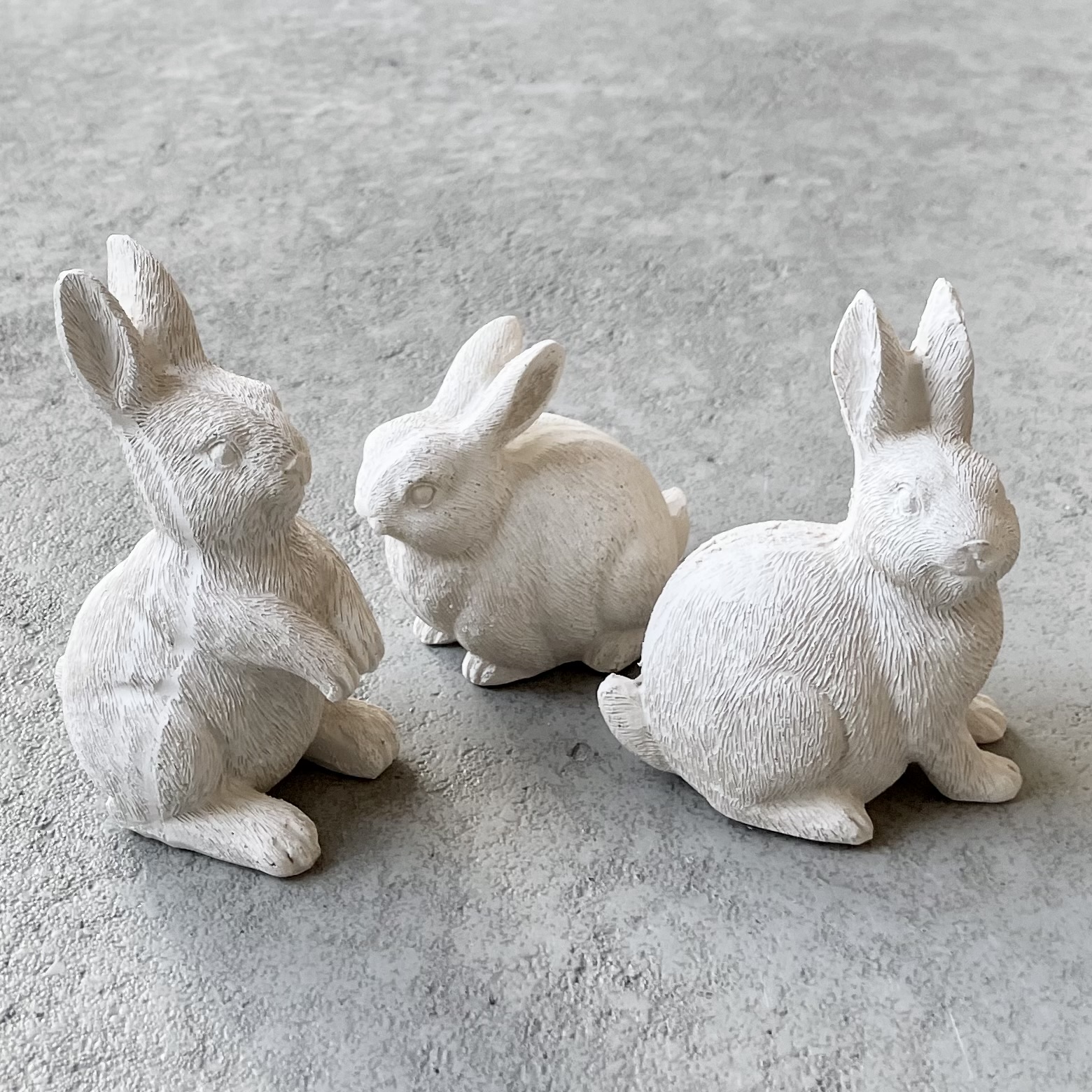 Drei kleine Häschen aus Polyresin sitzen gemütlich zusammen. Tolle Tischdekoration!