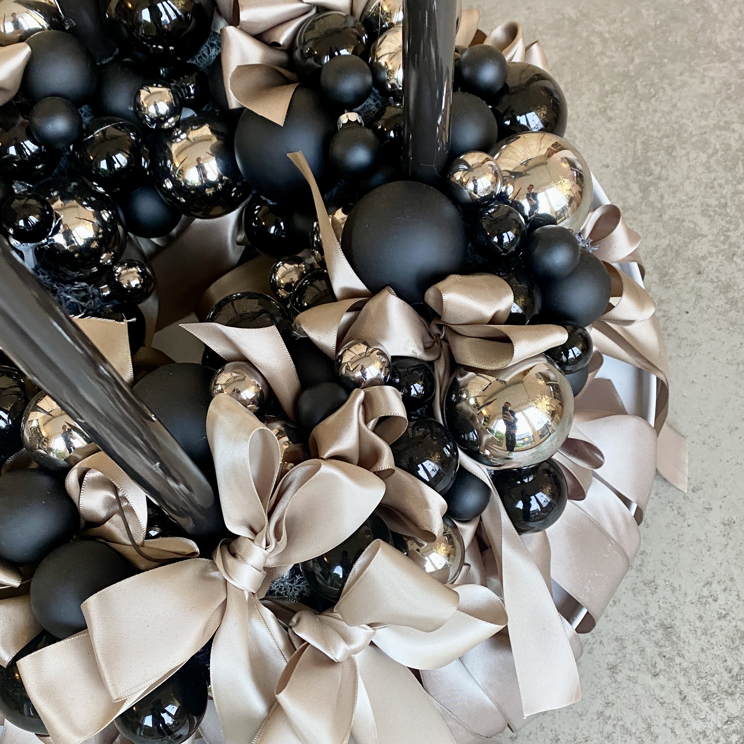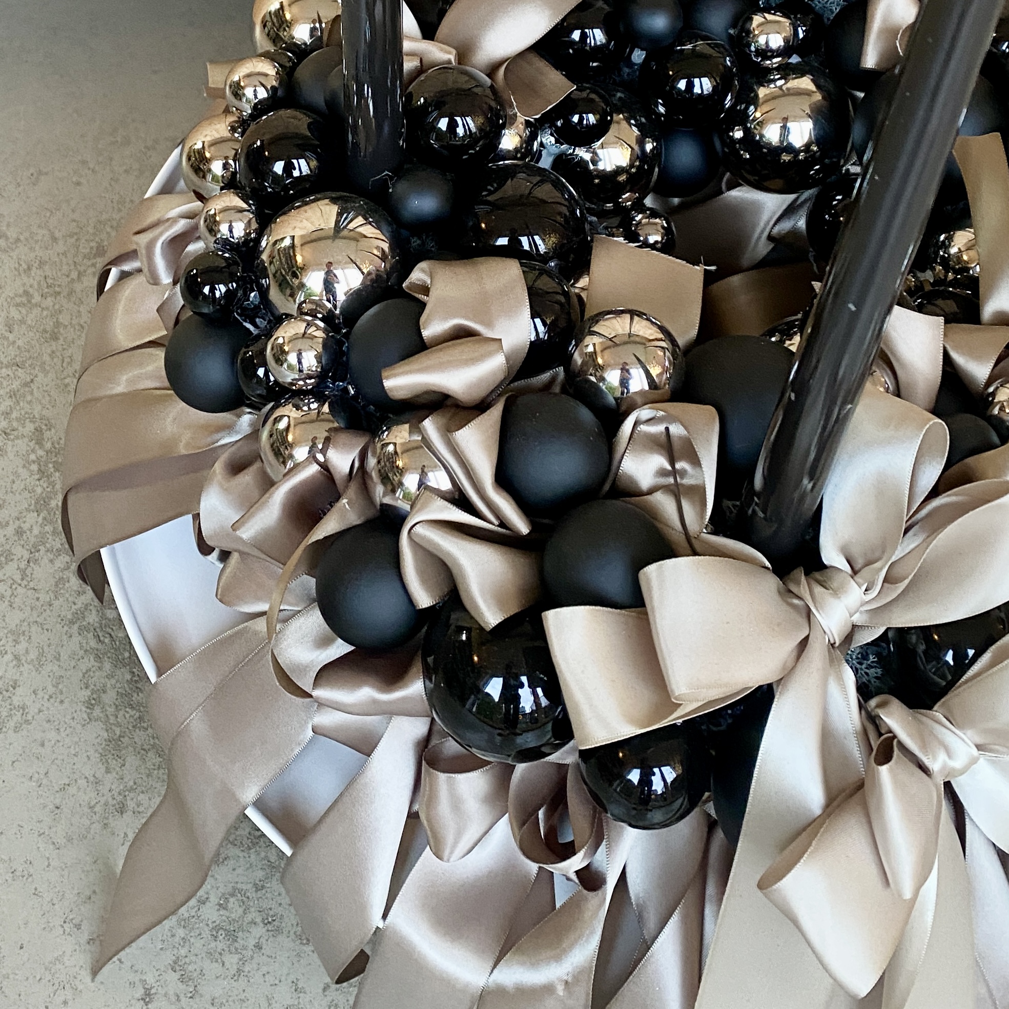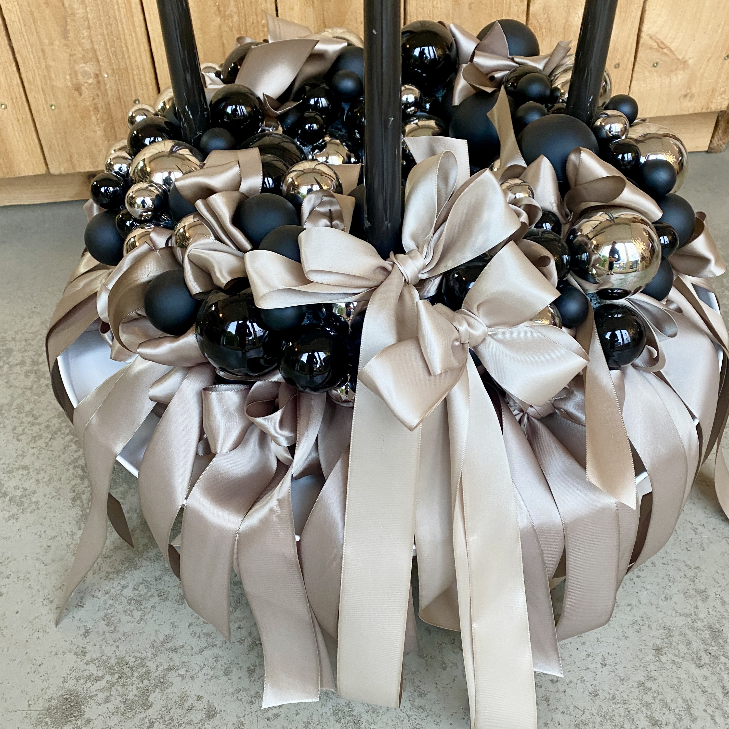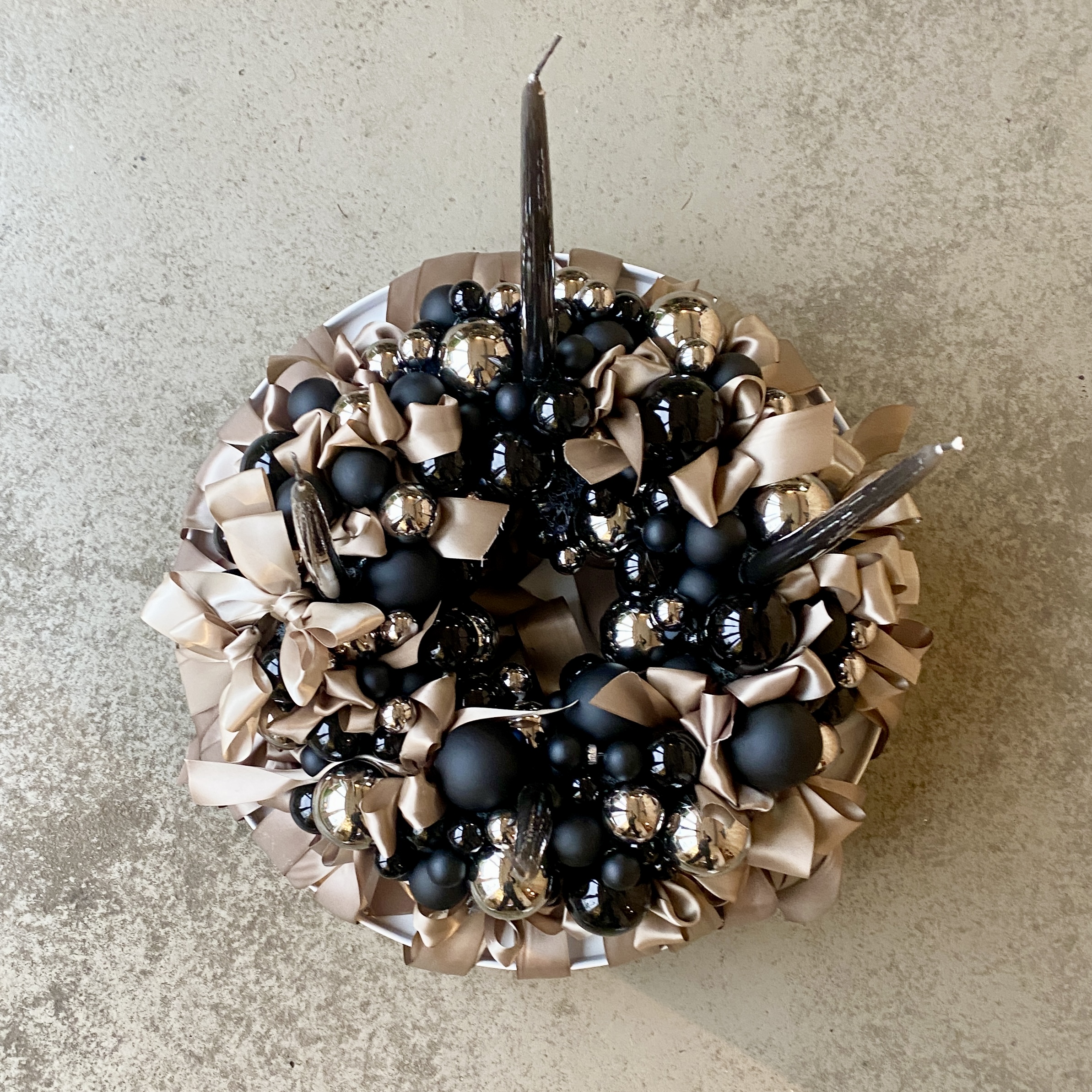 Wunderschöner Kranz mit unzähligen Satinschleifen in Taupe, 4 Stabkerzen lackiert in Schwarz, Kugeln in verschiedenen Größen in Silber, Schwarz glänzend und Schwarz matt, auf Tablett mit Sockel in Weiß.