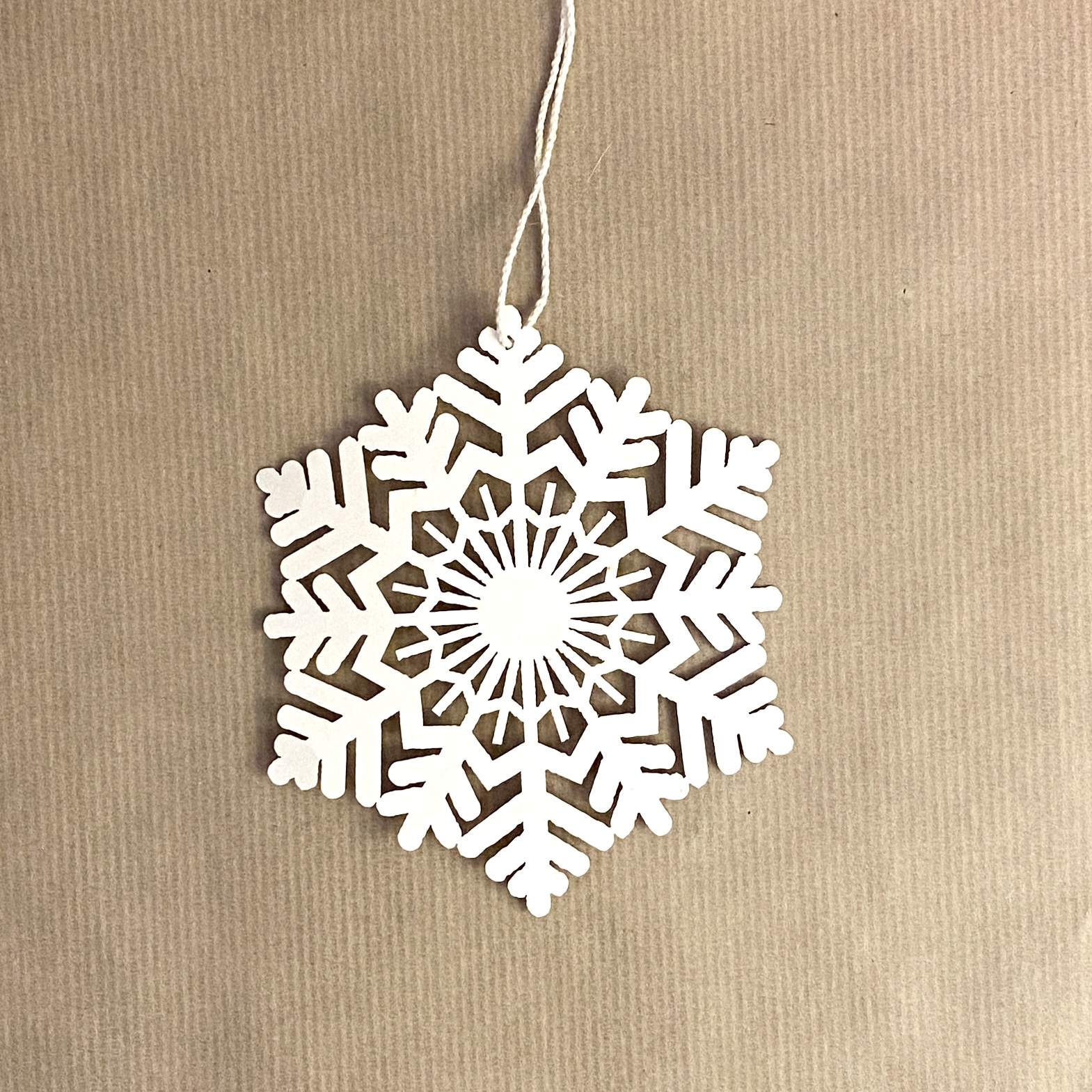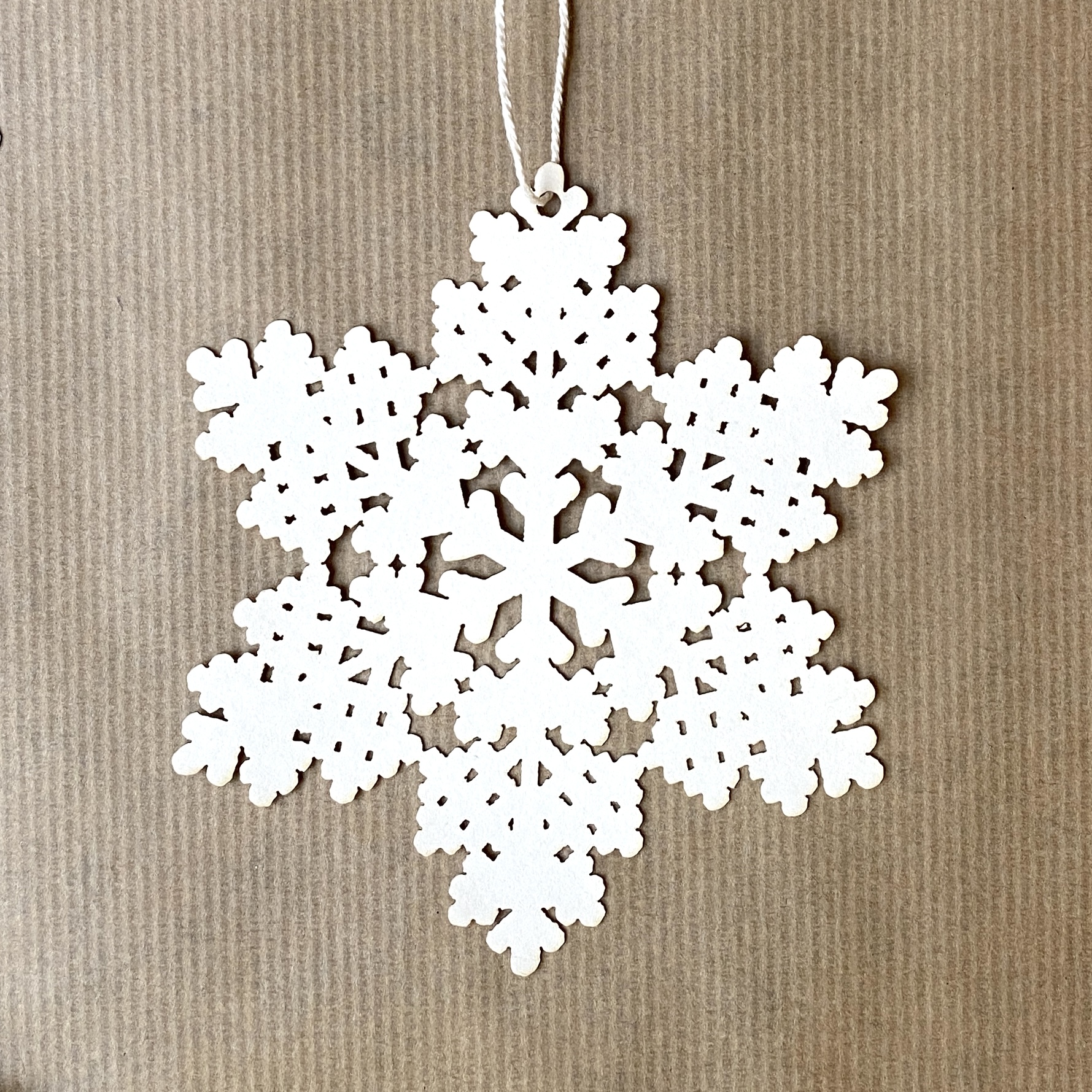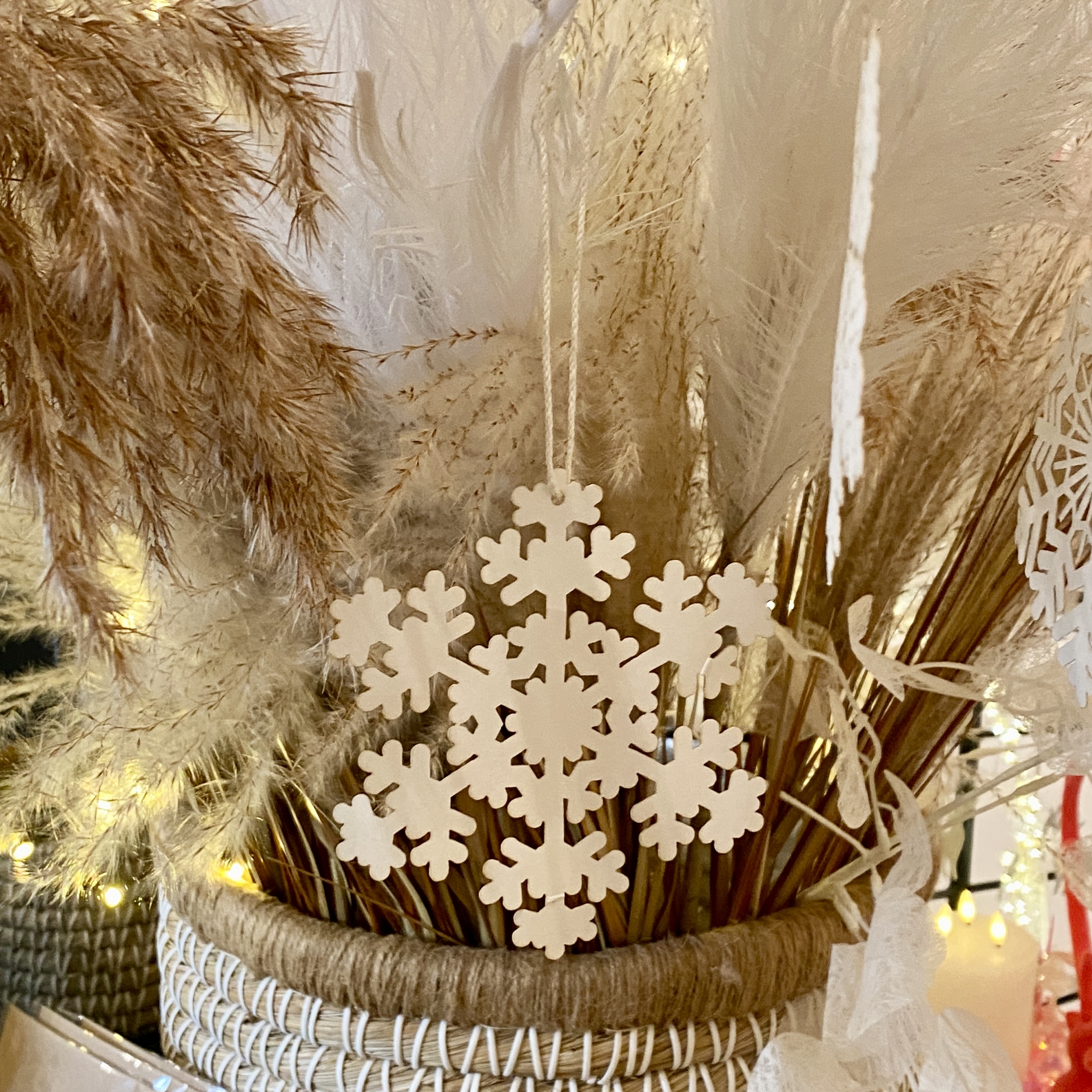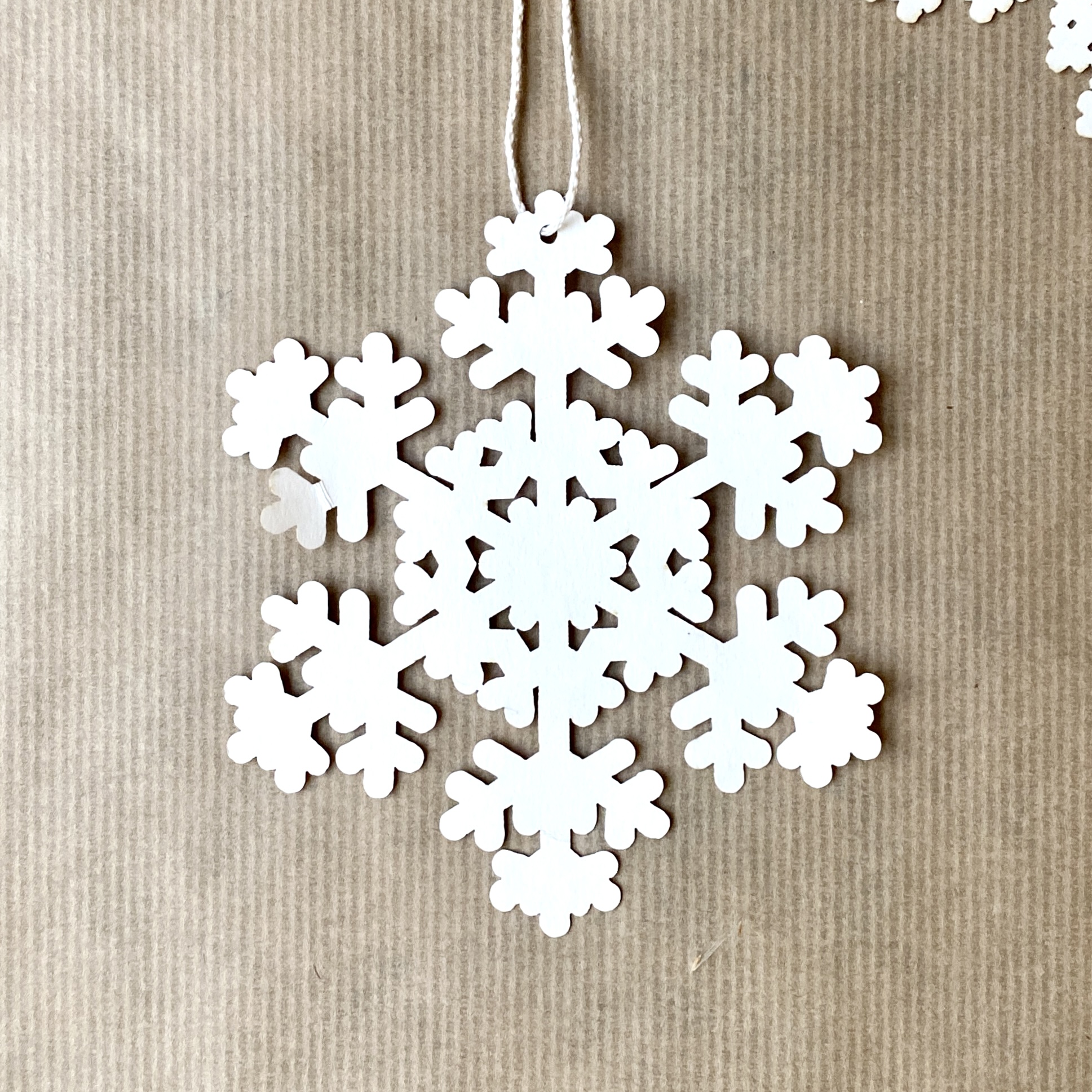 3er Set Schneeflocken aus Papier zum aufhängen mit weißem Band.