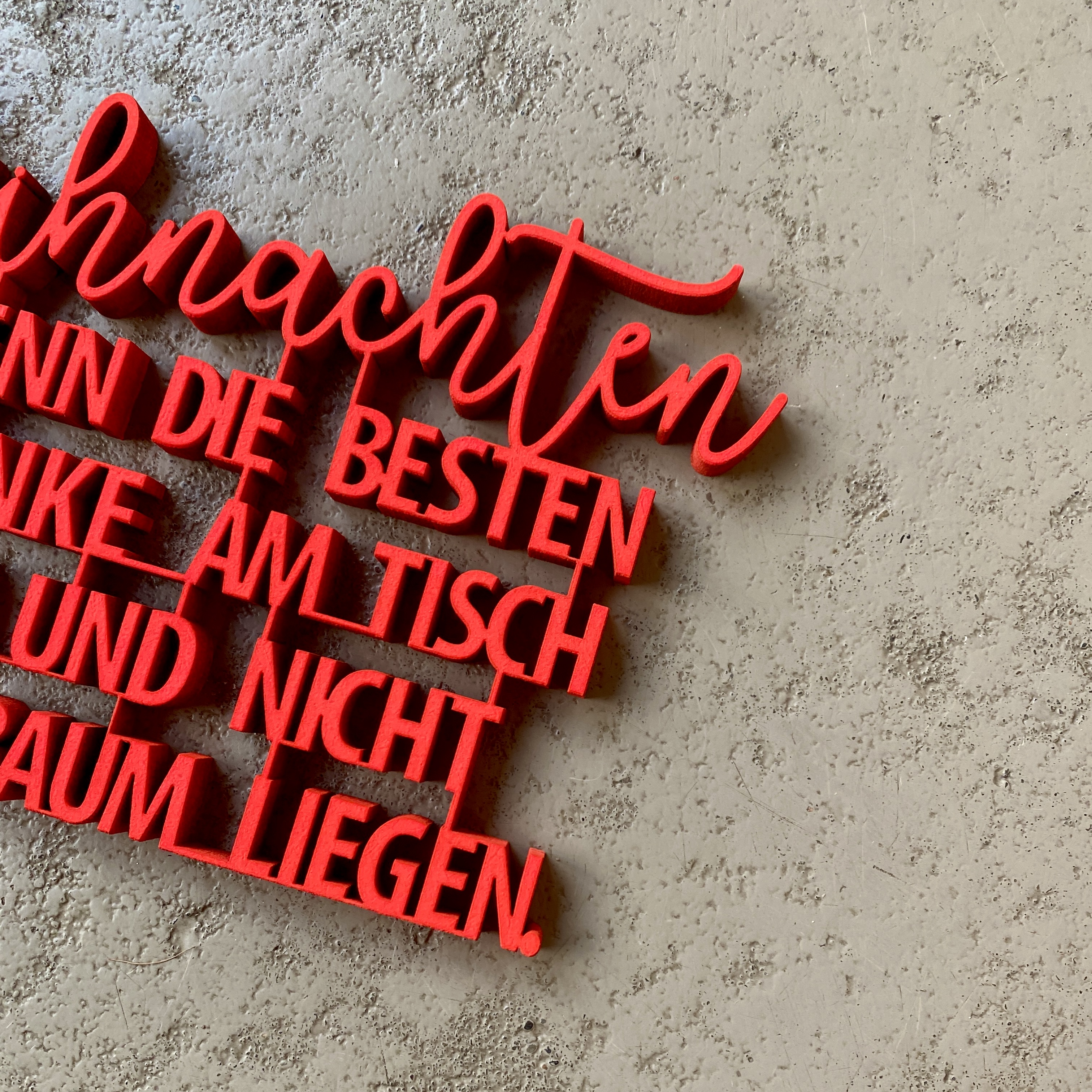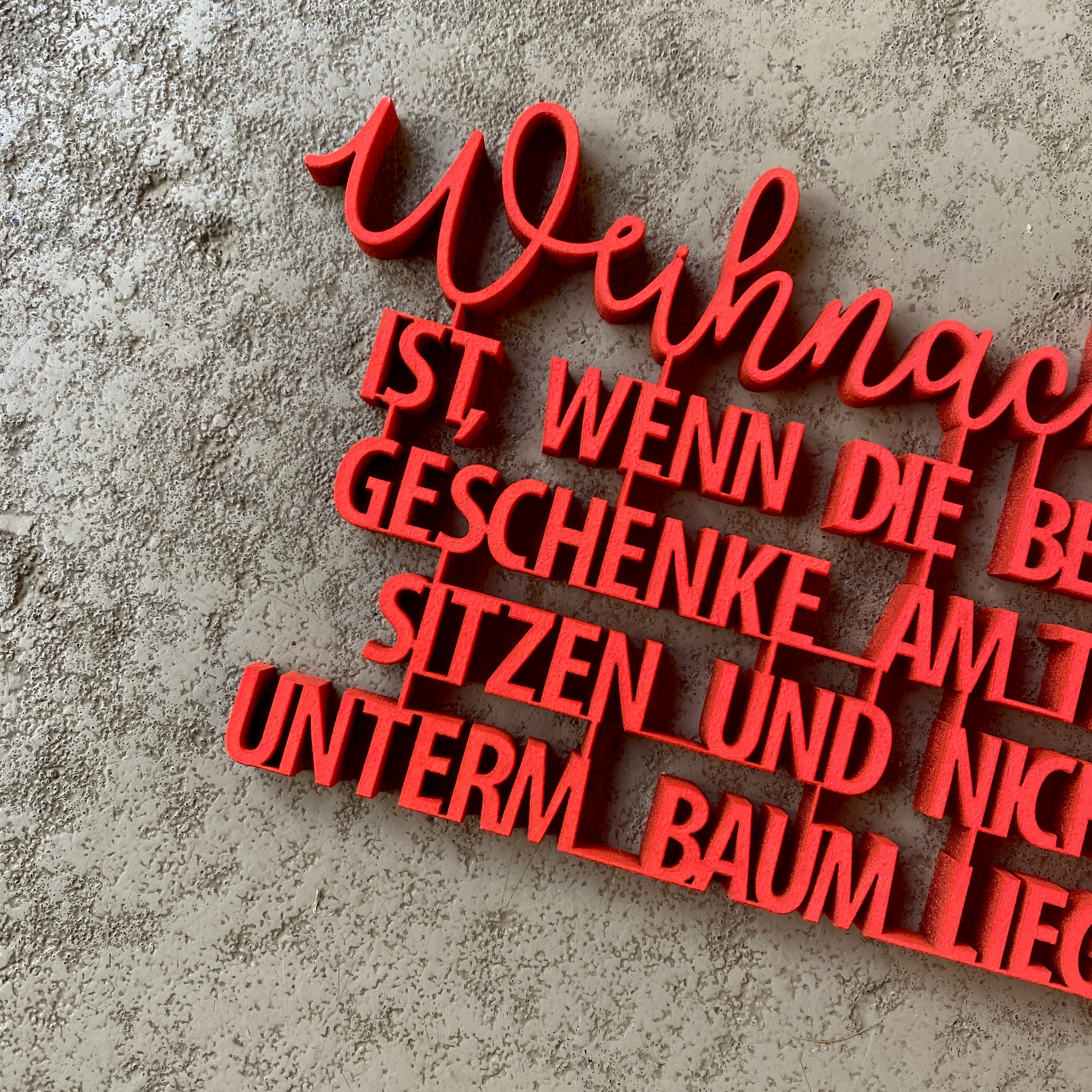 Schriftzug "Weihnachten IST, WENN DIE BESTEN GESCHENKE AM TISCH SITZEN UND NICHT UNTERM BAUM LIEGEN" neonrot