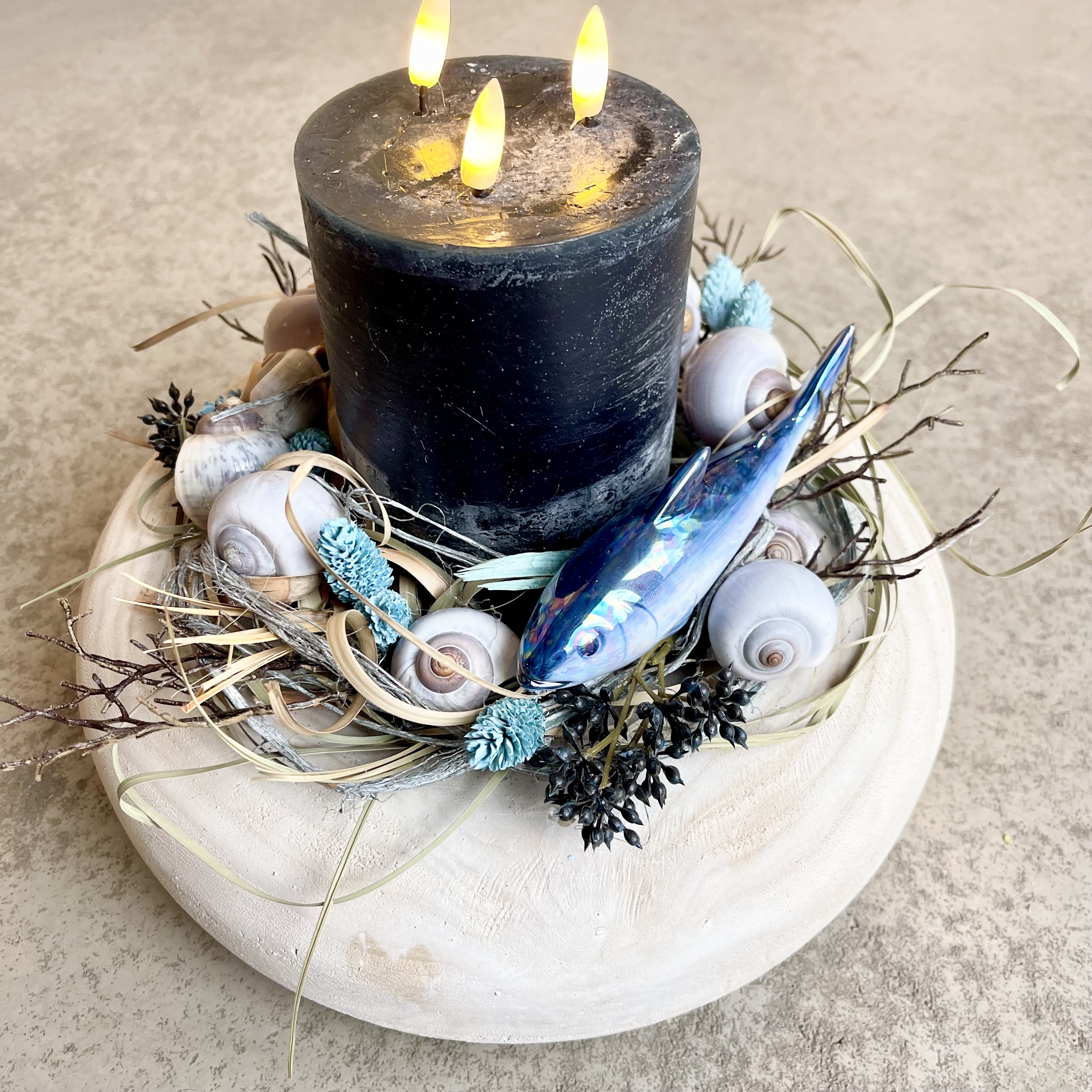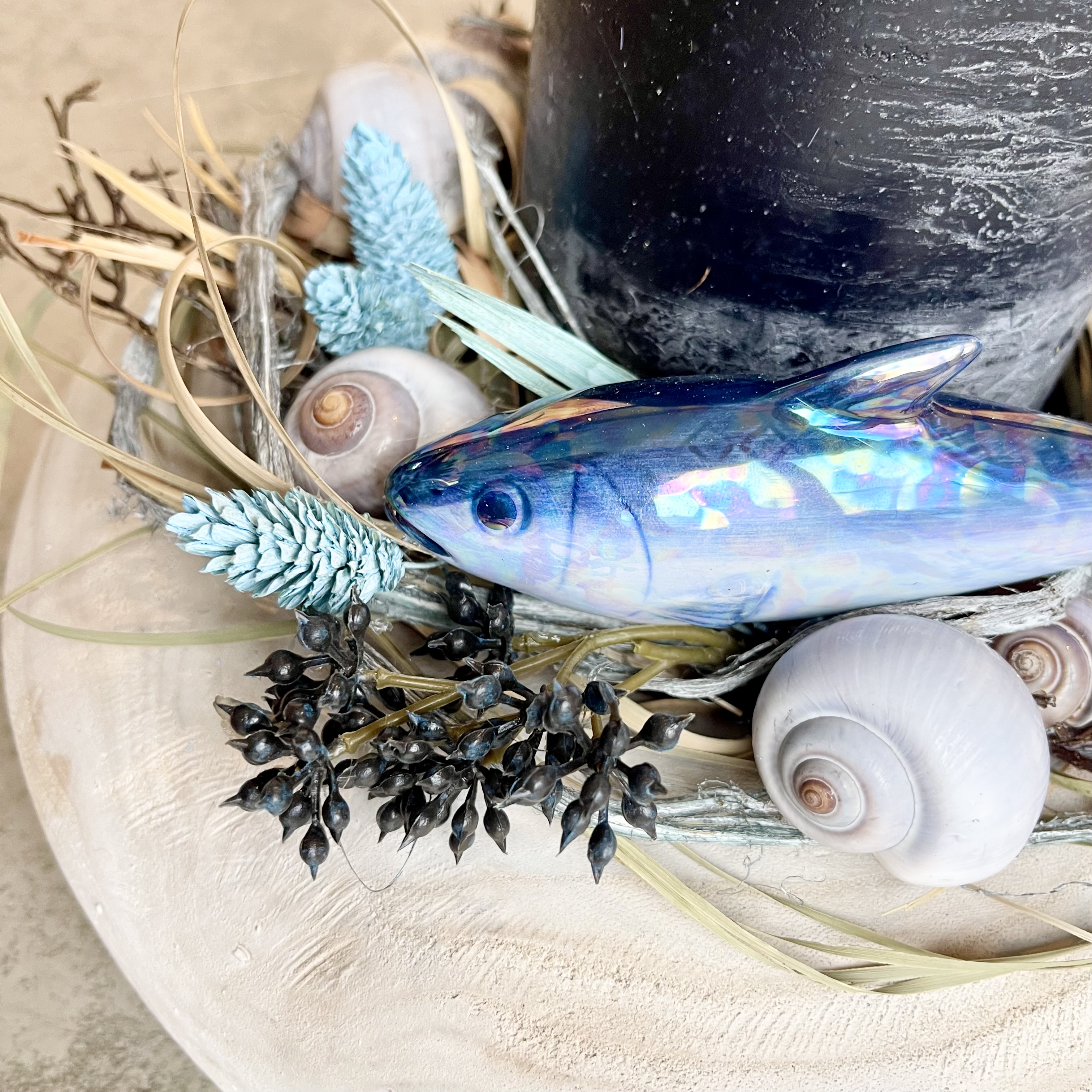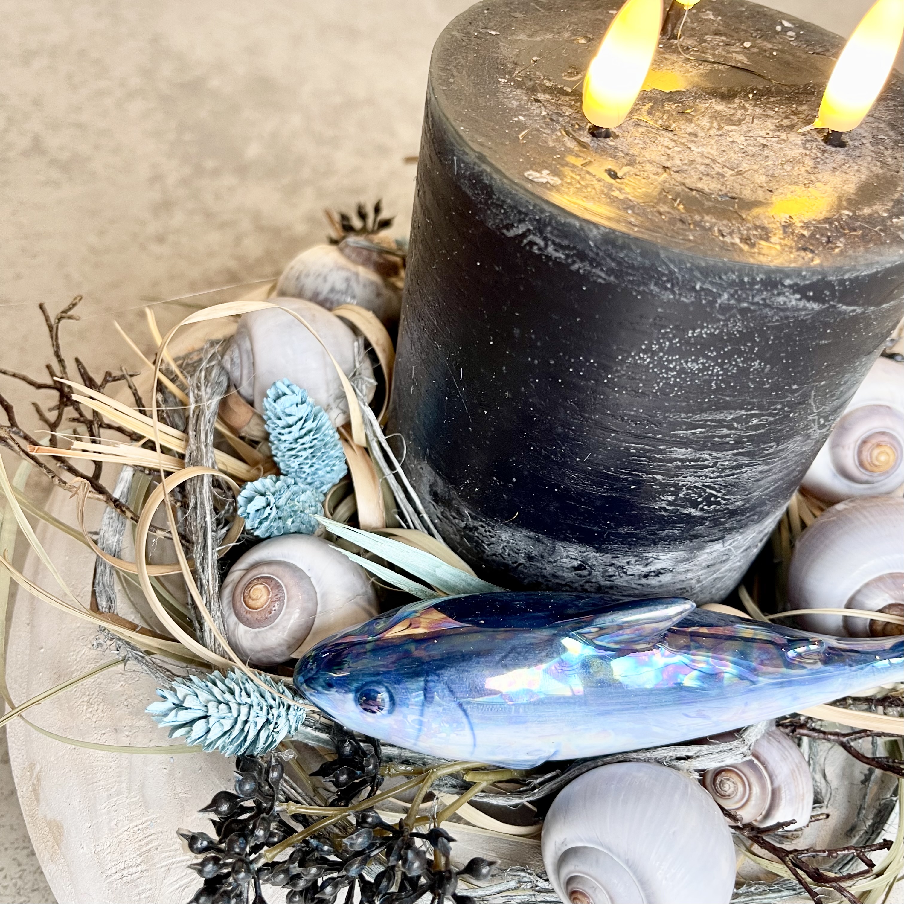 Maritimer Sommerkranz in Blau Natur Weiß, mit Drei-Docht-LED Kerze, Keramikfisch in wunderbaren Meerestönen