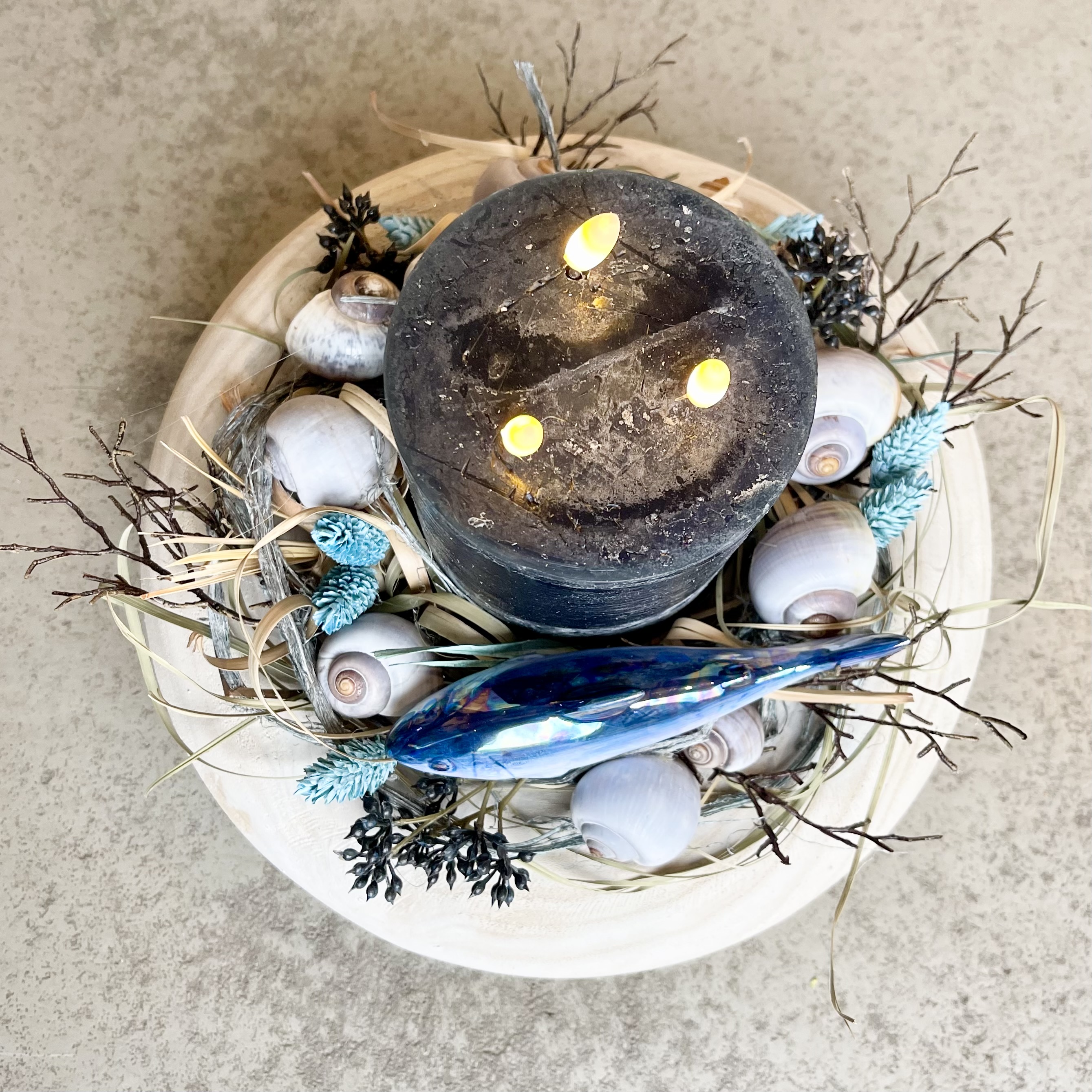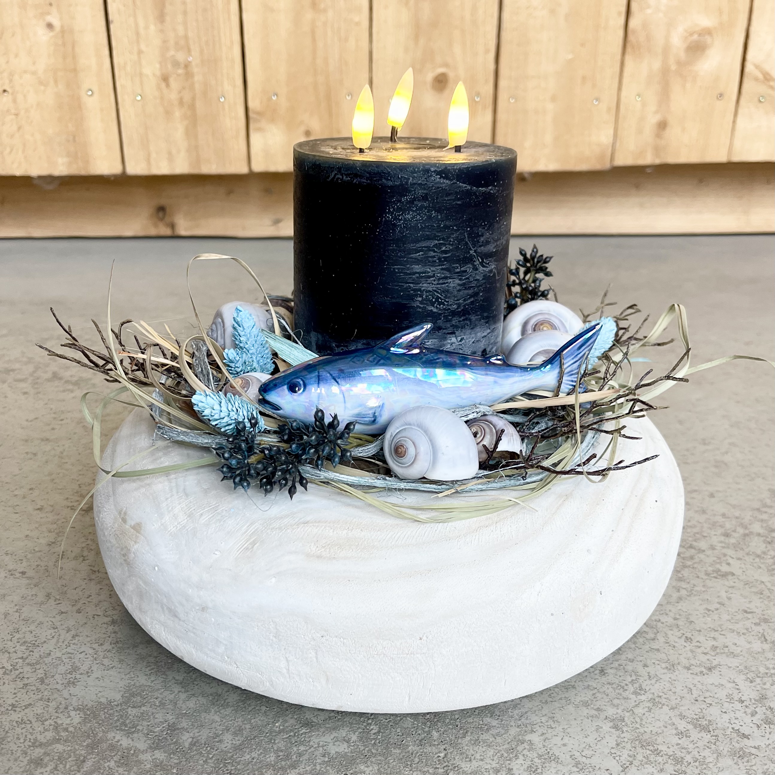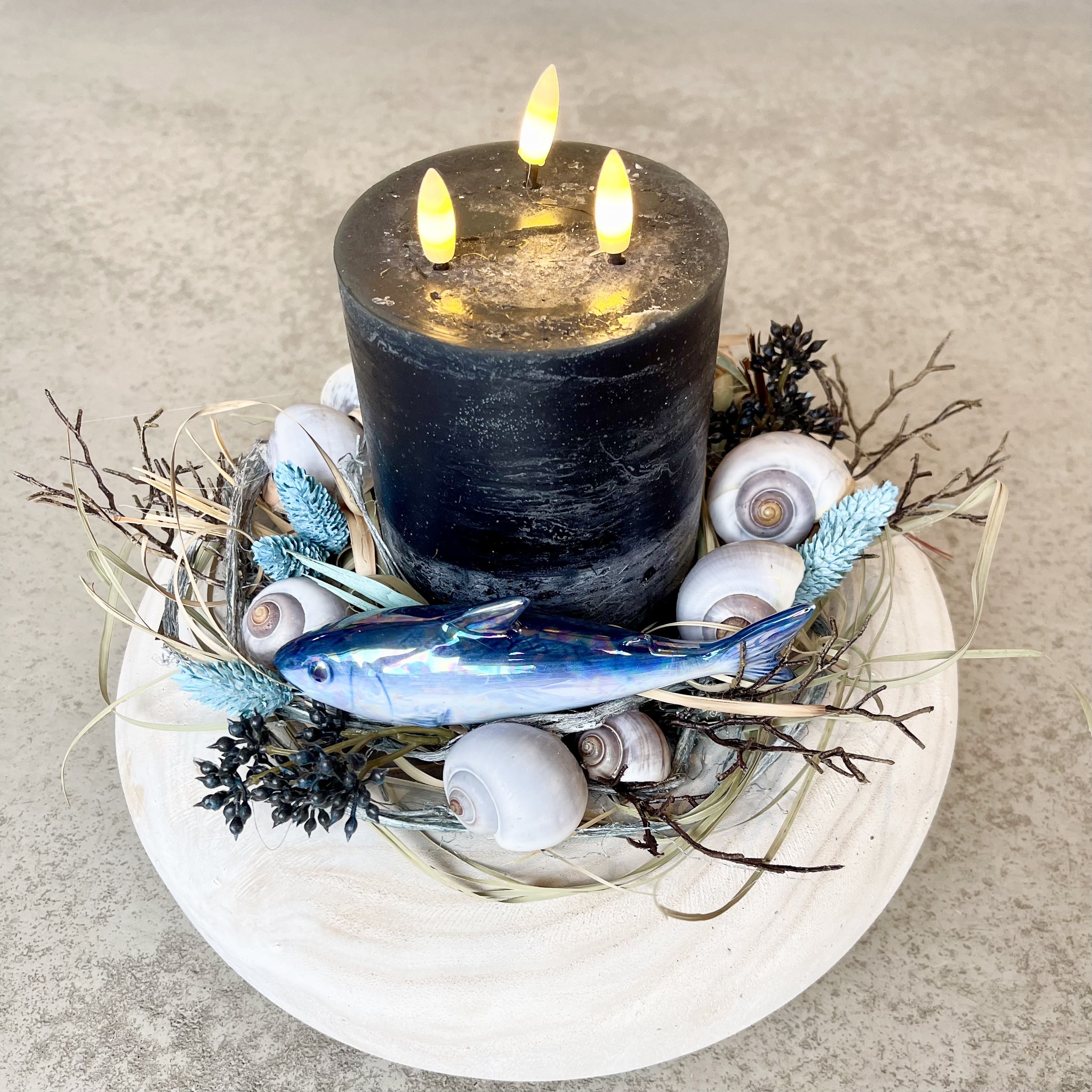 Maritimer Sommerkranz in Blau Natur Weiß, mit Drei-Docht-LED Kerze, Keramikfisch in wunderbaren Meerestönen