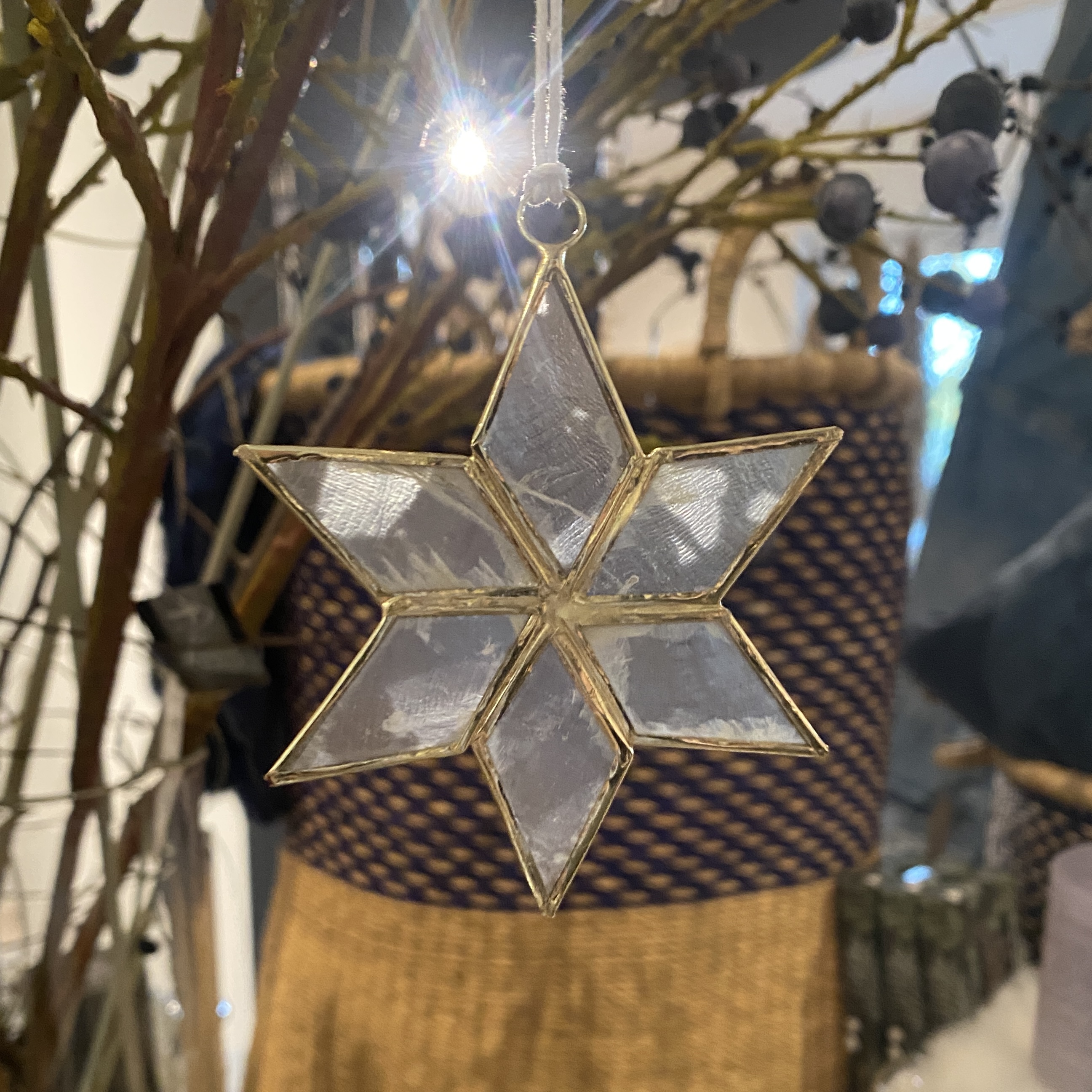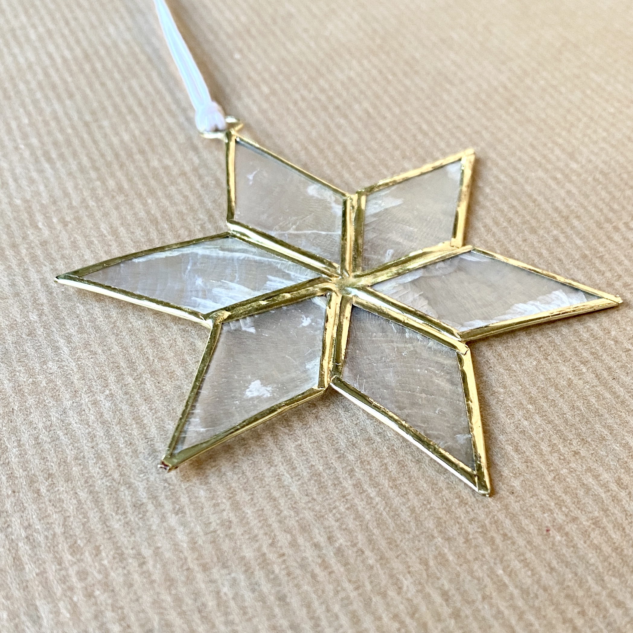 Handgefertigter kleiner Stern in Gold und Perlmutt, wunderschön als Baumschmuck, oder als Dekoanhänger. Mit langer Aufhängeschnur 48cm.