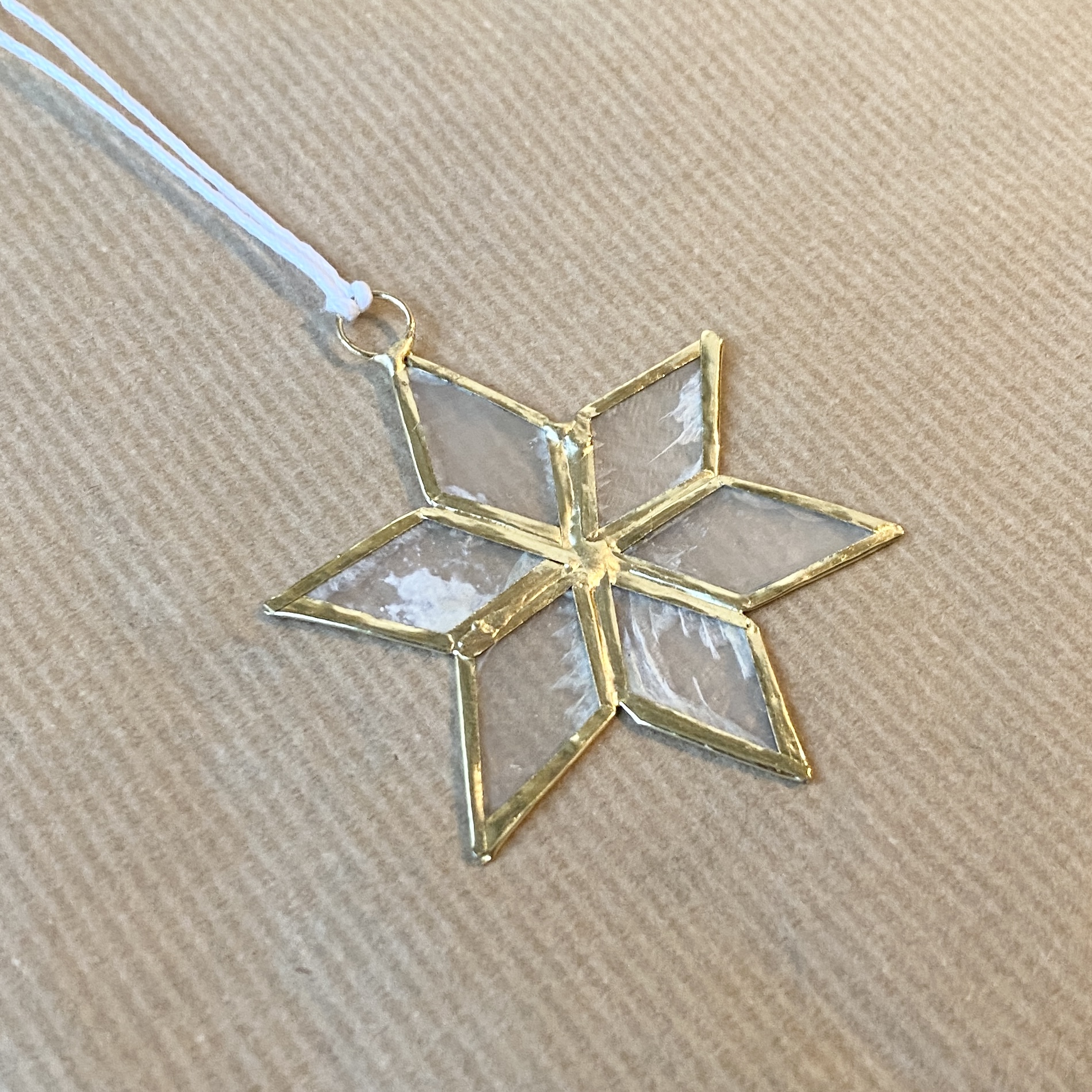 Handgefertigter kleiner Stern in Gold und Perlmutt, wunderschön als Baumschmuck, oder als Dekoanhänger. Mit langer Aufhängeschnur 48cm.