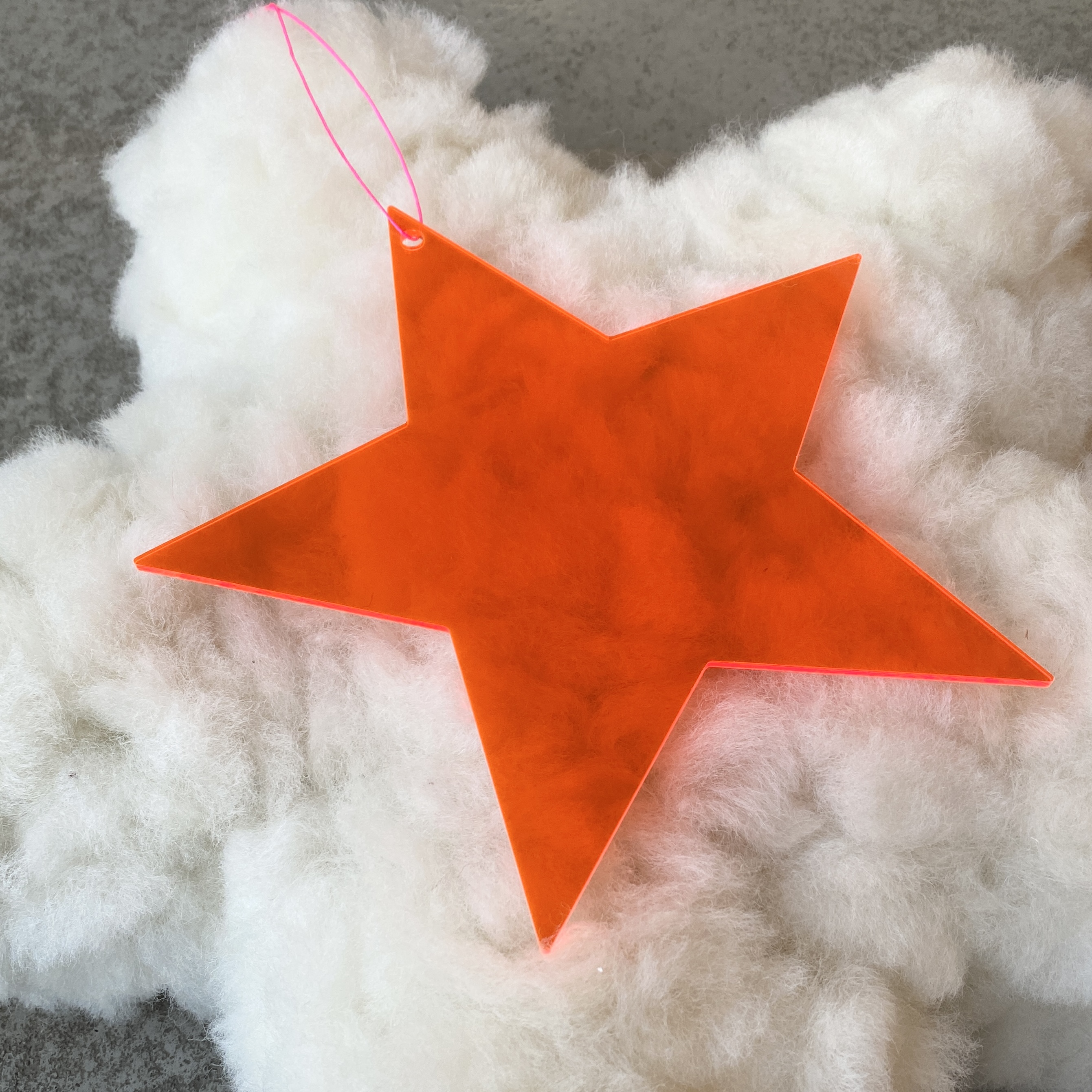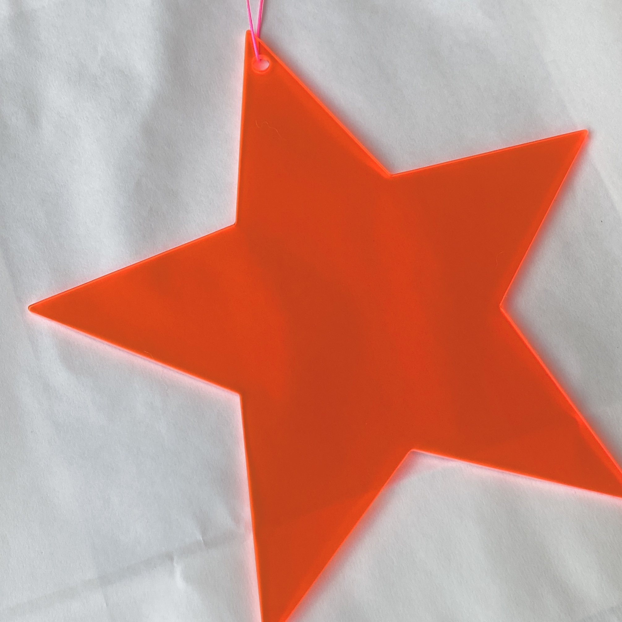 Großer Stern aus Acryl in Neon Orange, transparent, mit pinkfarbener Kordel zum aufhängen.