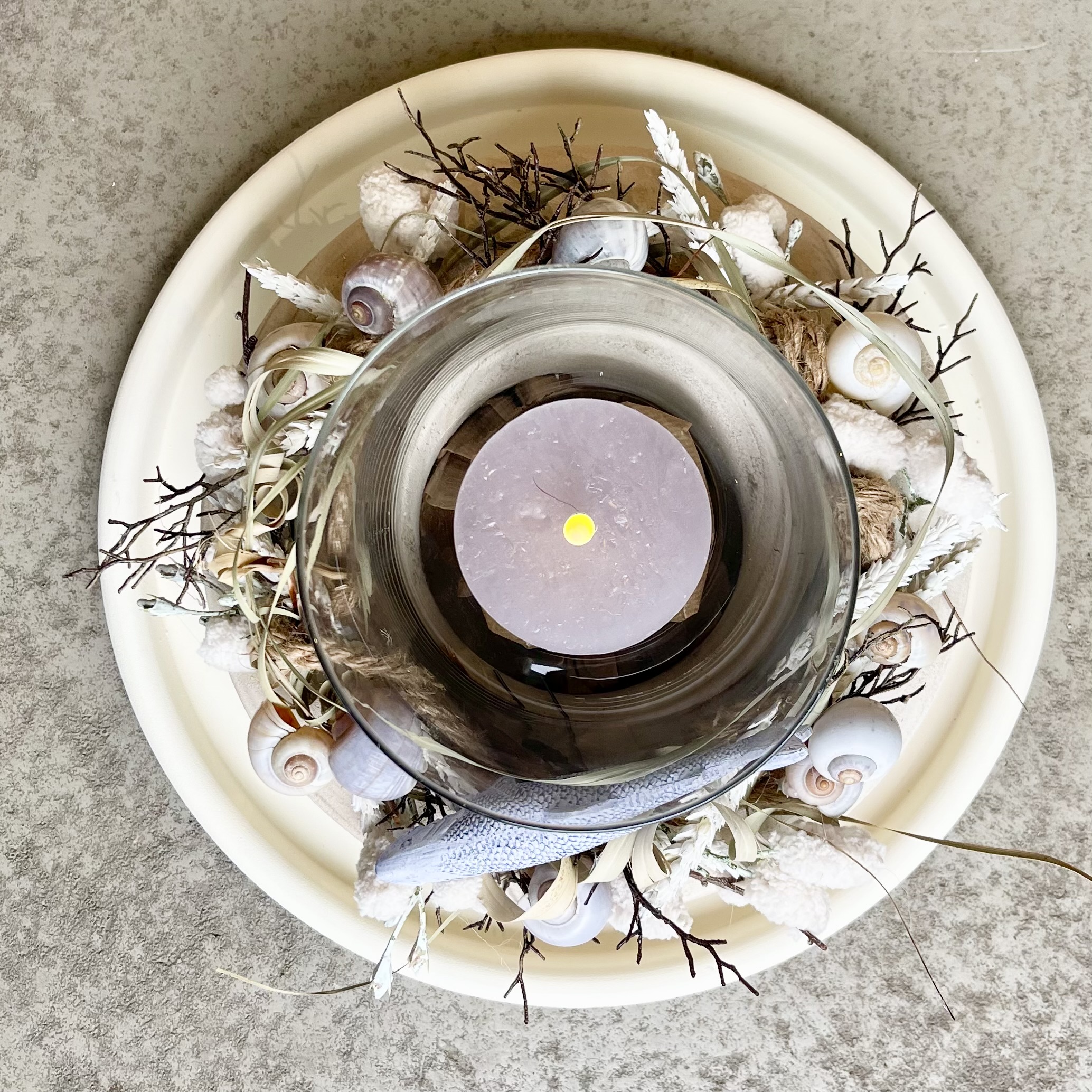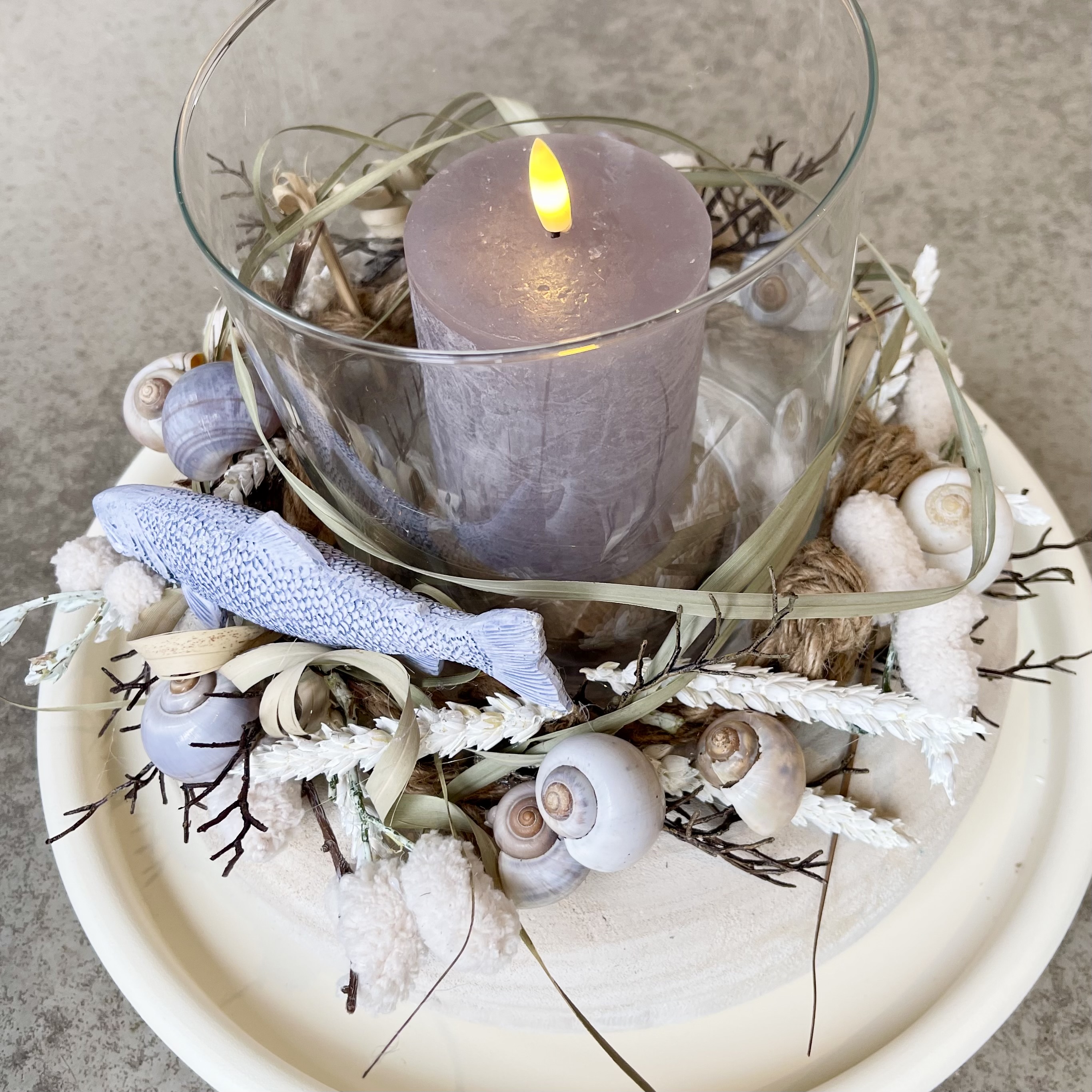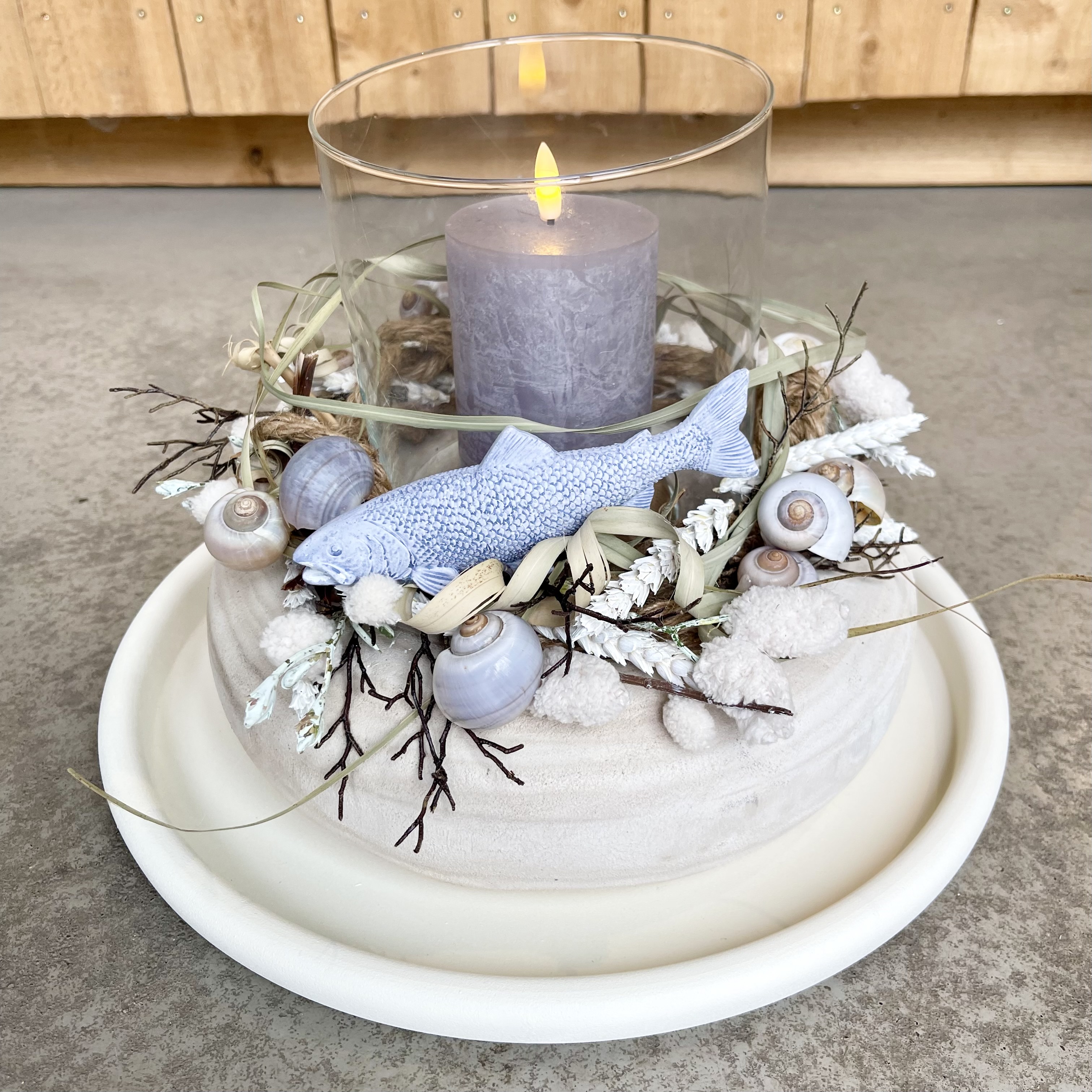 unser Holzkranz Blair in weiß gekälkt auf Metalltablett mit Windlichtglas und grauer LED Kerze,