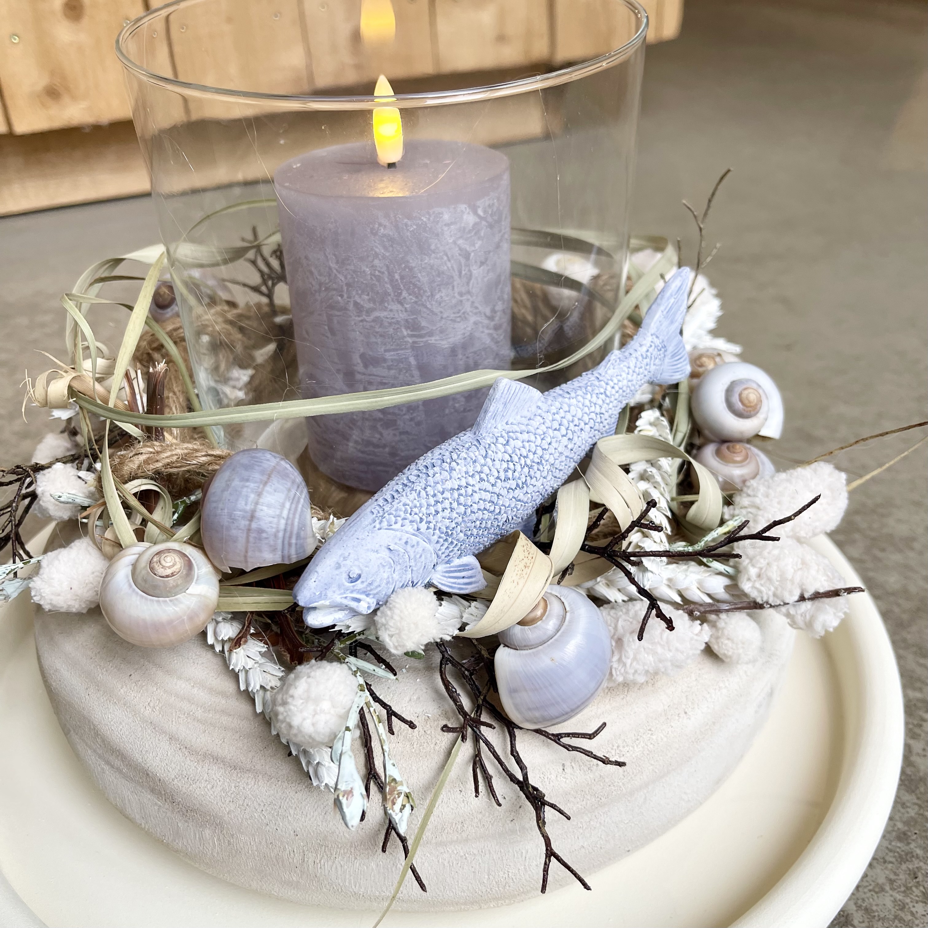 taubenblauer Fisch und Muscheln, wecken Urlaubssehnsüchte, ab auf die Insel.