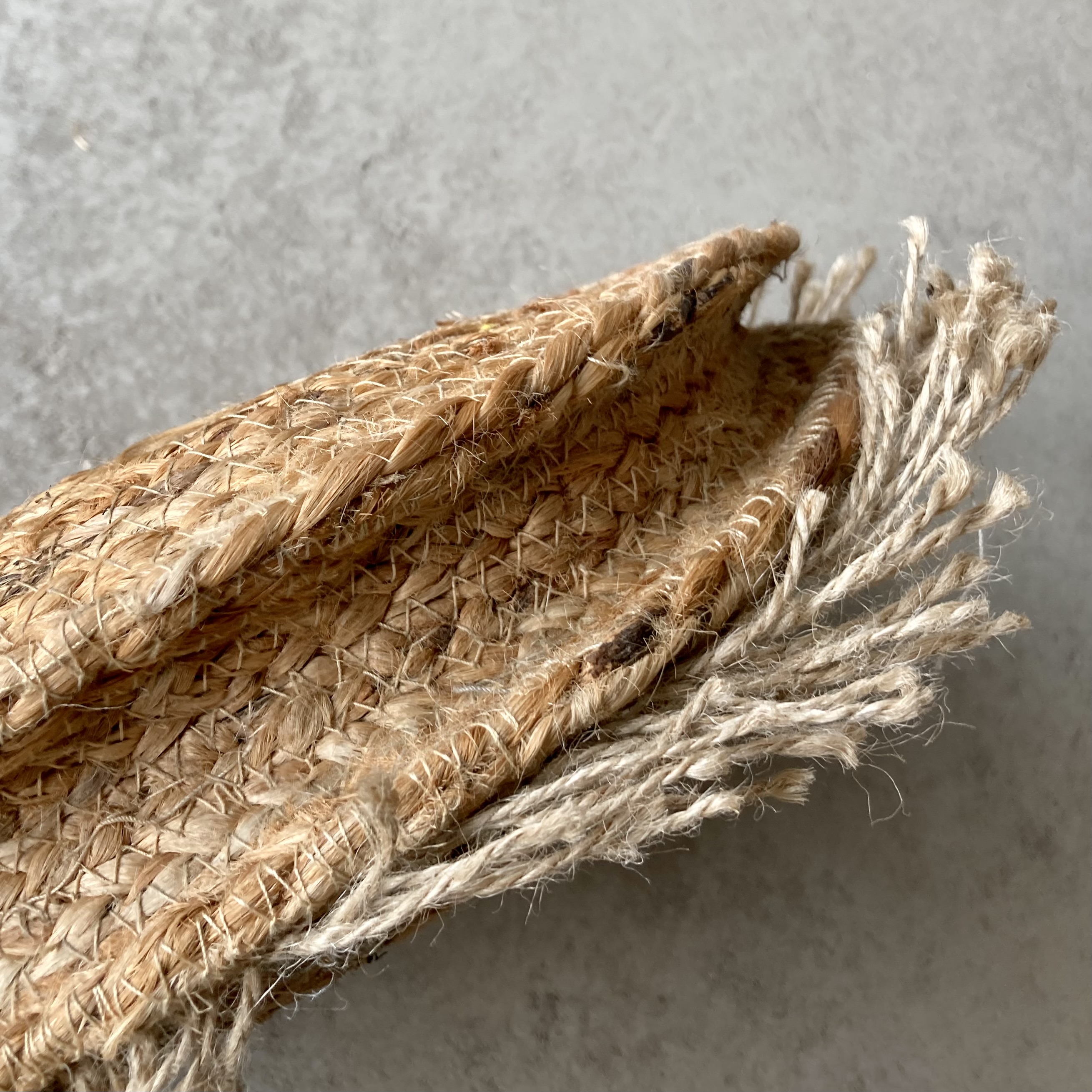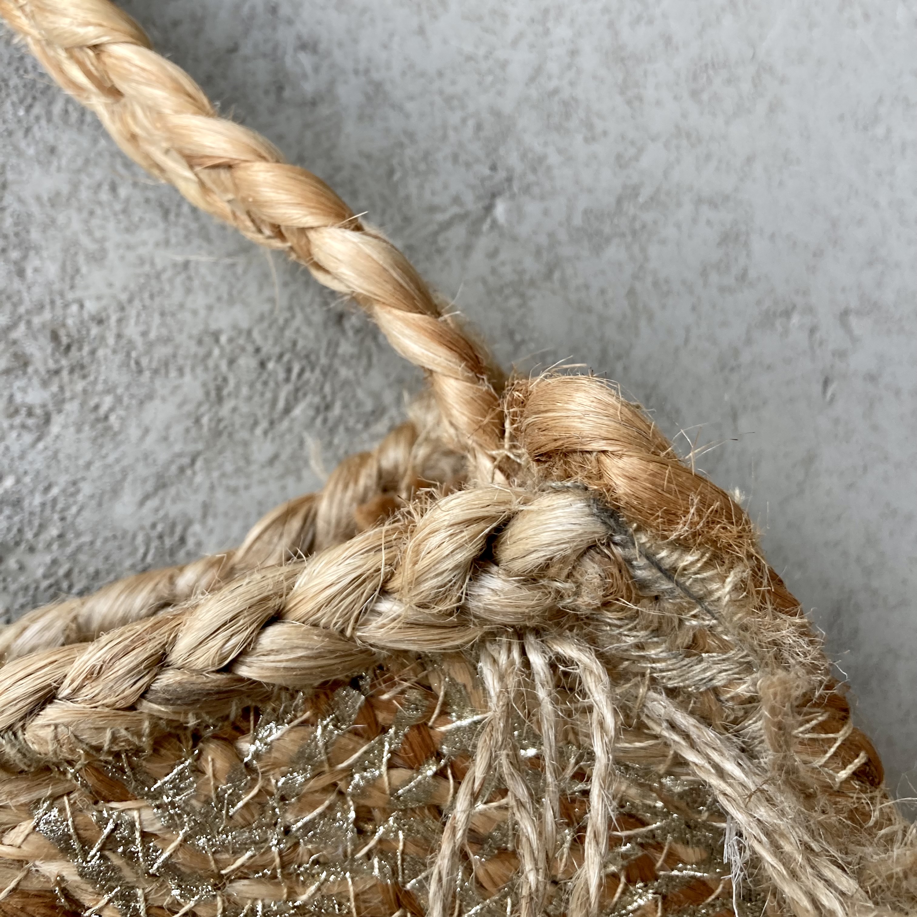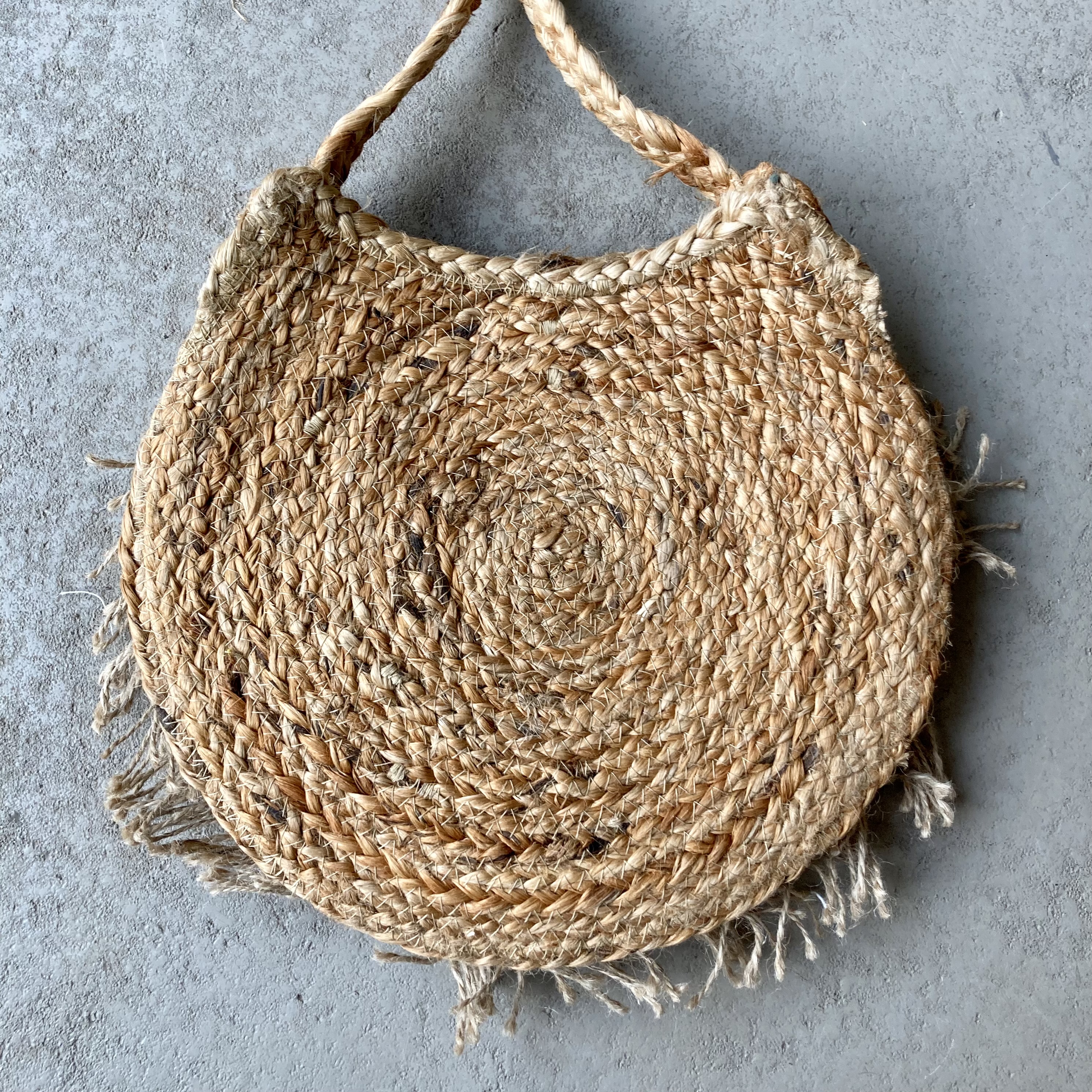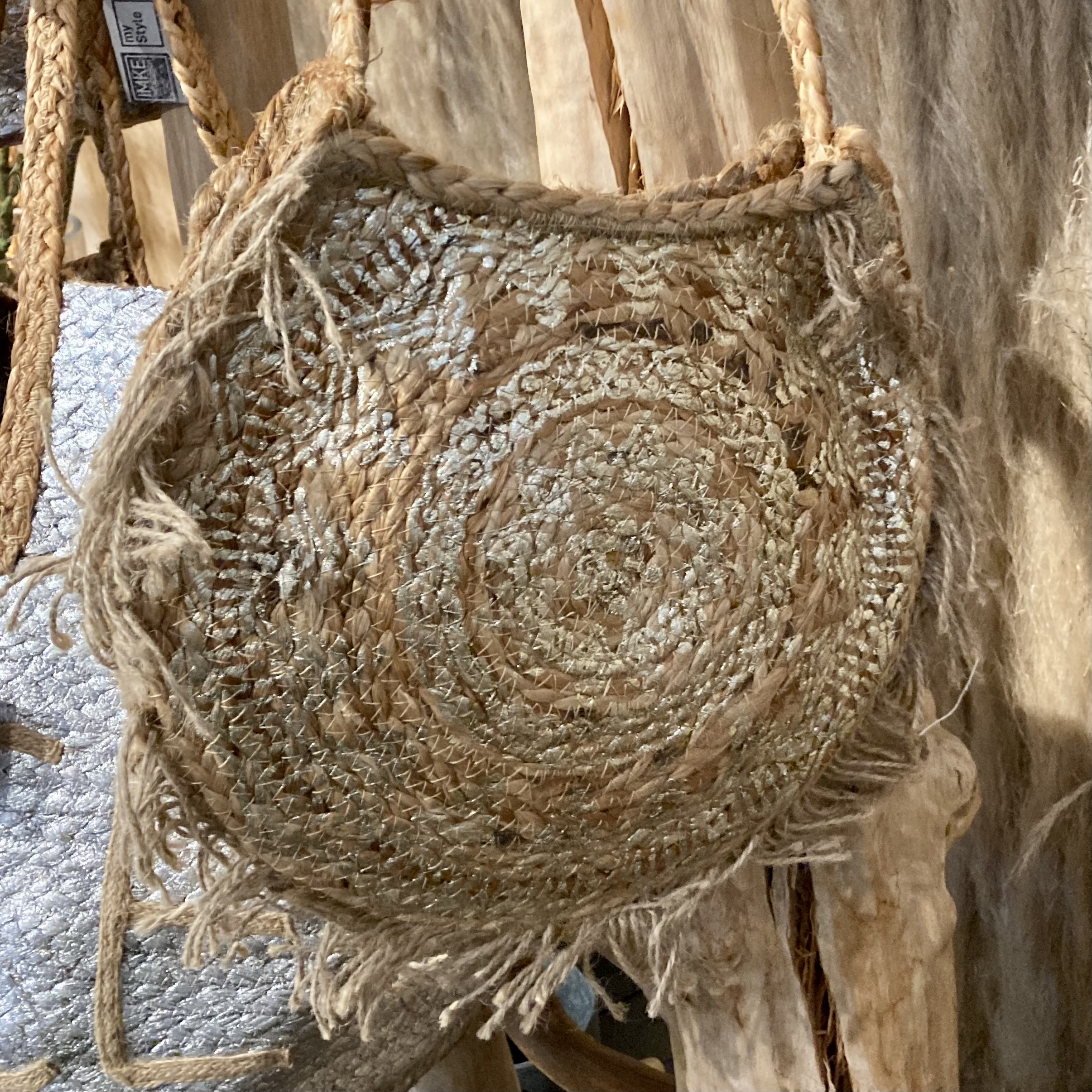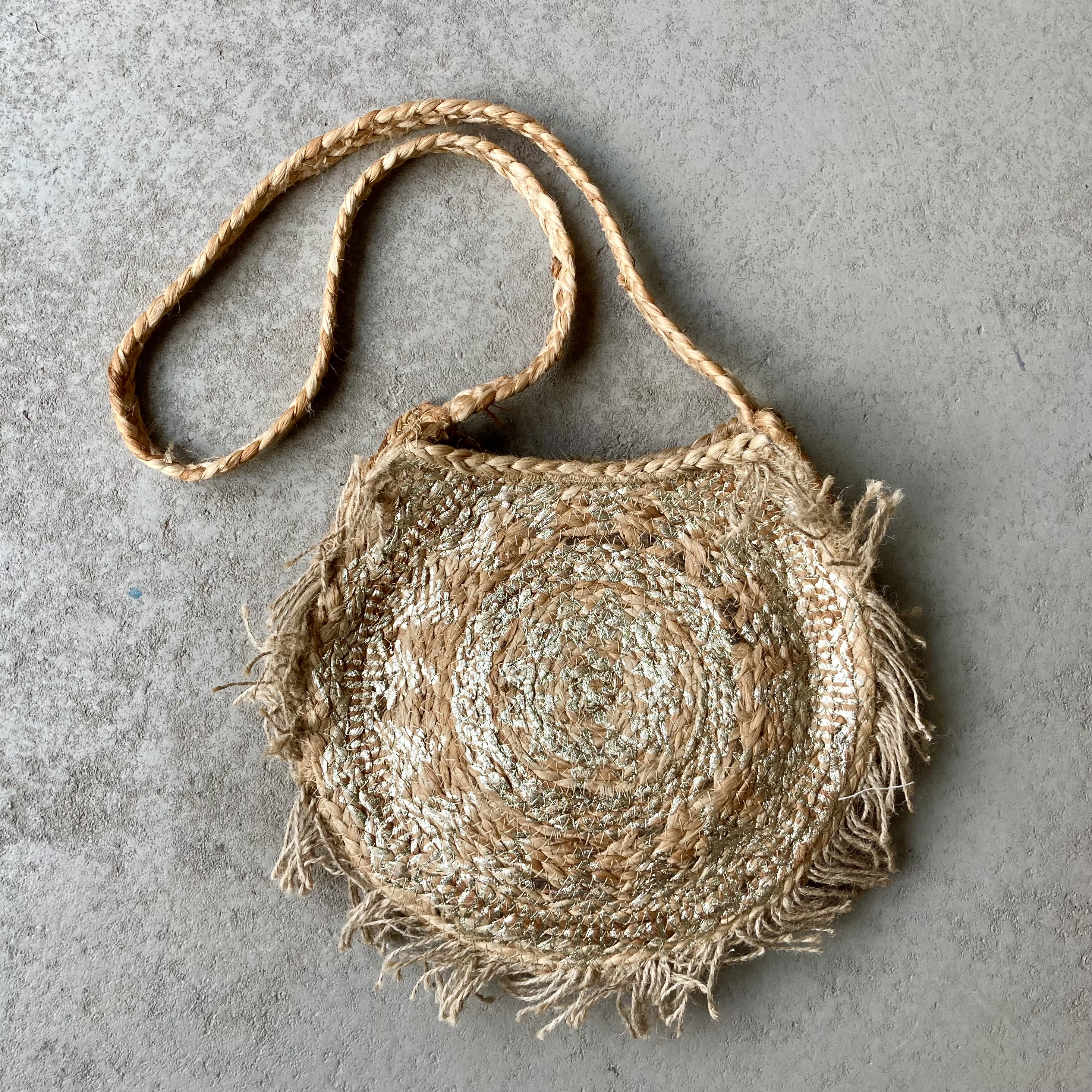 Runde Schultertasche für den Sommer in Natur mit Goldaufdruck.
