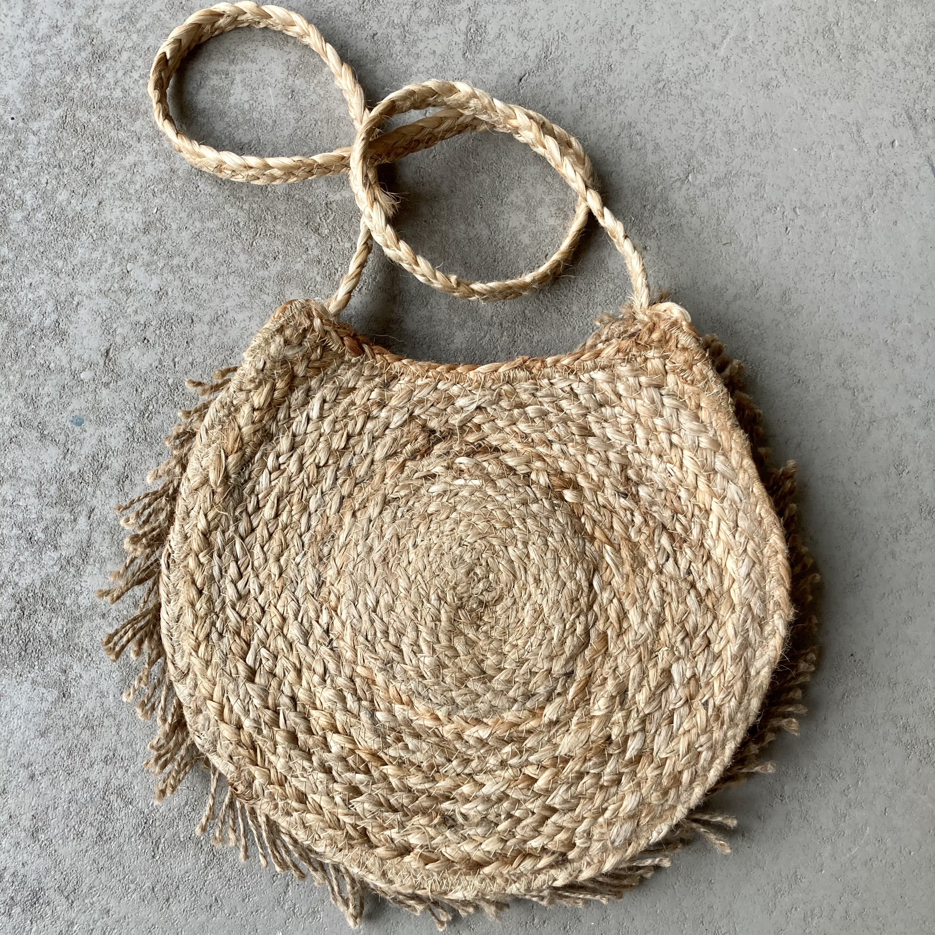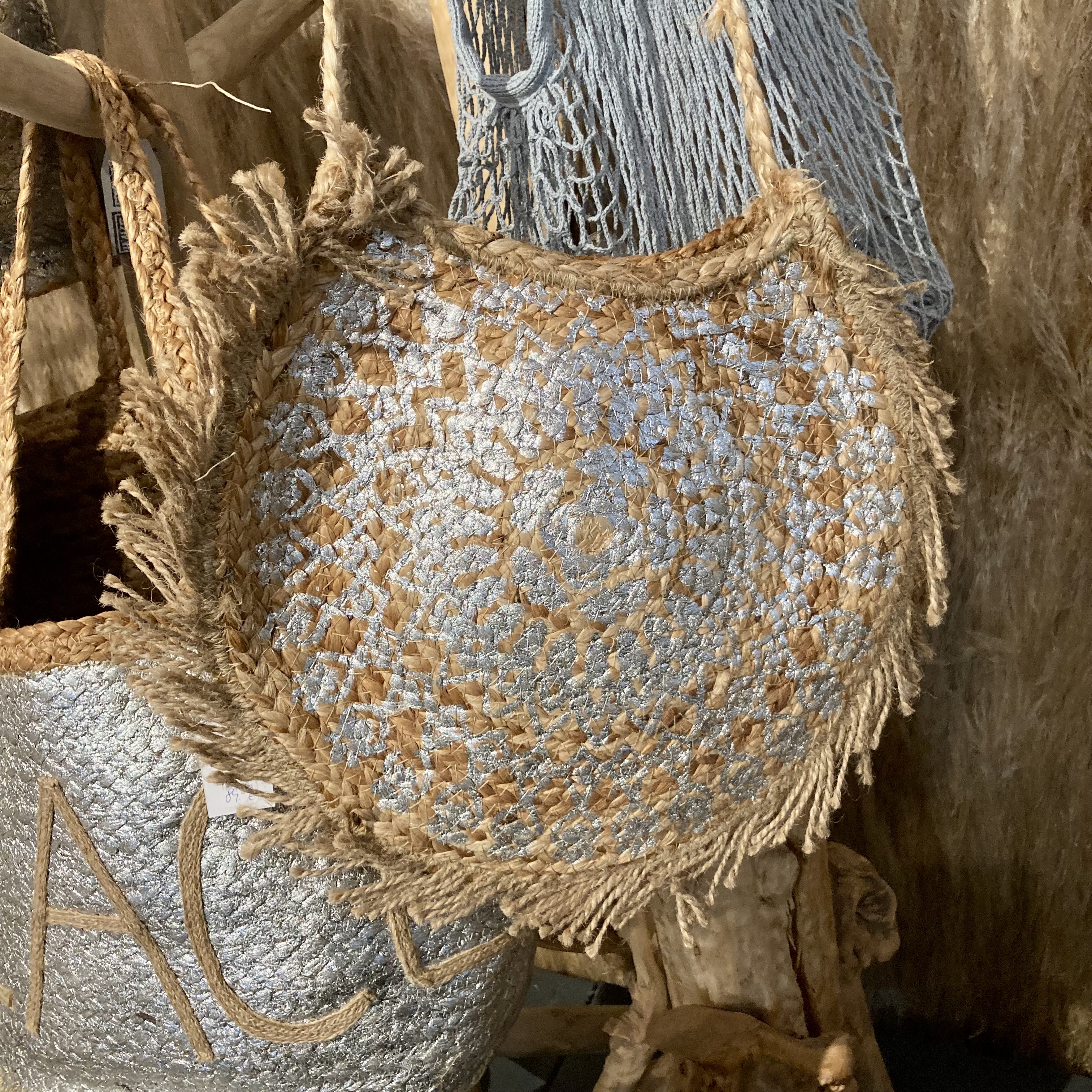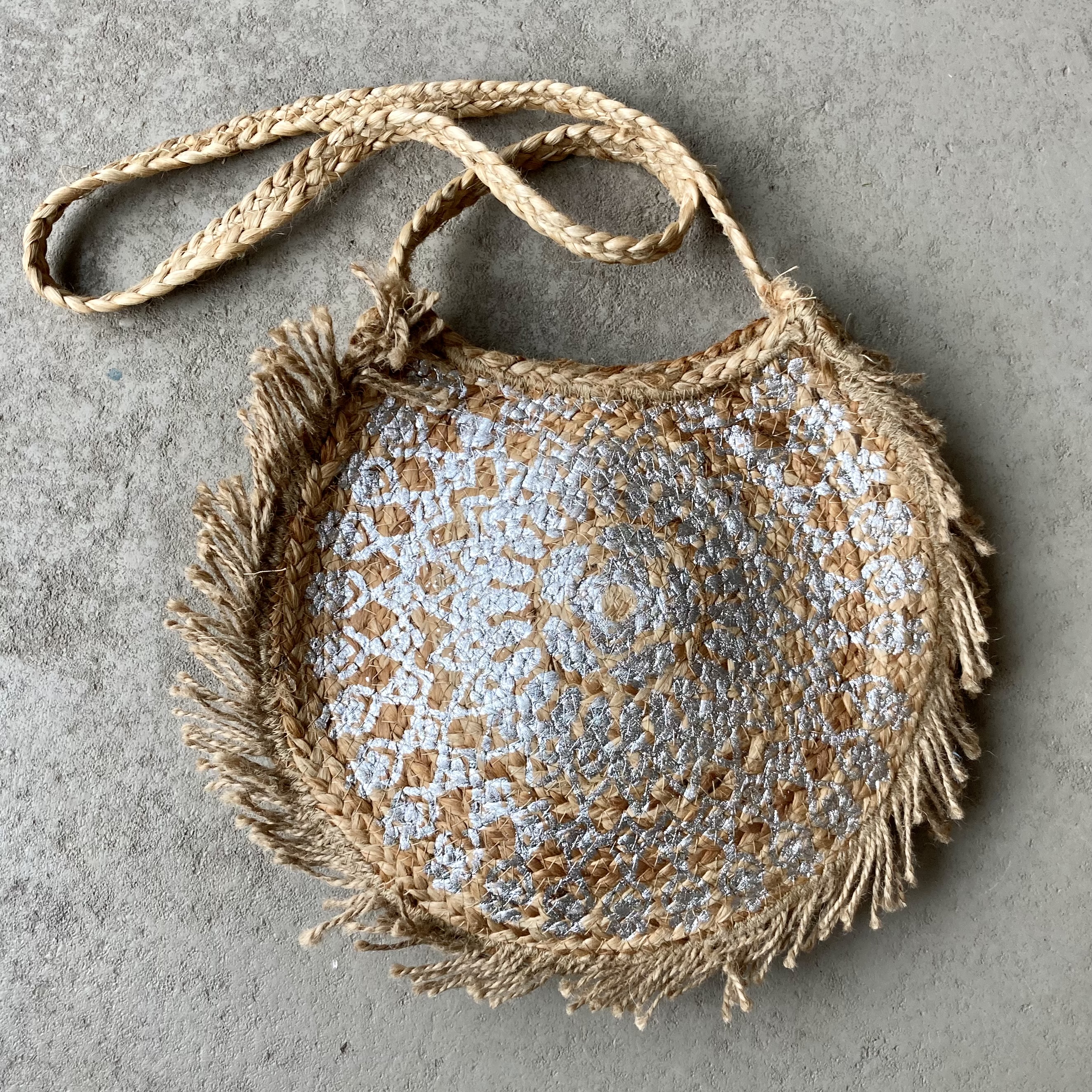 Runde Schultertasche für den Sommer in Natur mit Silberaufdruck.