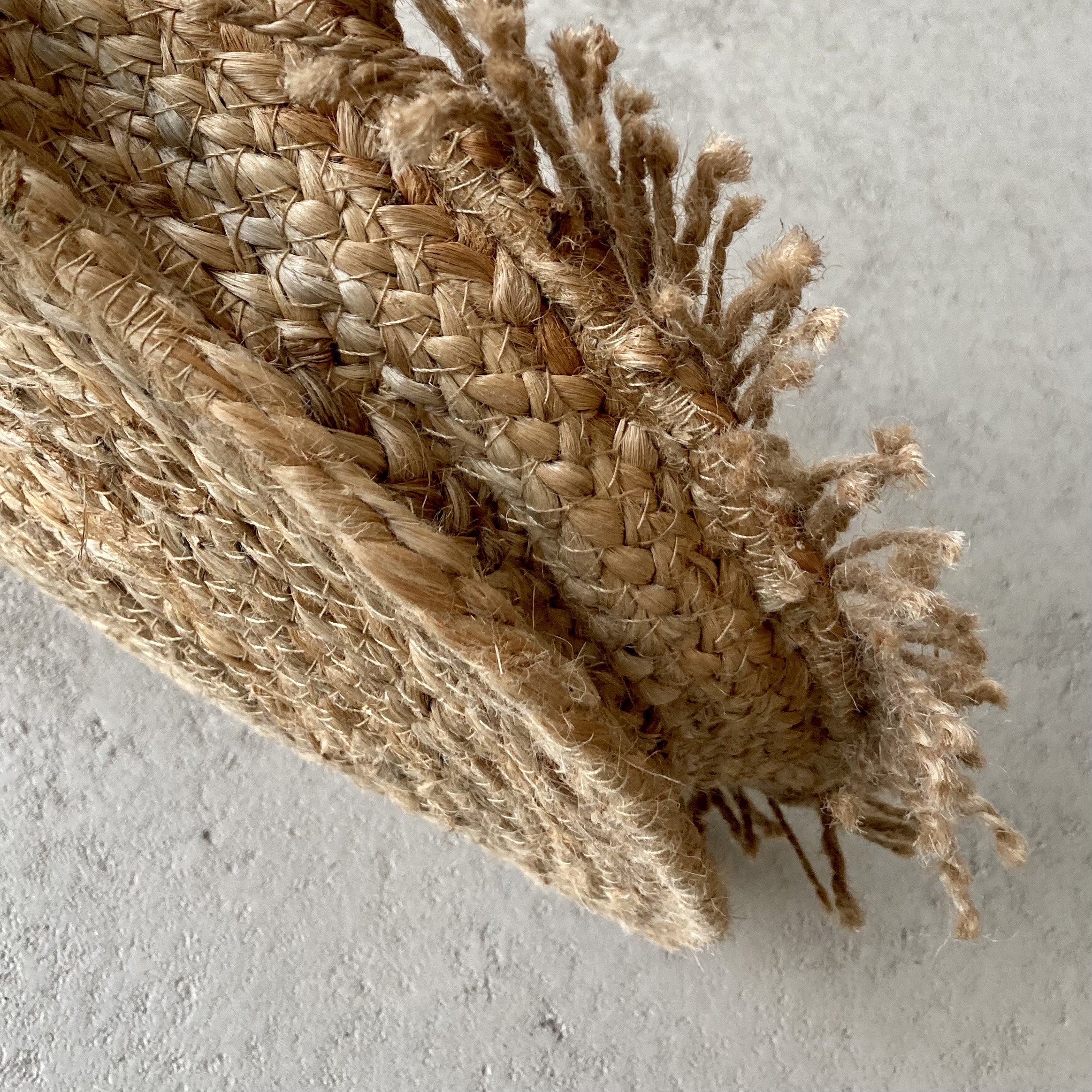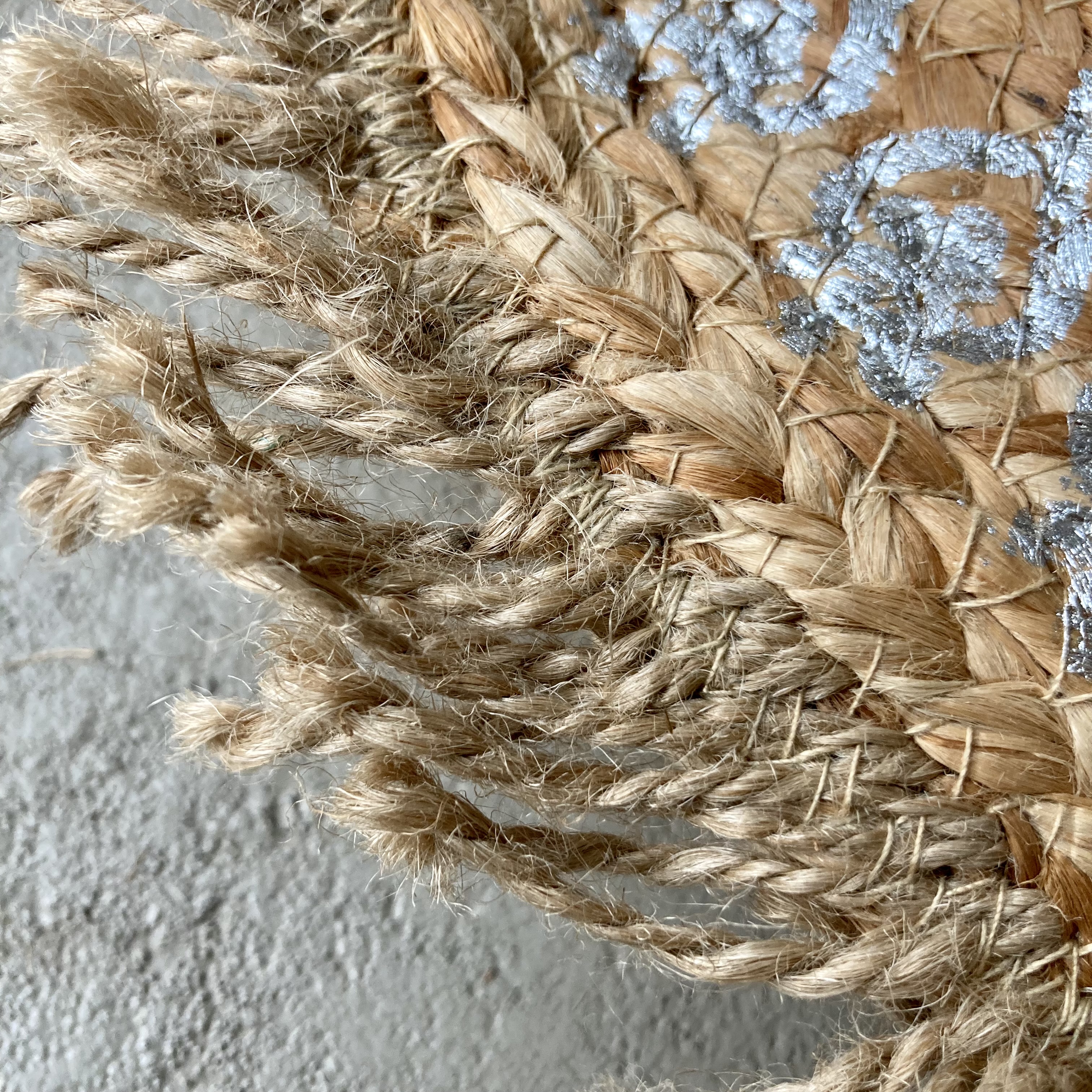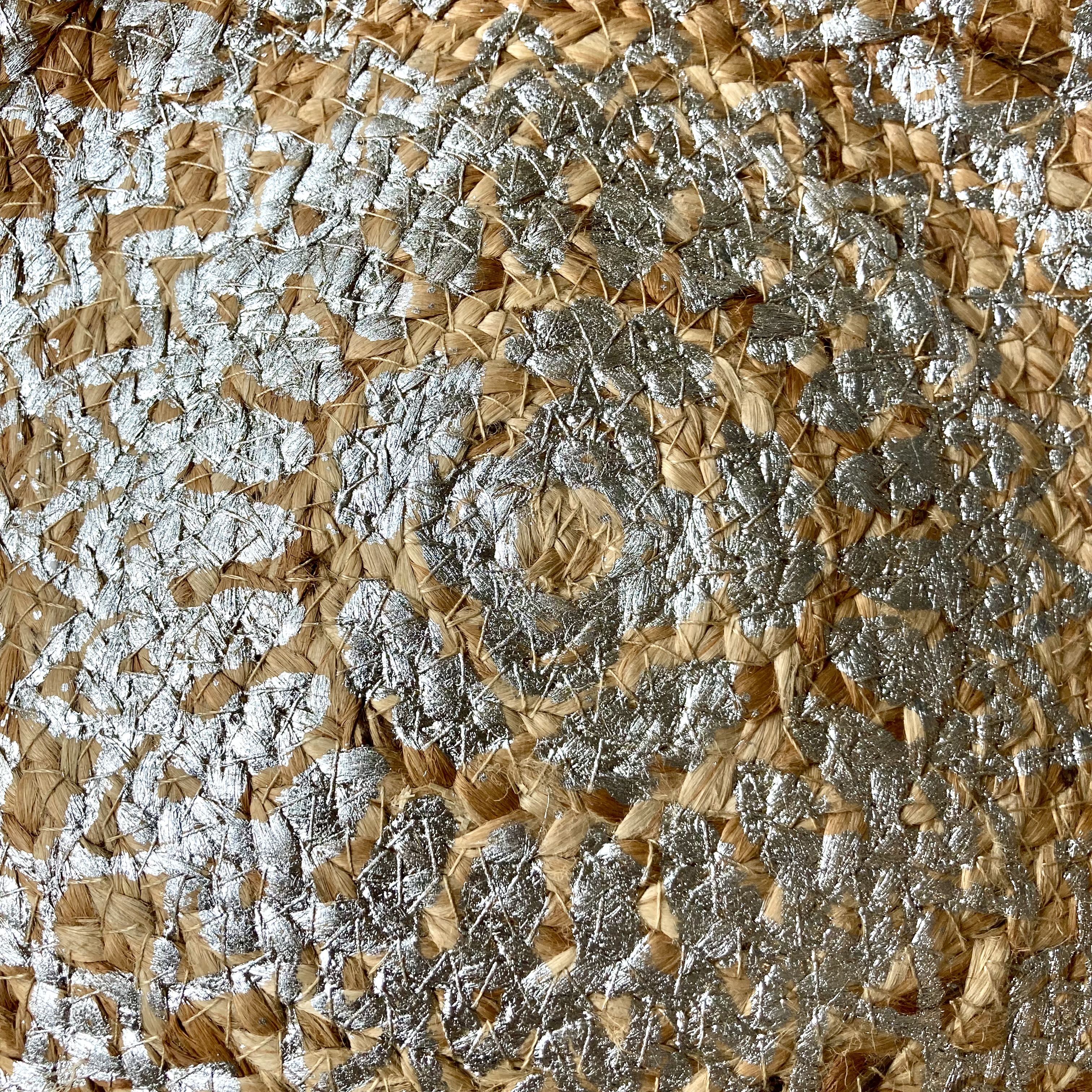 Runde Schultertasche für den Sommer in Natur mit Silberaufdruck.