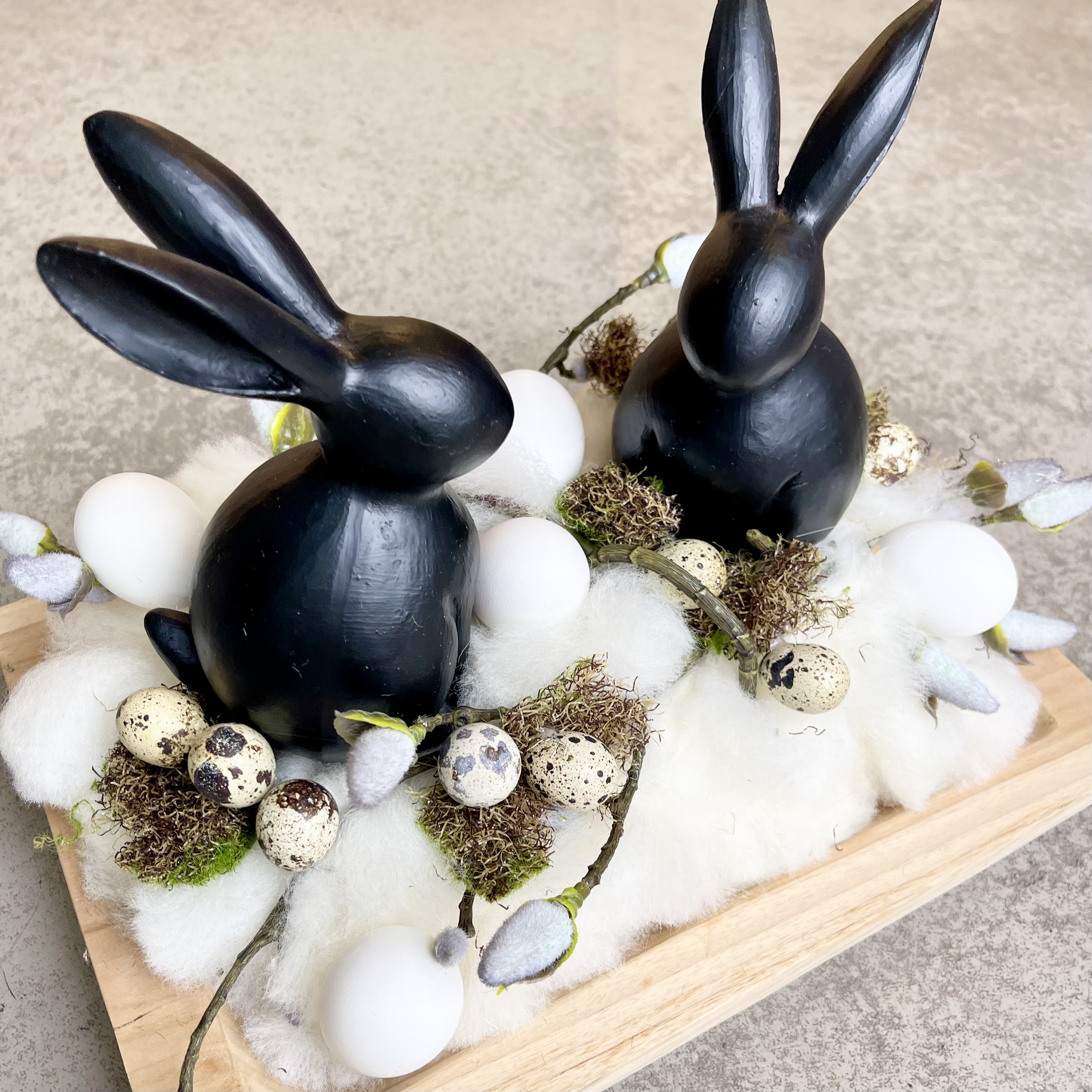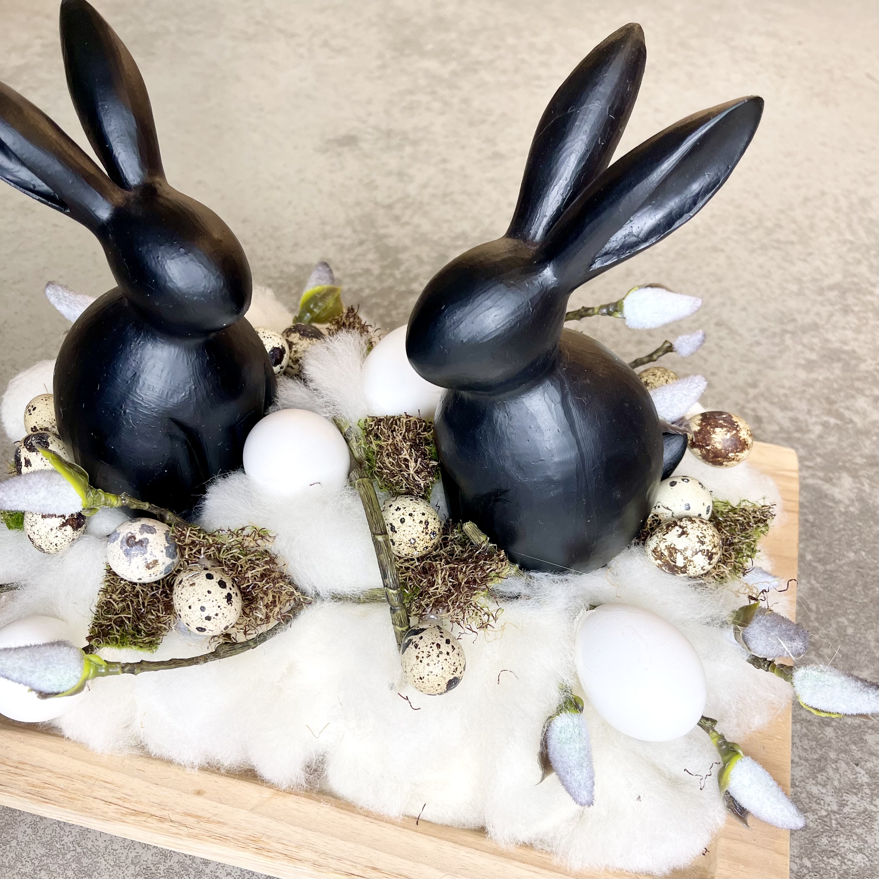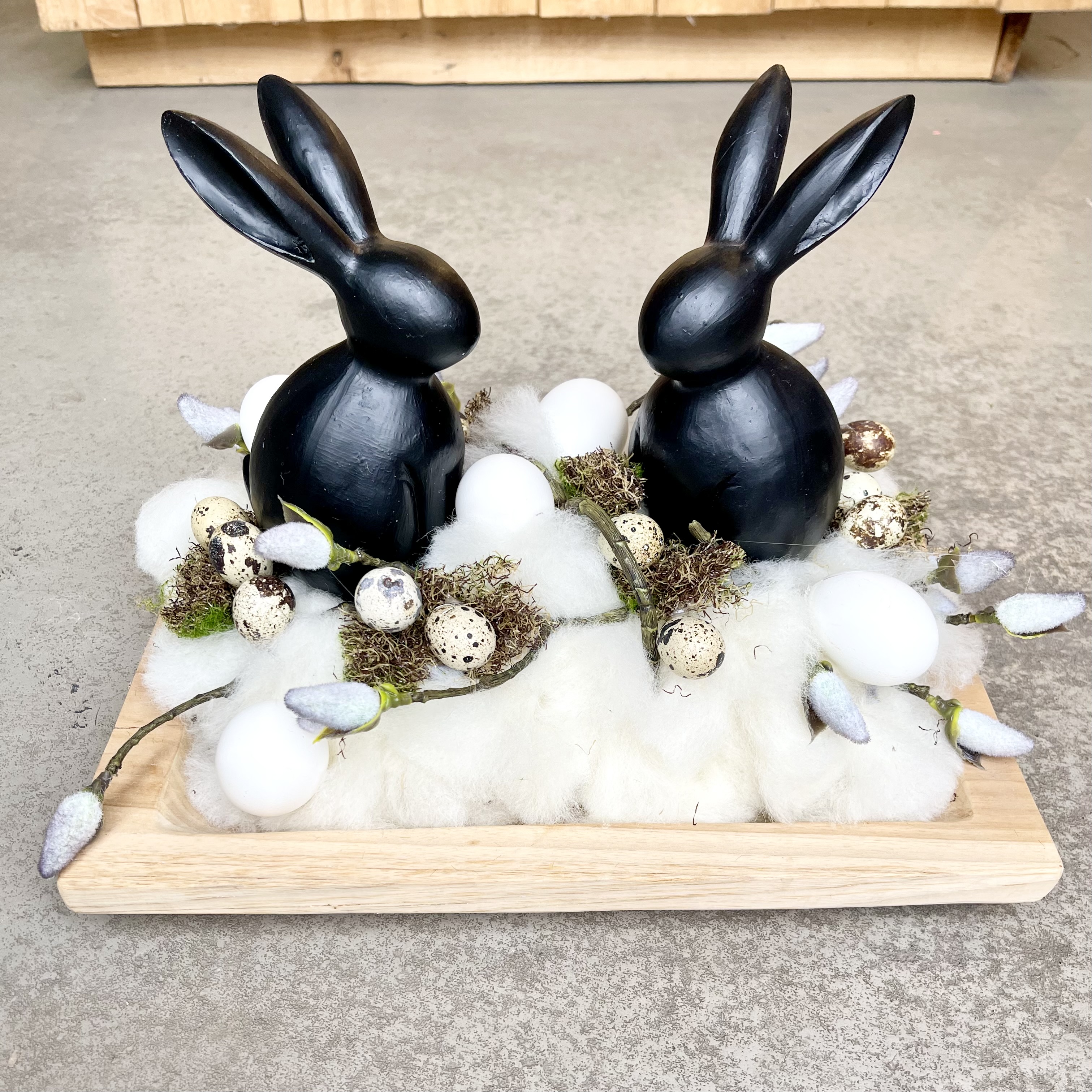 Massives rechteckiges Holztablett österlich- natürlich gestaltet, zwei schwarze Hasen im Lunte-Wolle Nest mit
