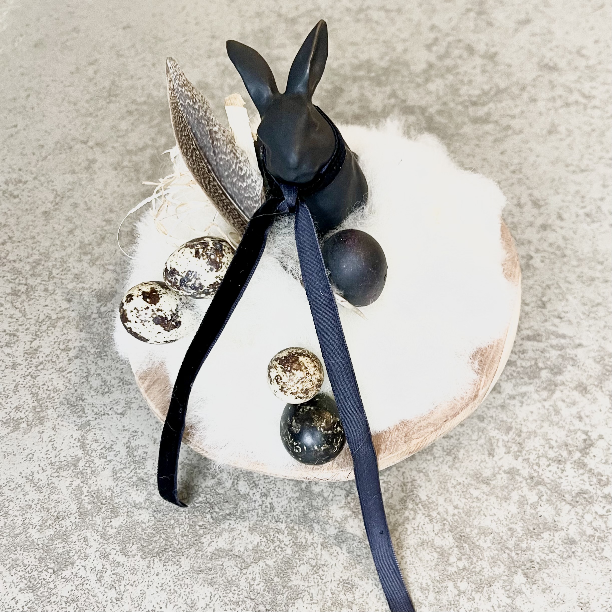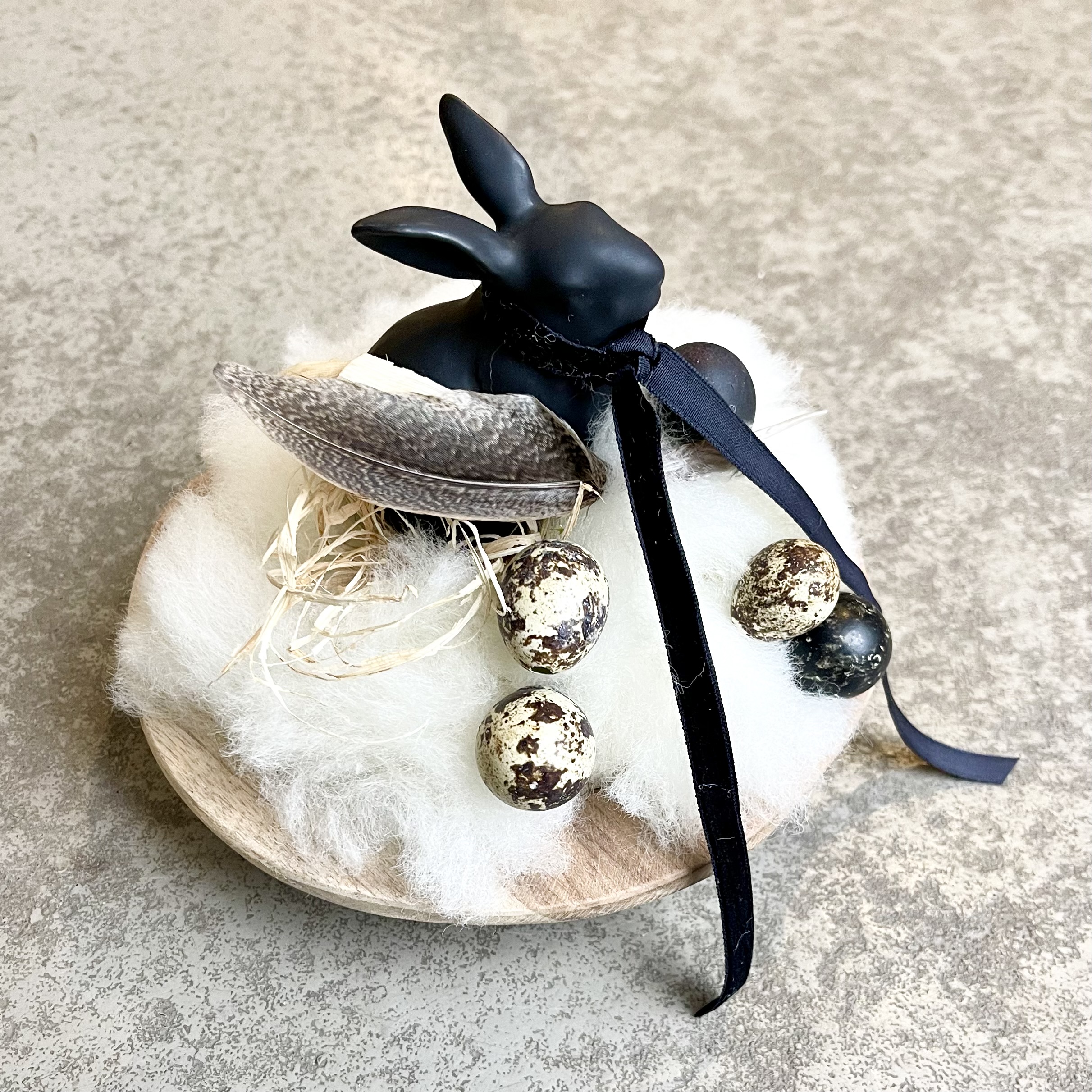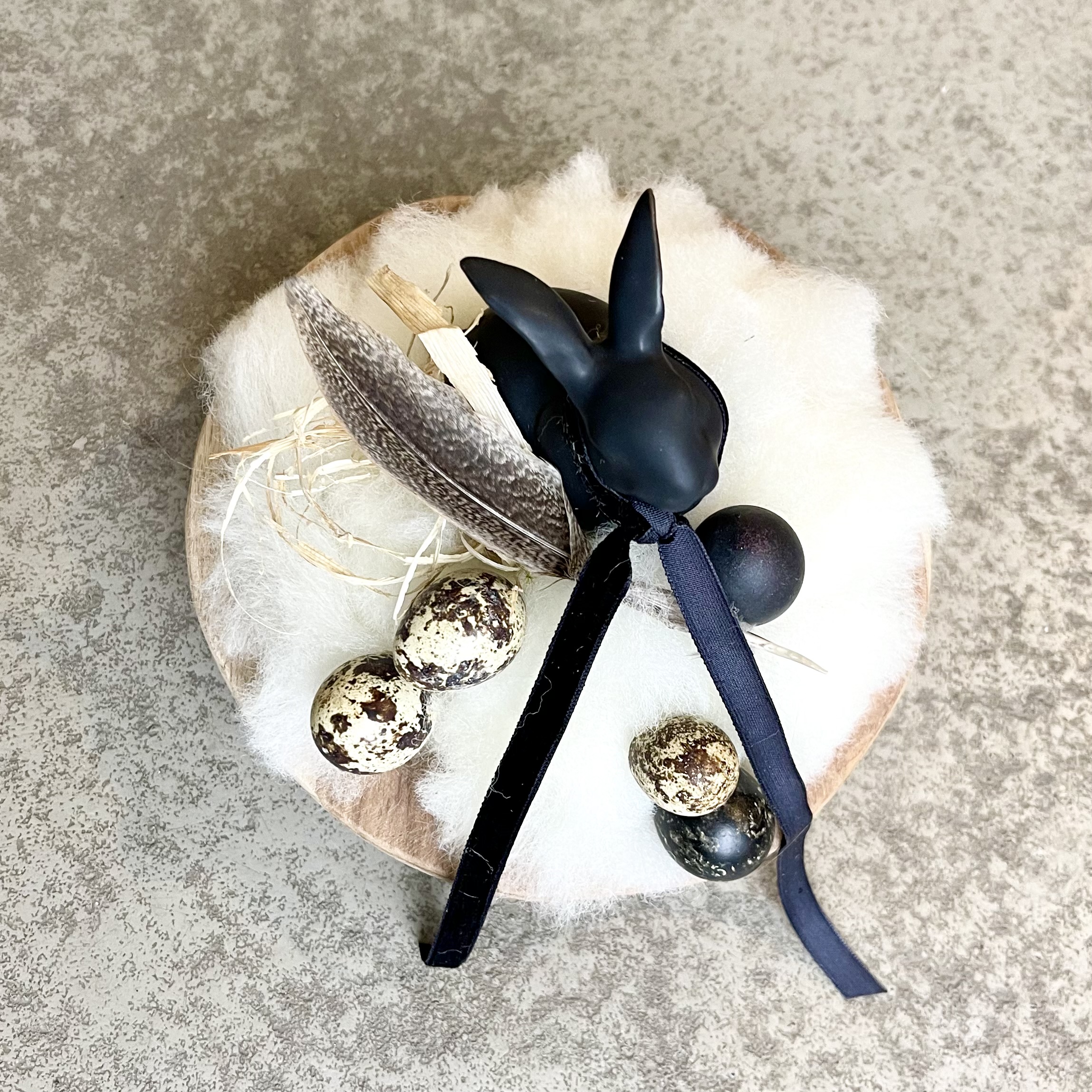 Kleine runde Holzschale, österlich- natürlich gestaltet, ein schwarzer Hase im Lunte-Wolle Nest mit Wachteleiern.