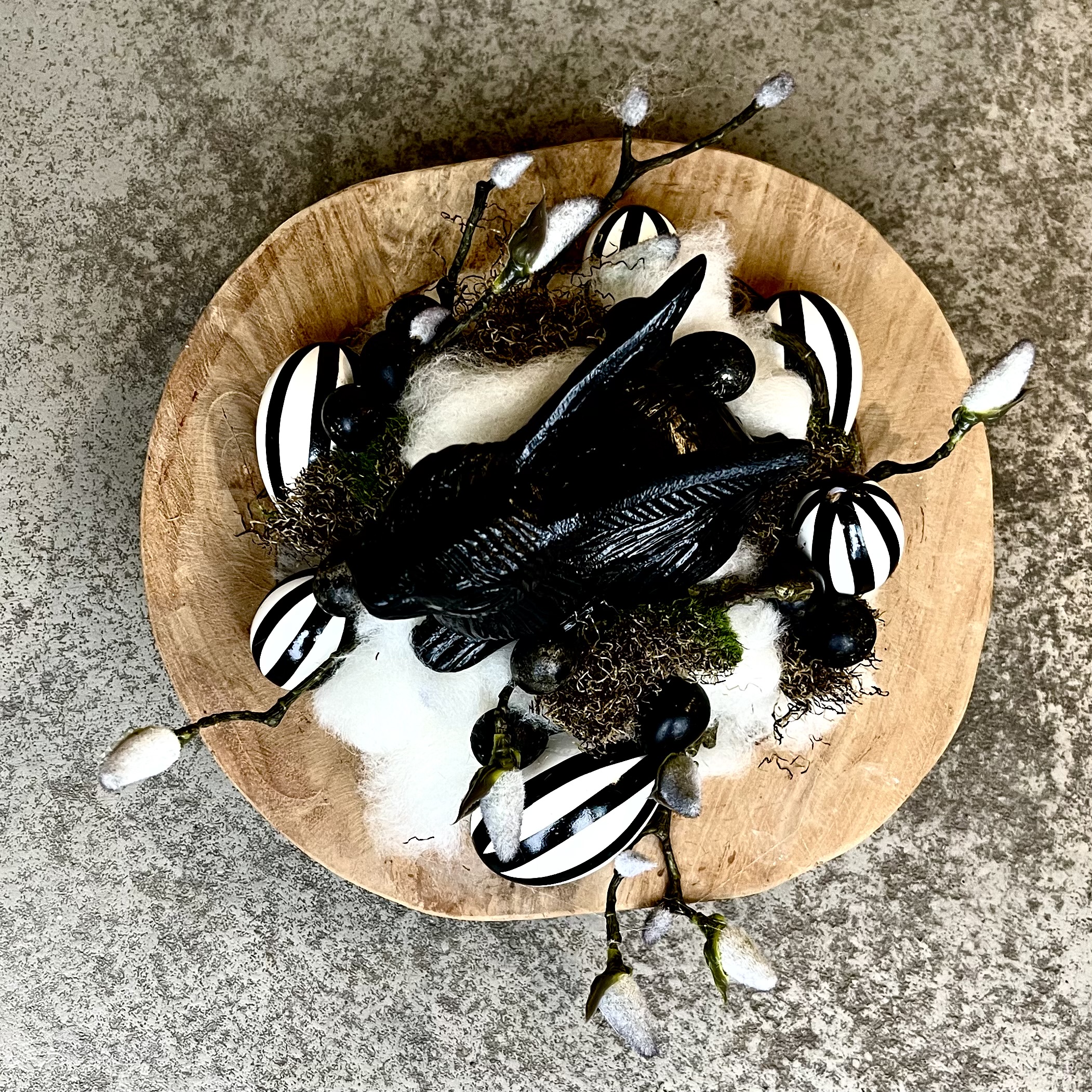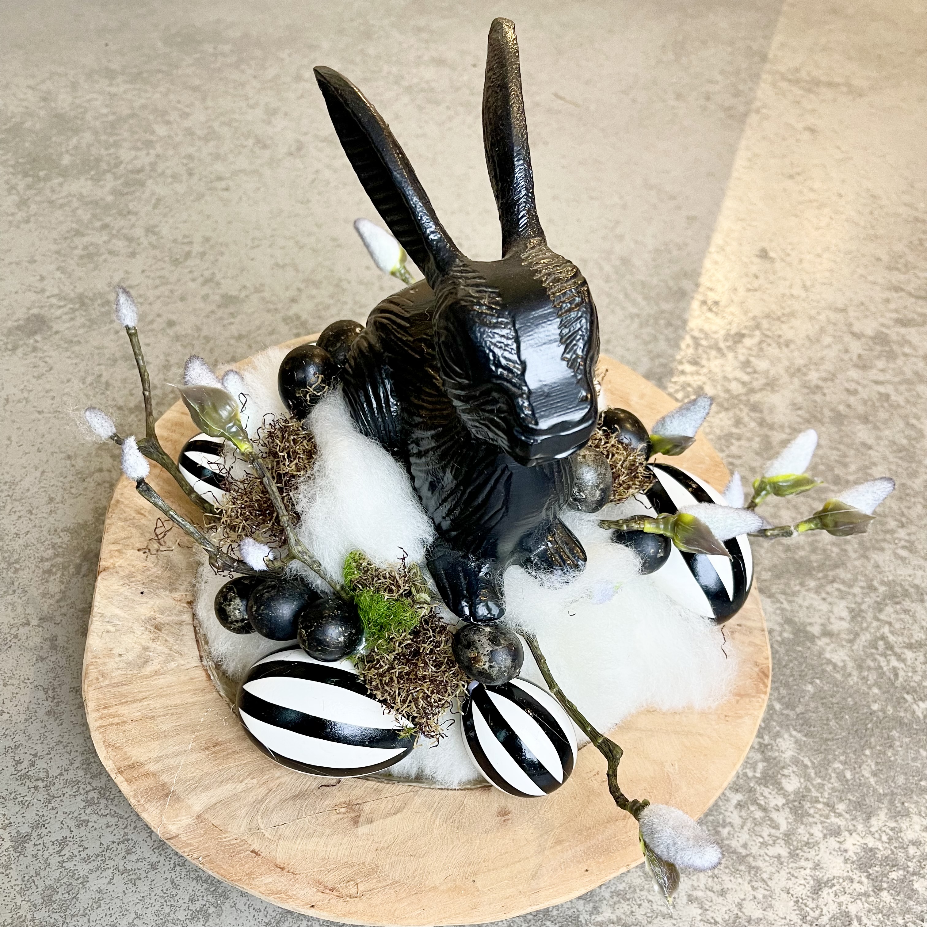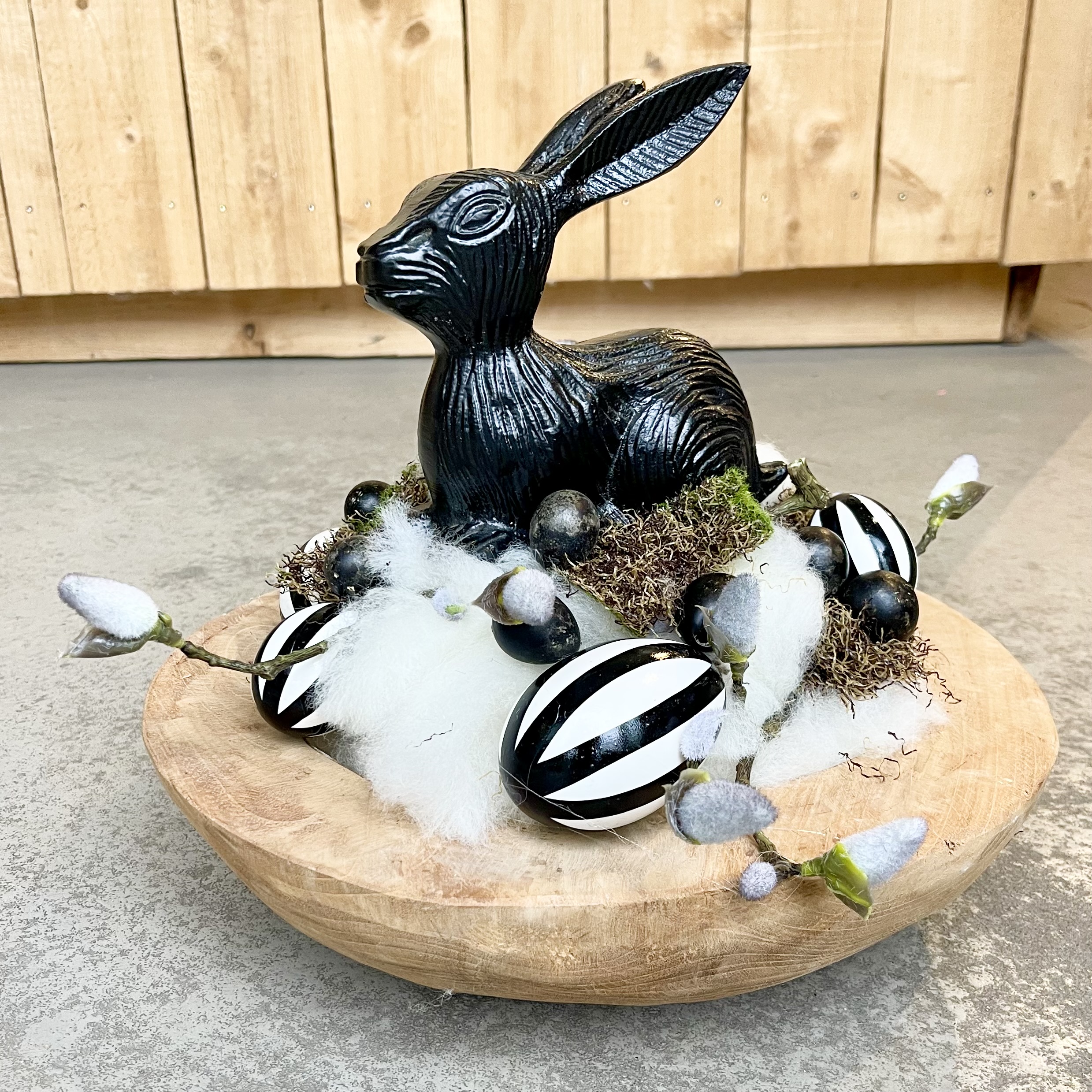 Massive runde Holzschale, österlich- natürlich gestaltet, ein schwarzer Metall- Hase im Lunte-Wolle Nest mit