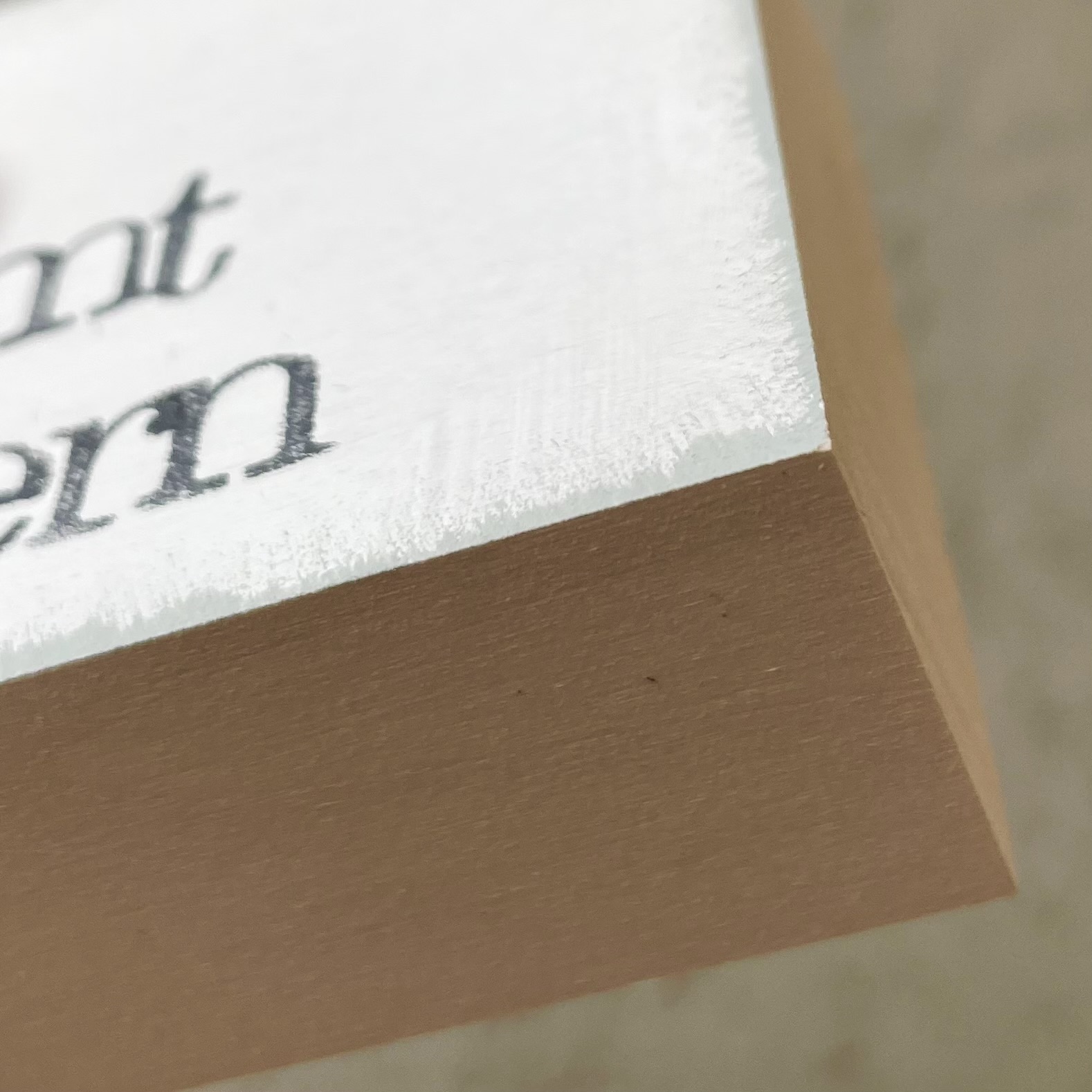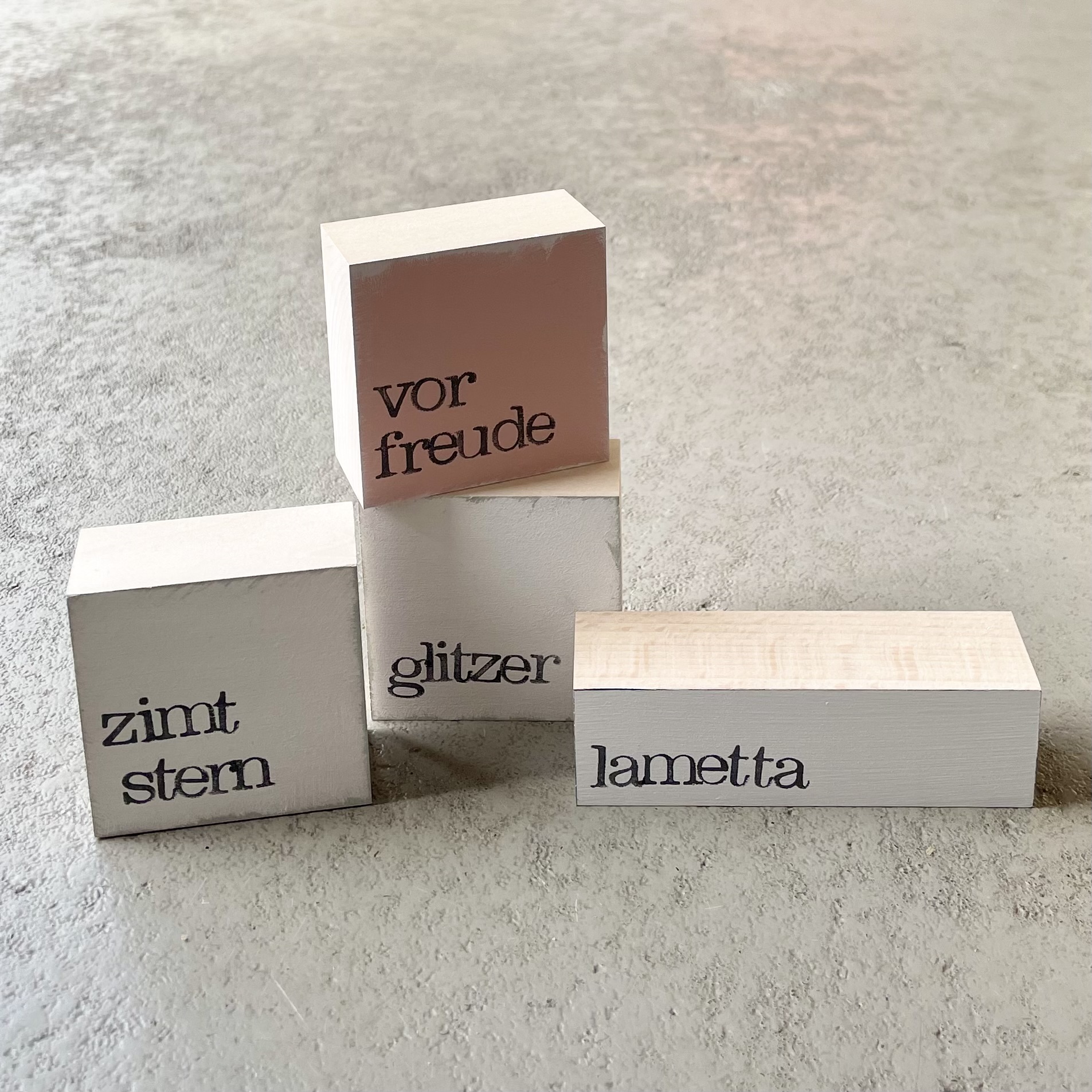 Holzplatte zum Stellen. Jedes Teil ein Unikat, wird in Handarbeit gestempelt.
