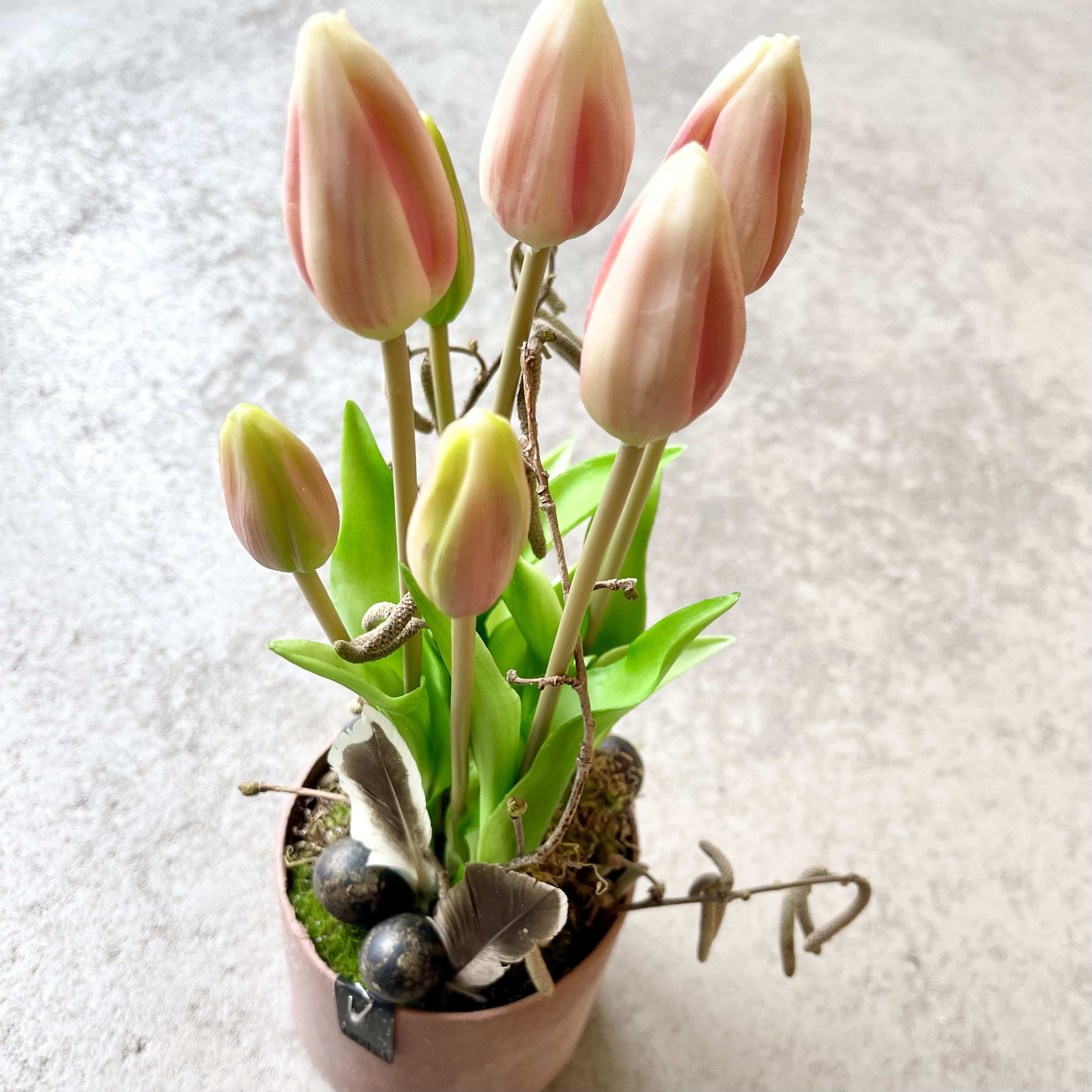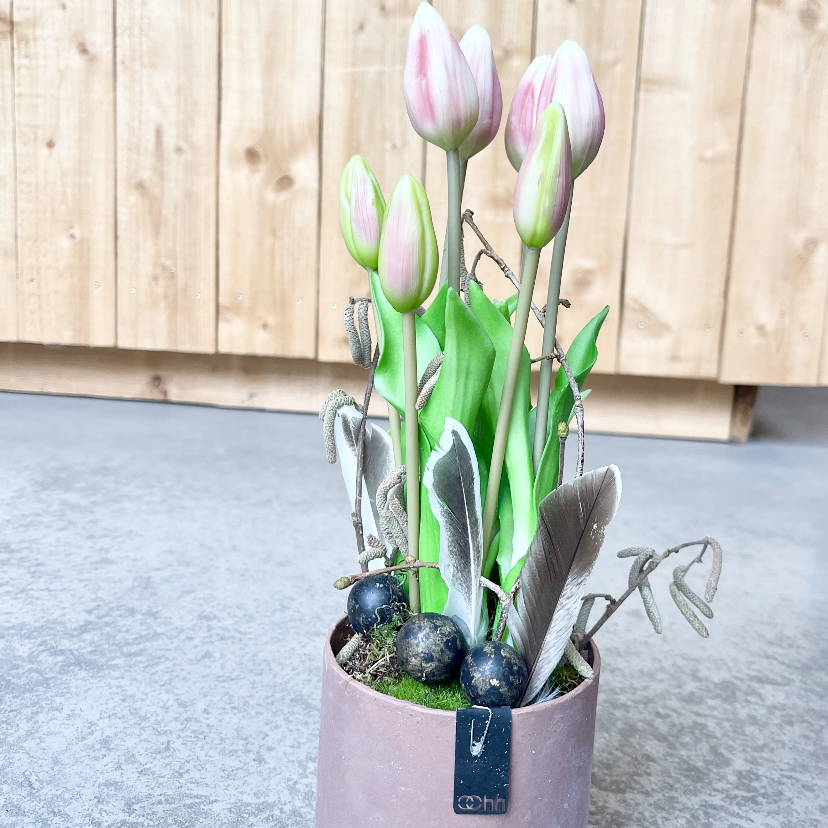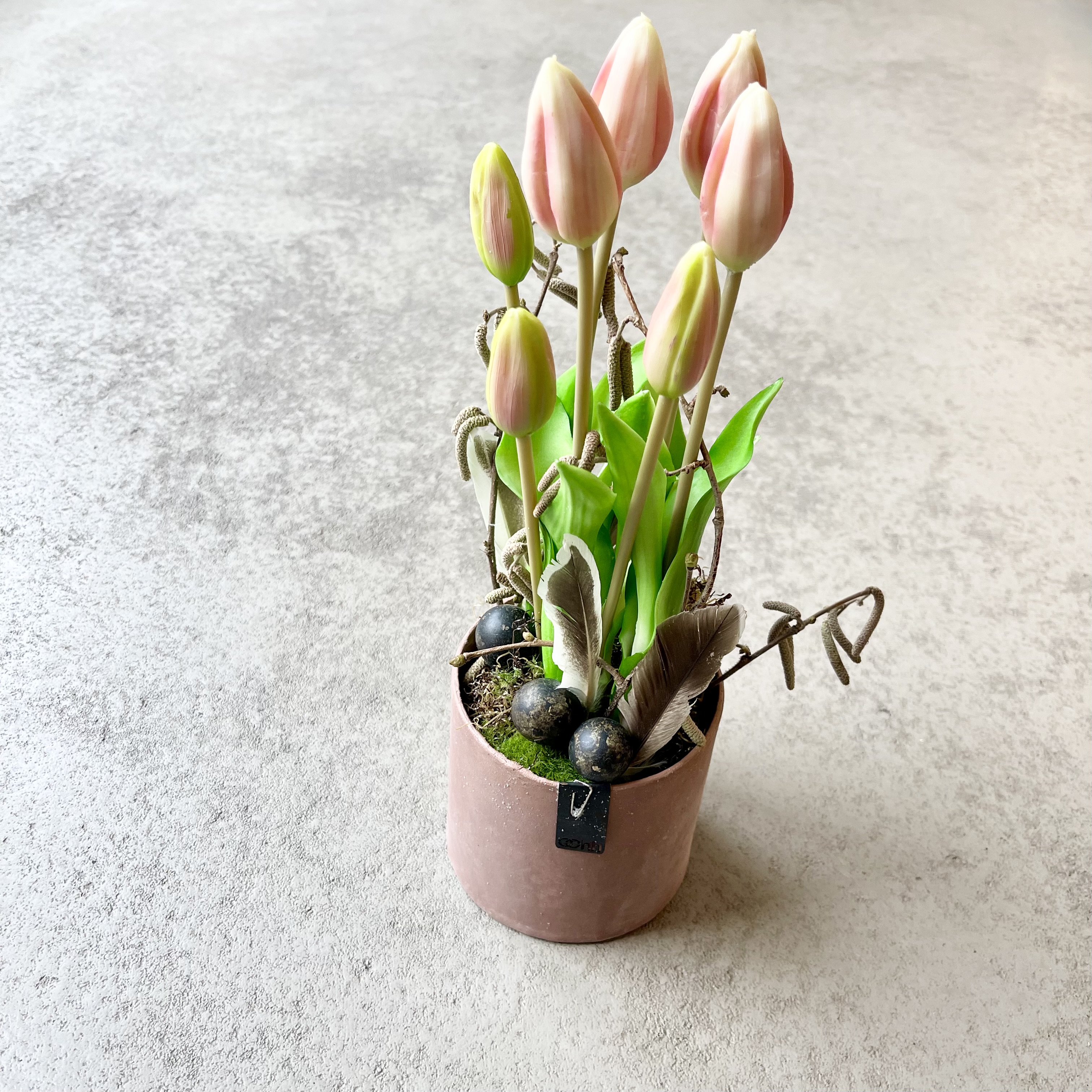 Recycelter Ohh Topf, ausgesteckt mit 7 natürlich wirkenden Tulpen in Altrose.