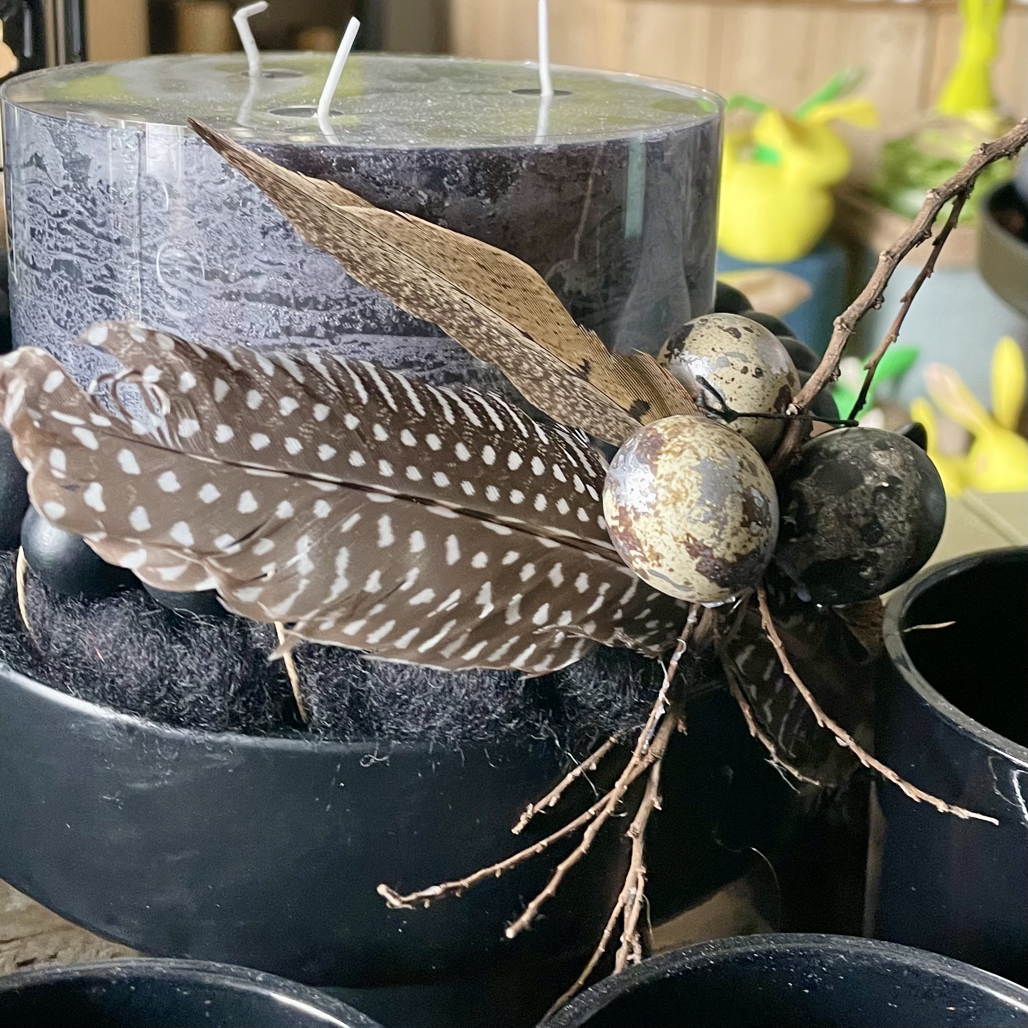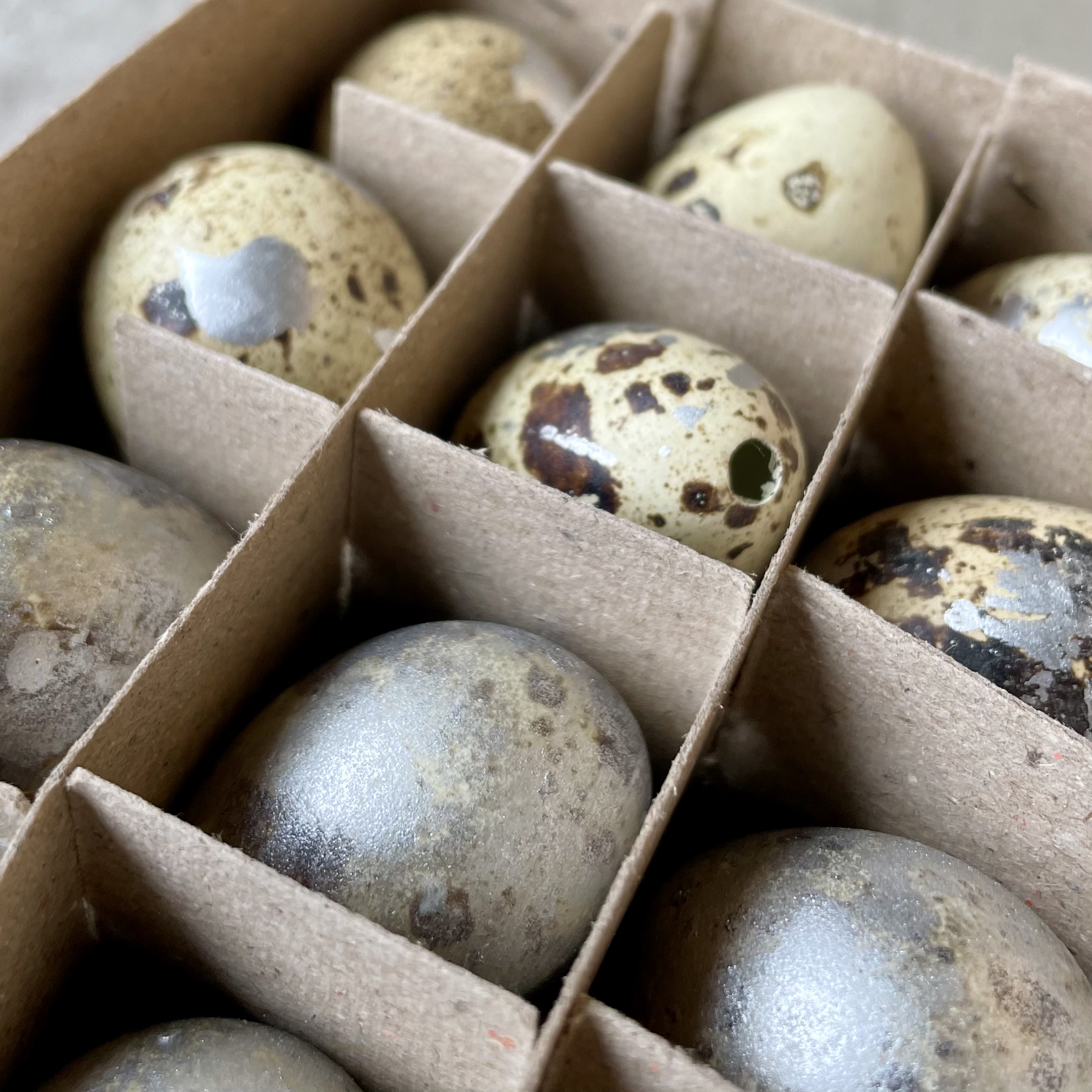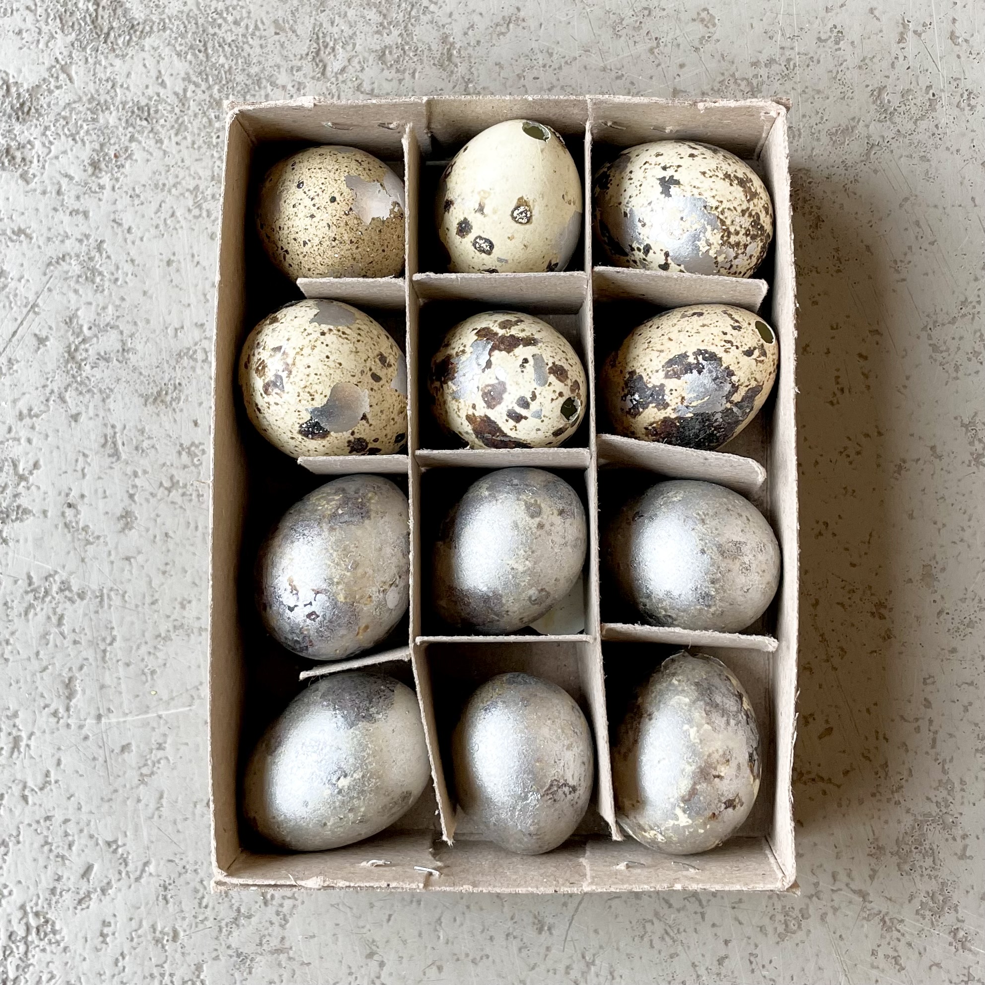 Wachteleier, teils in Natur mit Silberpunkten, teils in Silber lackiert, Mix. 24 Stück.