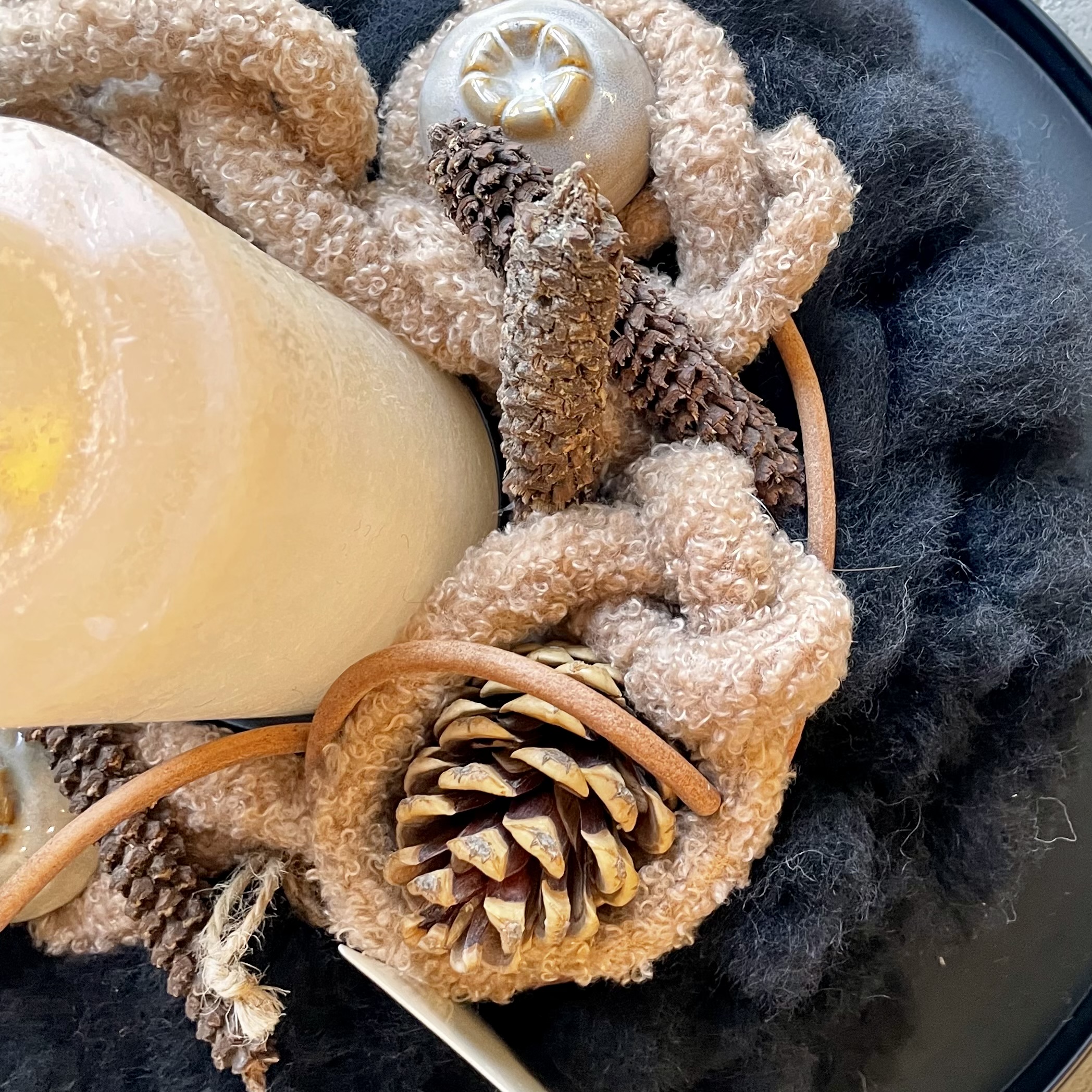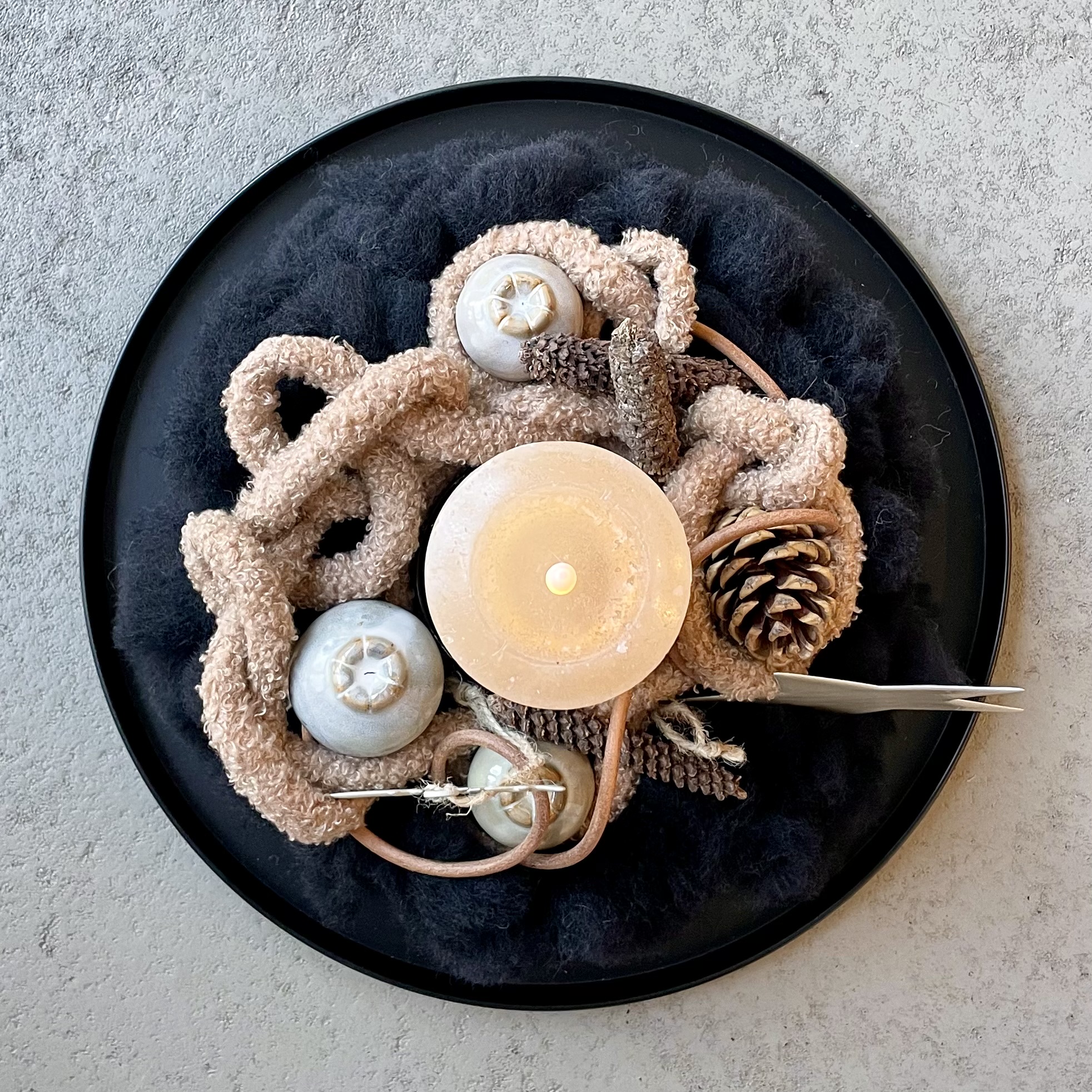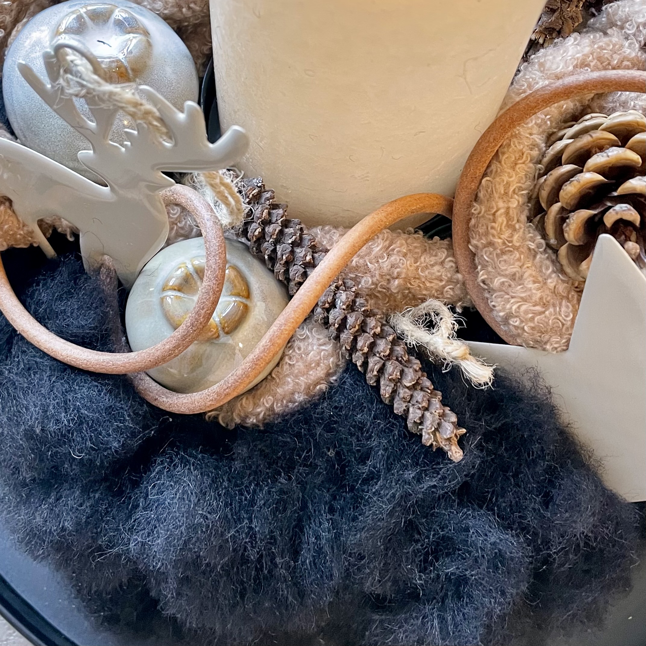 Gemütlich! Metalltablett, Kranz aus Lehnerwolle, ein Kerzensteller aus Metall, eine LED-Kerze mit Timerfunktion 6h, ein Hirsch, ein Stern, drei Keramik-Mohnkapseln, Teddyseil, Lederband und Zapfen gehören zu dieser Gestaltung.