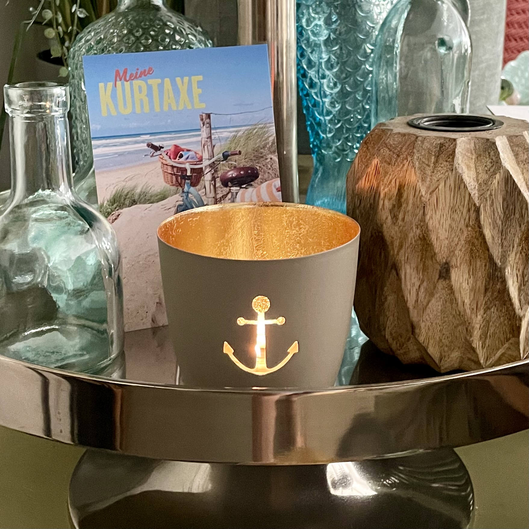 Sommerliches Windlicht für Nordlichter und Liebhaber der See. Mit einem Teelicht bestückt, erstrahlt das Licht durch die goldene Innenfarbe warm und gemütlich.