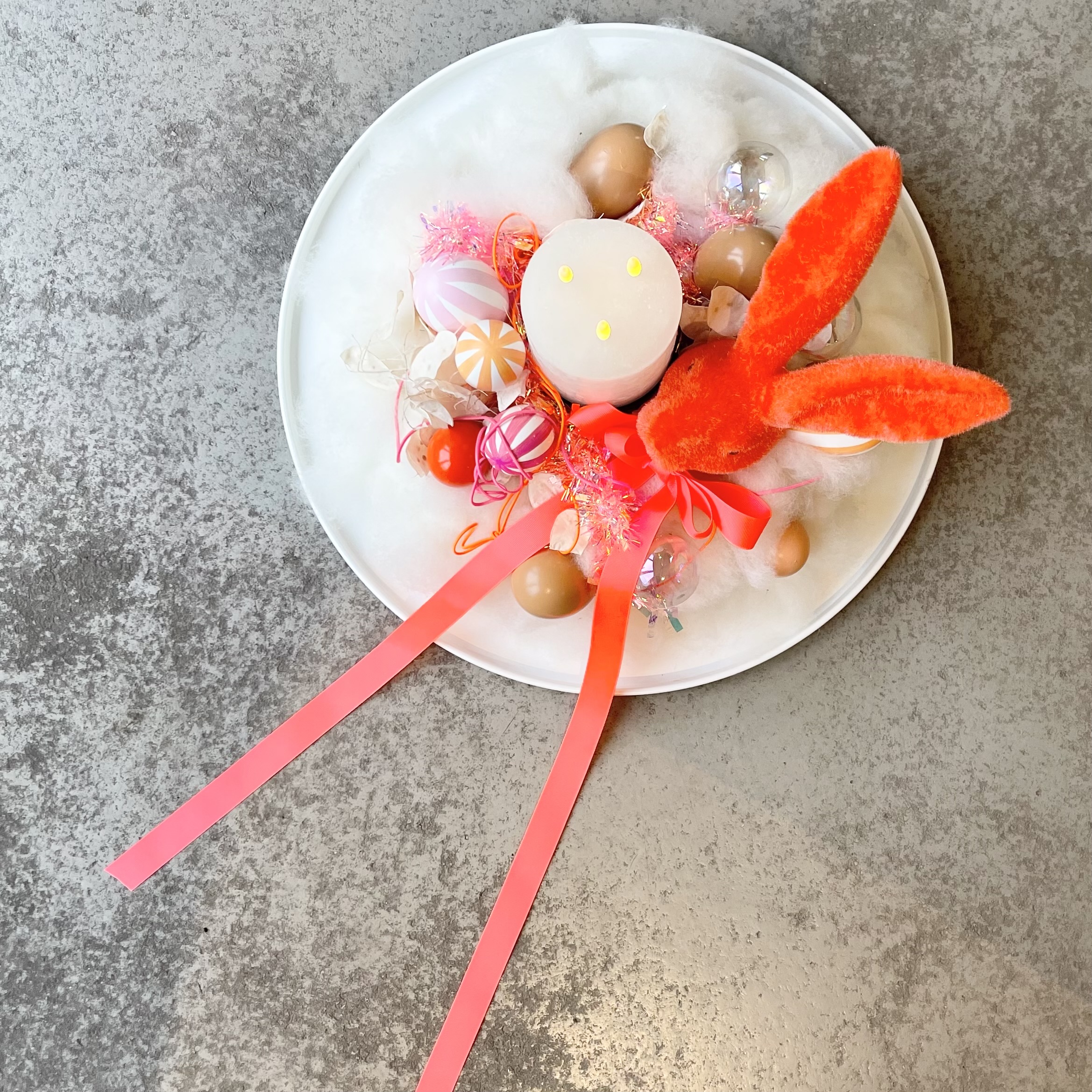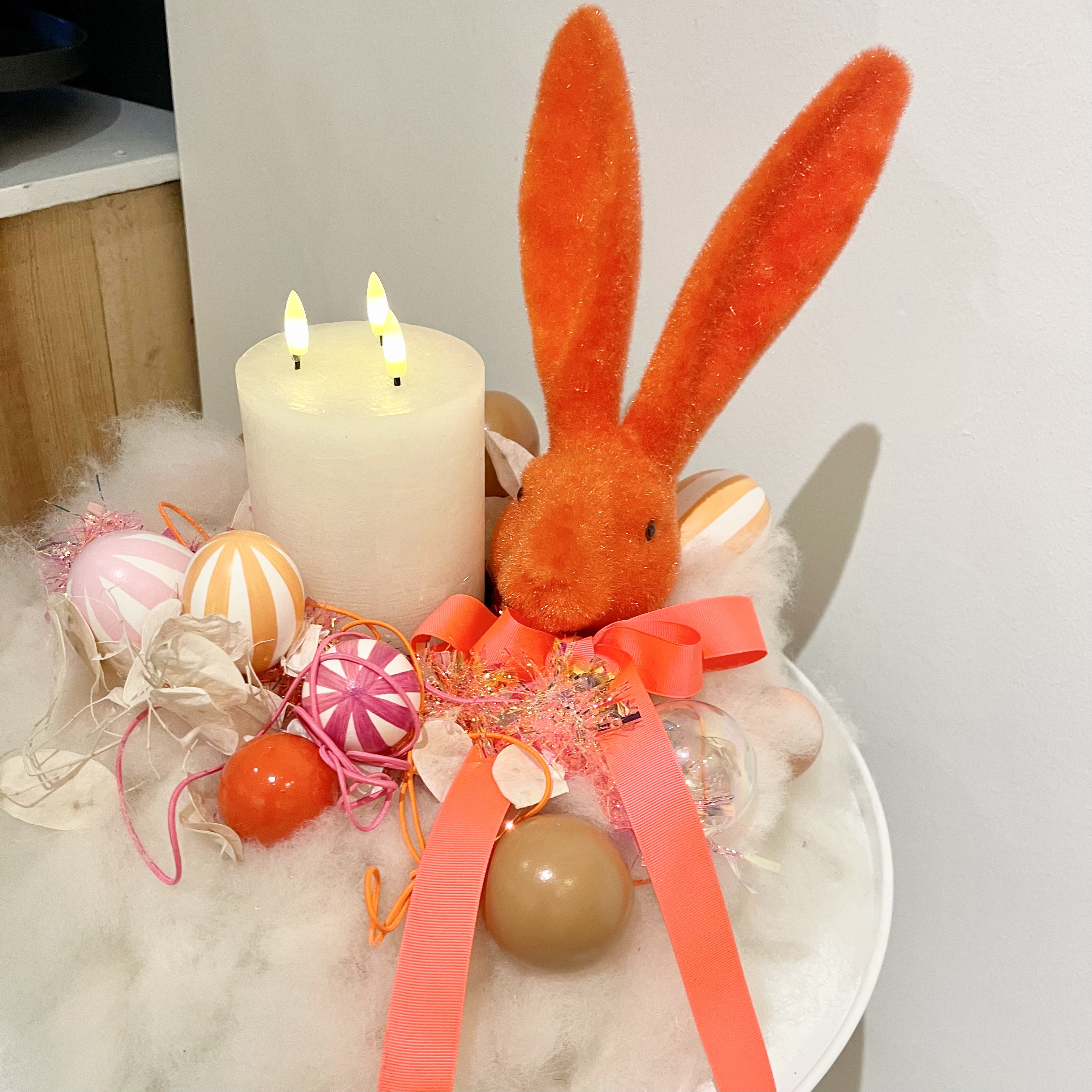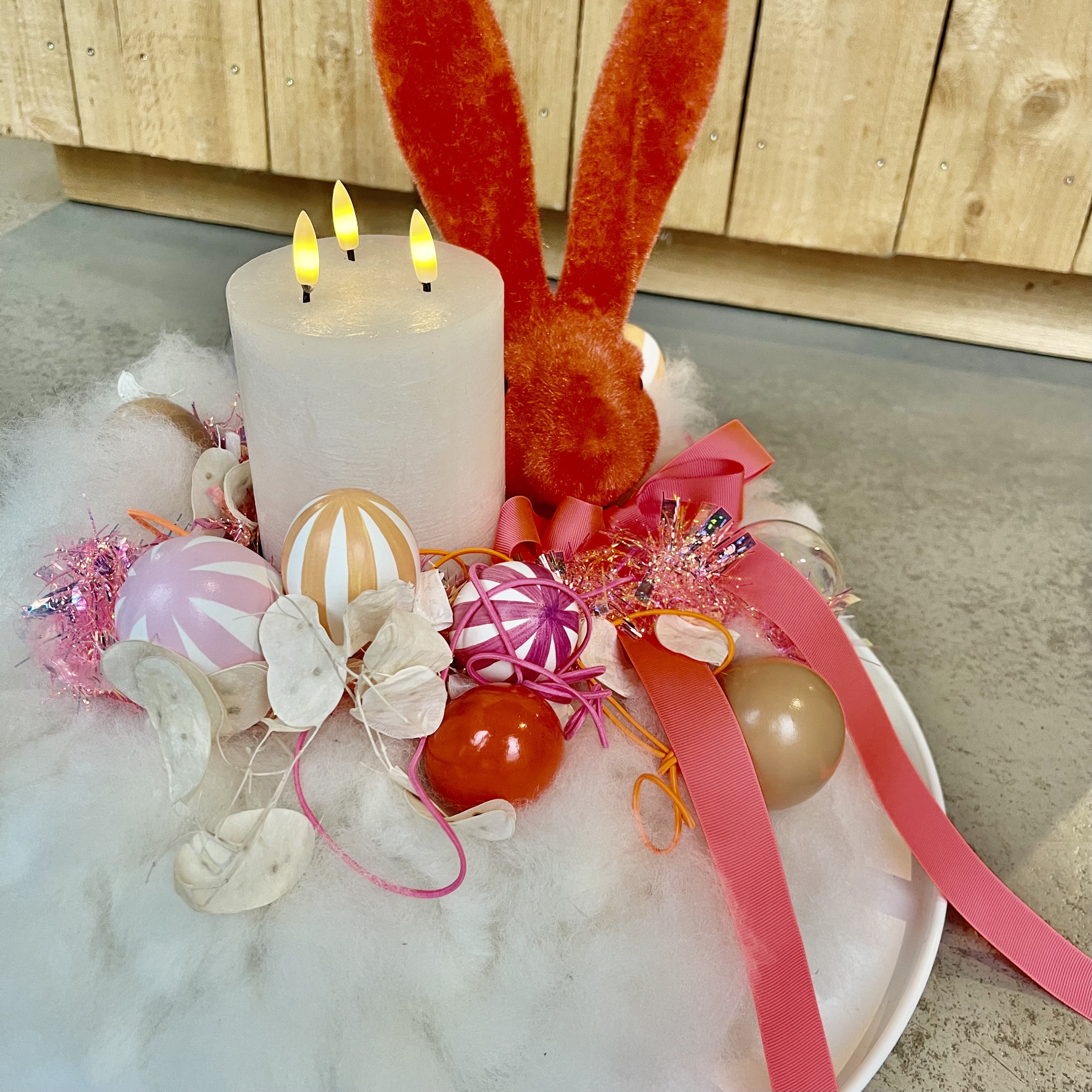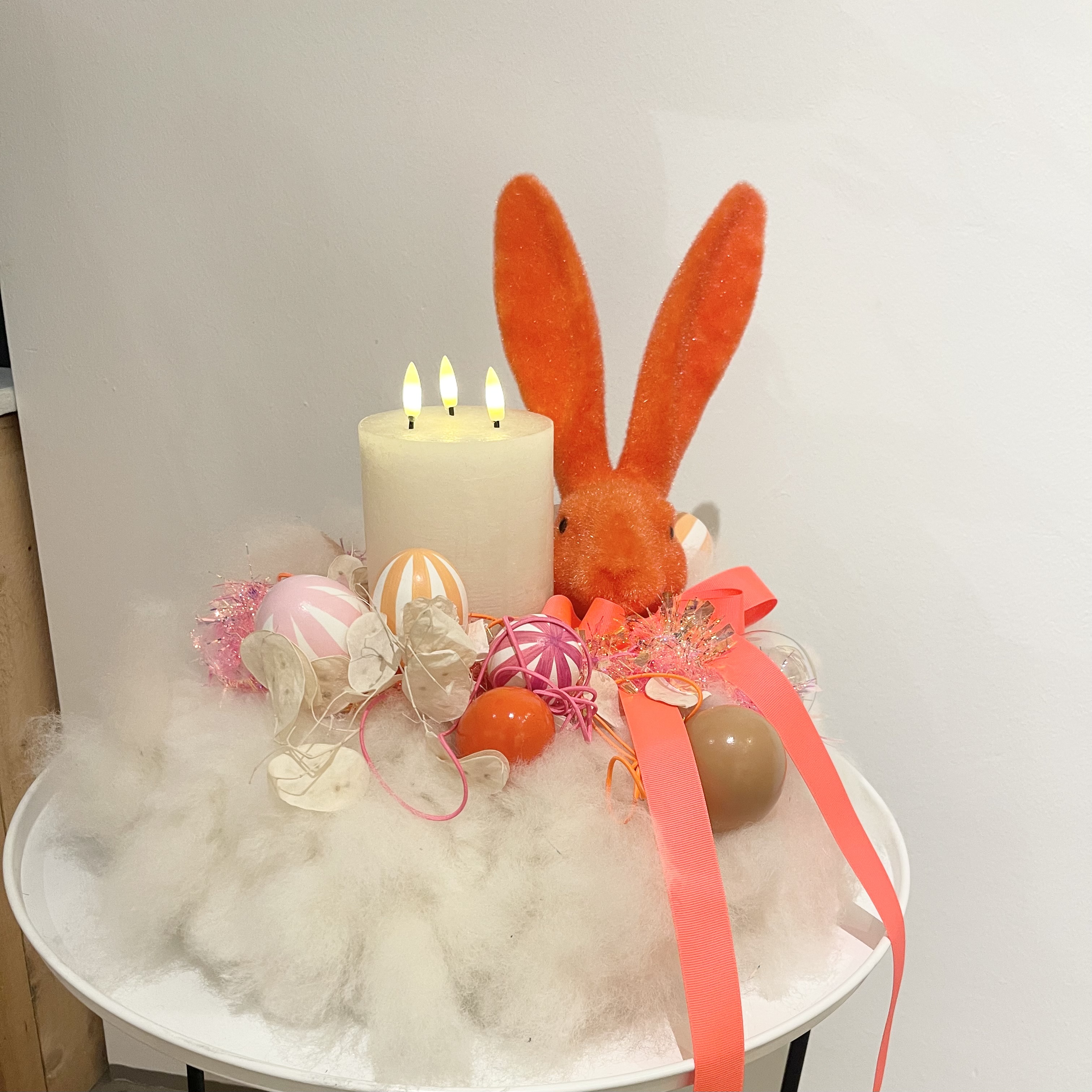 Kranz aus Lunte-Wolle in Weiß, Hase Tasko in orange rot, Eier in verschiedenen Größen, Lunaria, Girlande aus Kunststoff in Pink, 3 Docht LED-Kerze mit Timerfunktion in Weiß auf Metalltablett D50cm in Weiß.