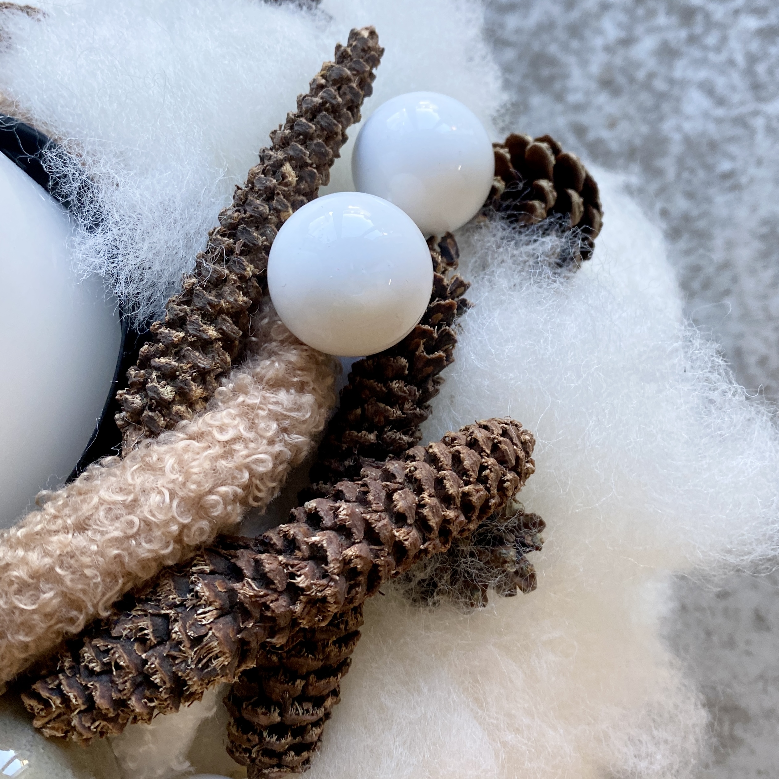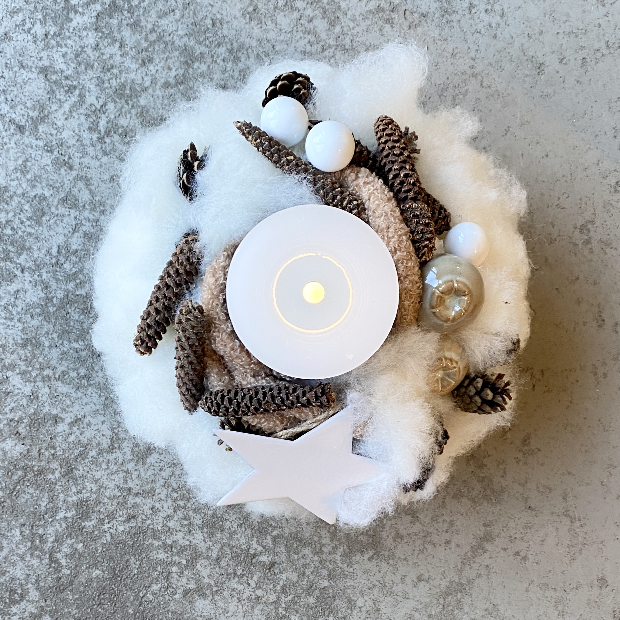 Gesteck aus Lunte-Wolle in Weiß, Stern aus Metall in Weiß, LED Kerze in Weiß auf Metallfassung, verschiedene Zapfen, Mohnkapseln in Sand und kleinen Glaskugeln in Weiß.