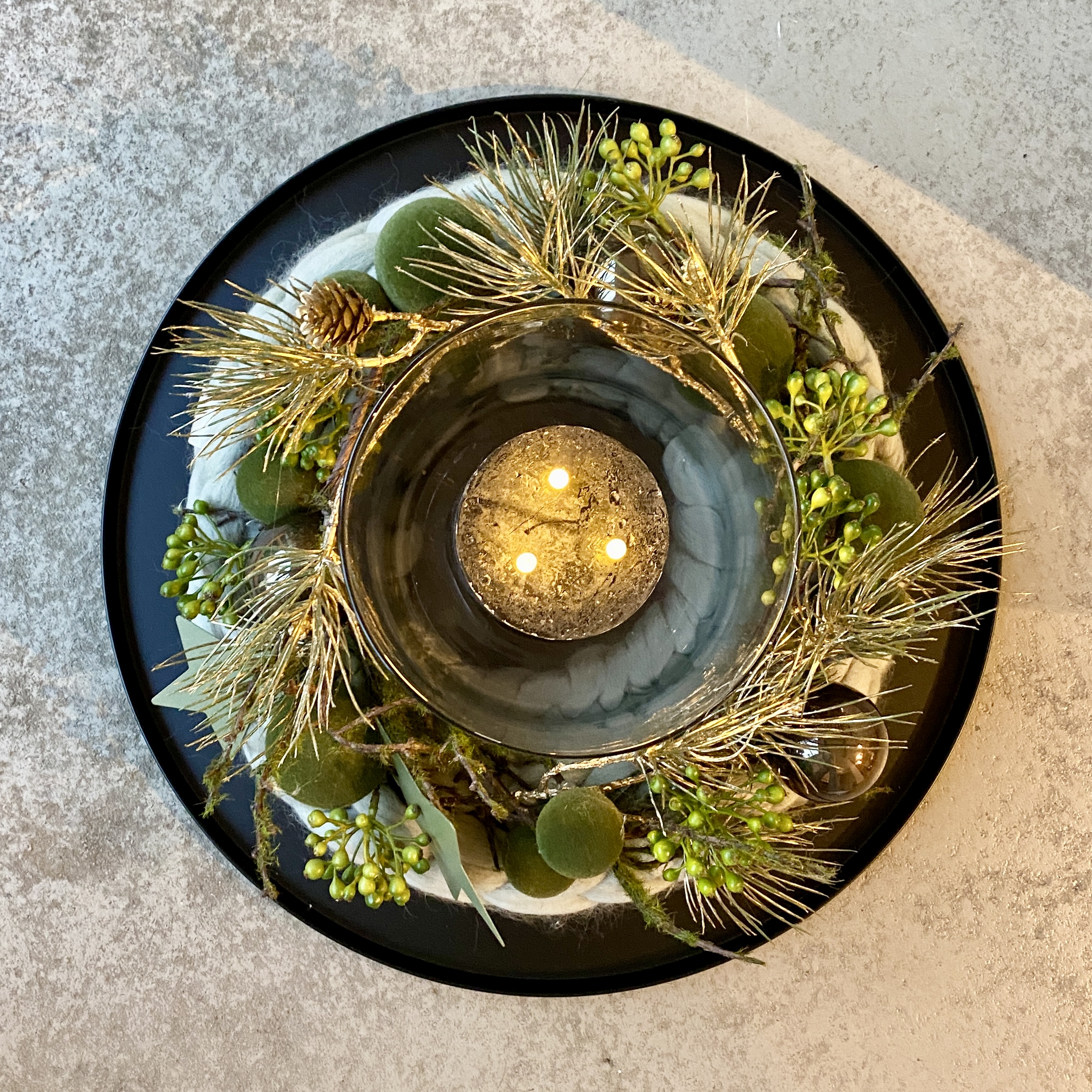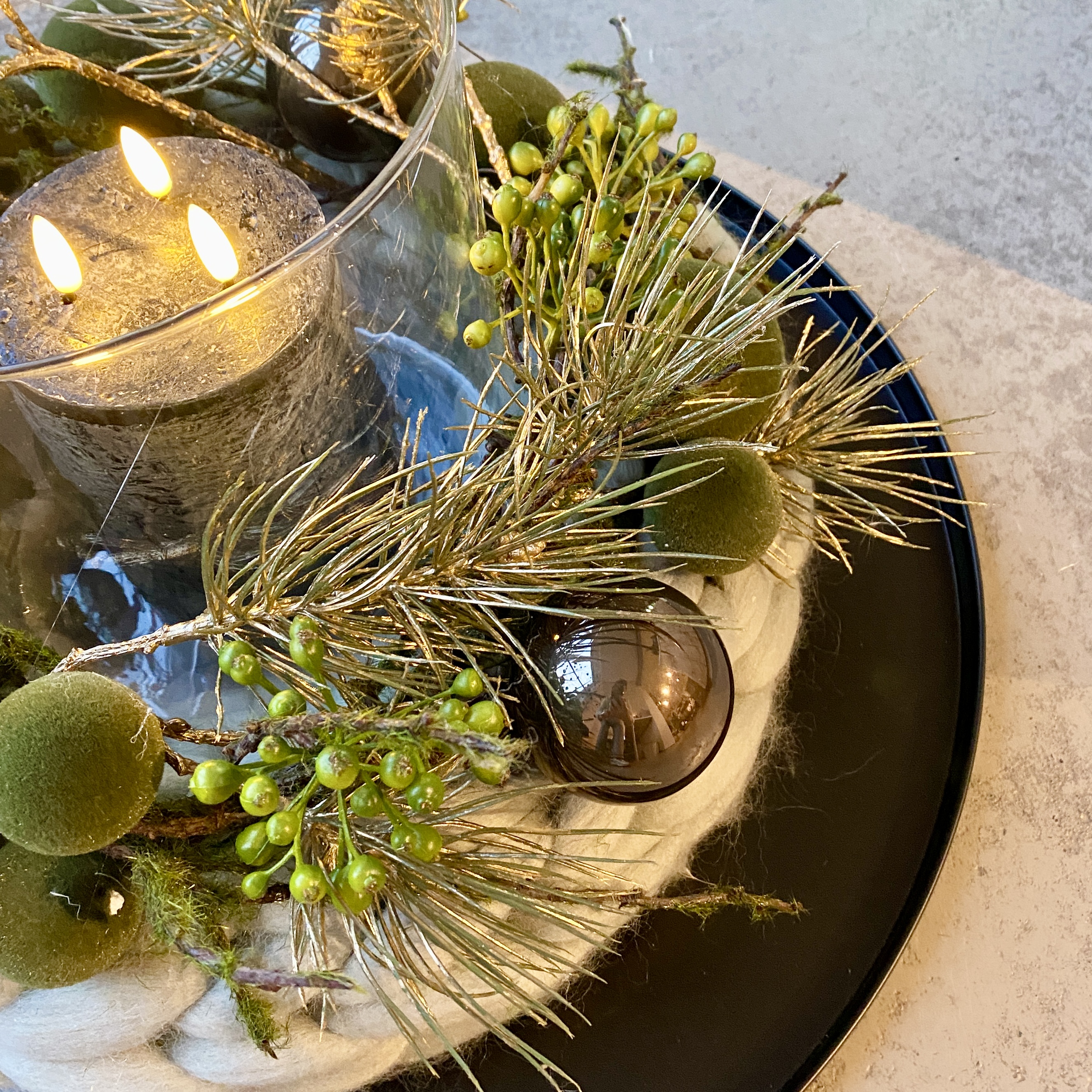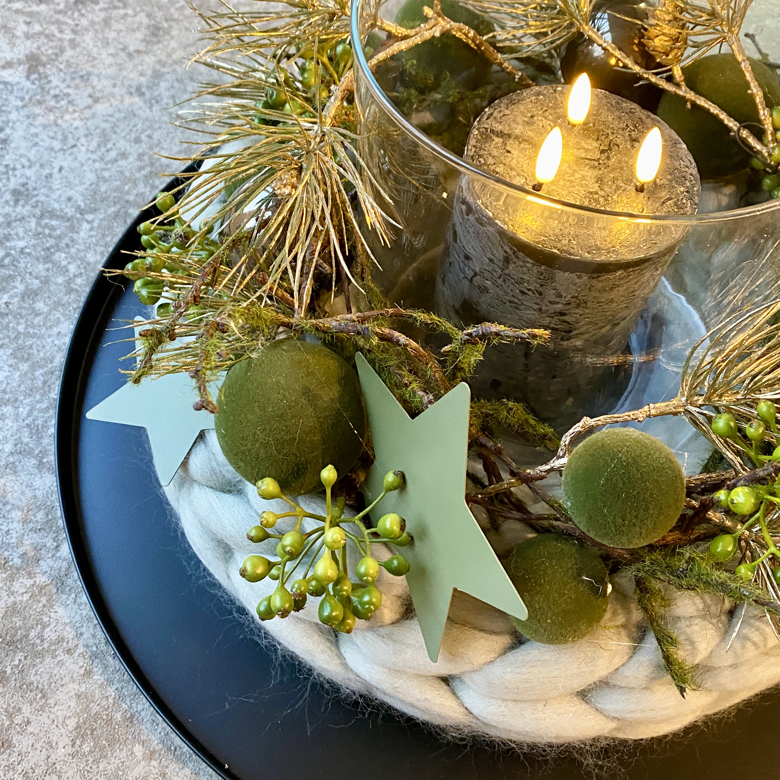 Kranz aus Lunte gestrickt mit Tasko-Kugeln in Grün, Glaskugeln in Dunkelgrün, Kiefernzweige in Gold, 2 Metall-Sternen in Salbei, 3Docht LED-Kerze in Schwarz im Glas auf Metall-Tablett in Schwarz.