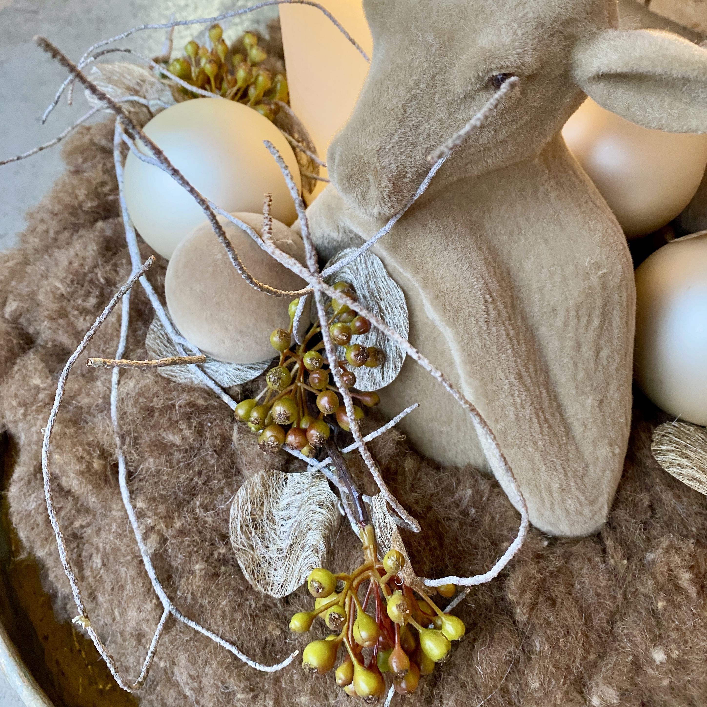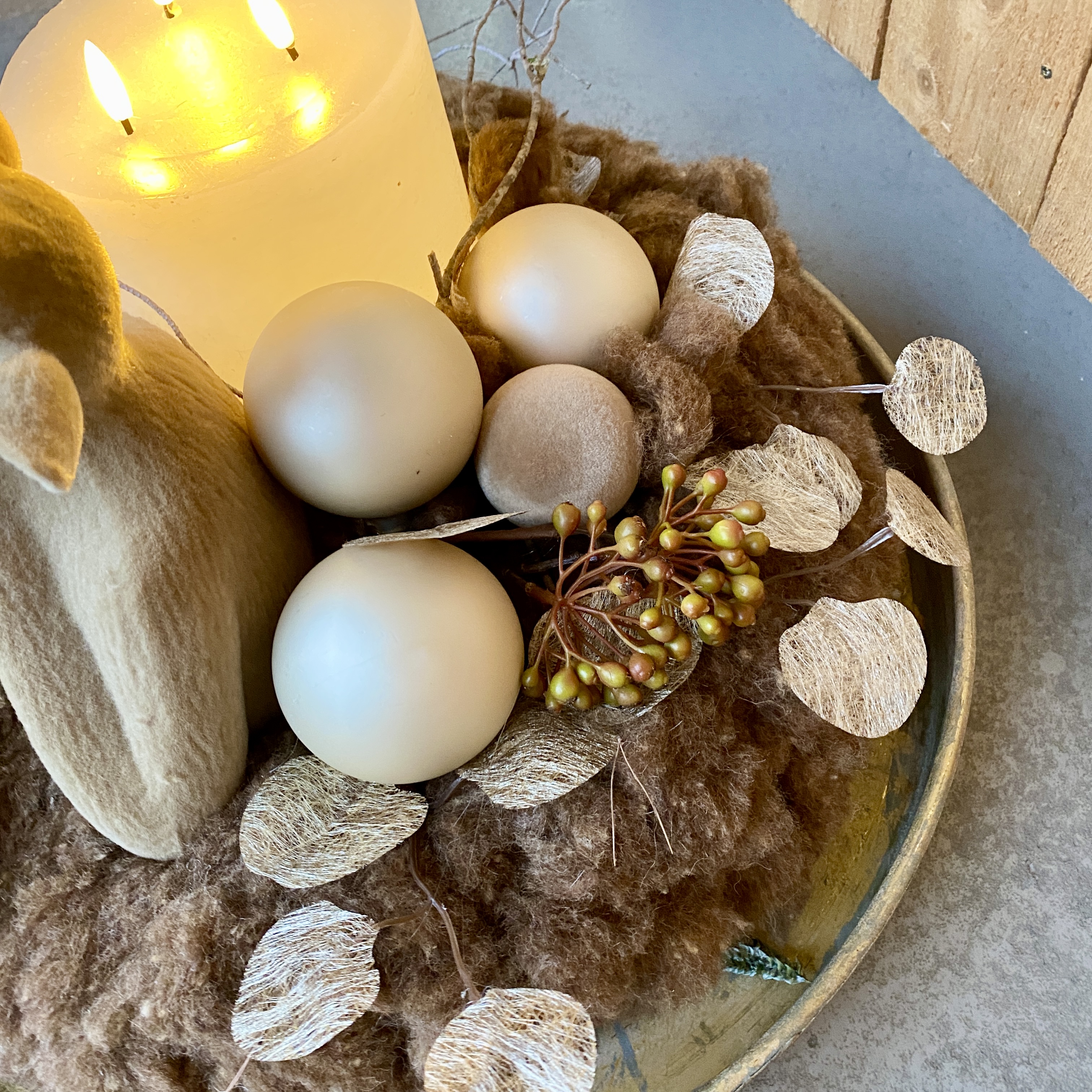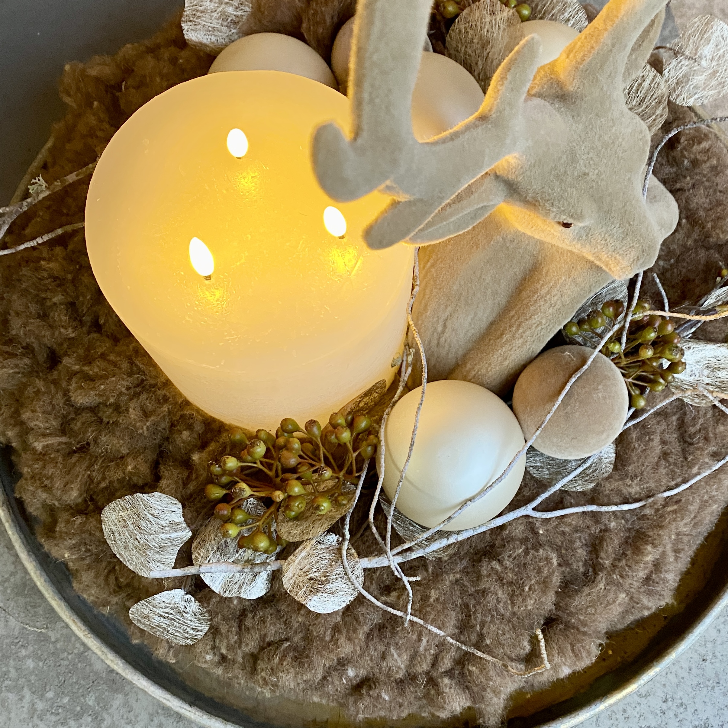 Großer Kranz aus Lunte-Wolle in Braun, mit Tasko Hirschkopf in Taupe, 3Docht LED-Kerze in Creme, Lunaria in Krokant, iberische Kiefer, künstliche Efeufruchtstände und Kugeln Tasko und Glas in Creme.